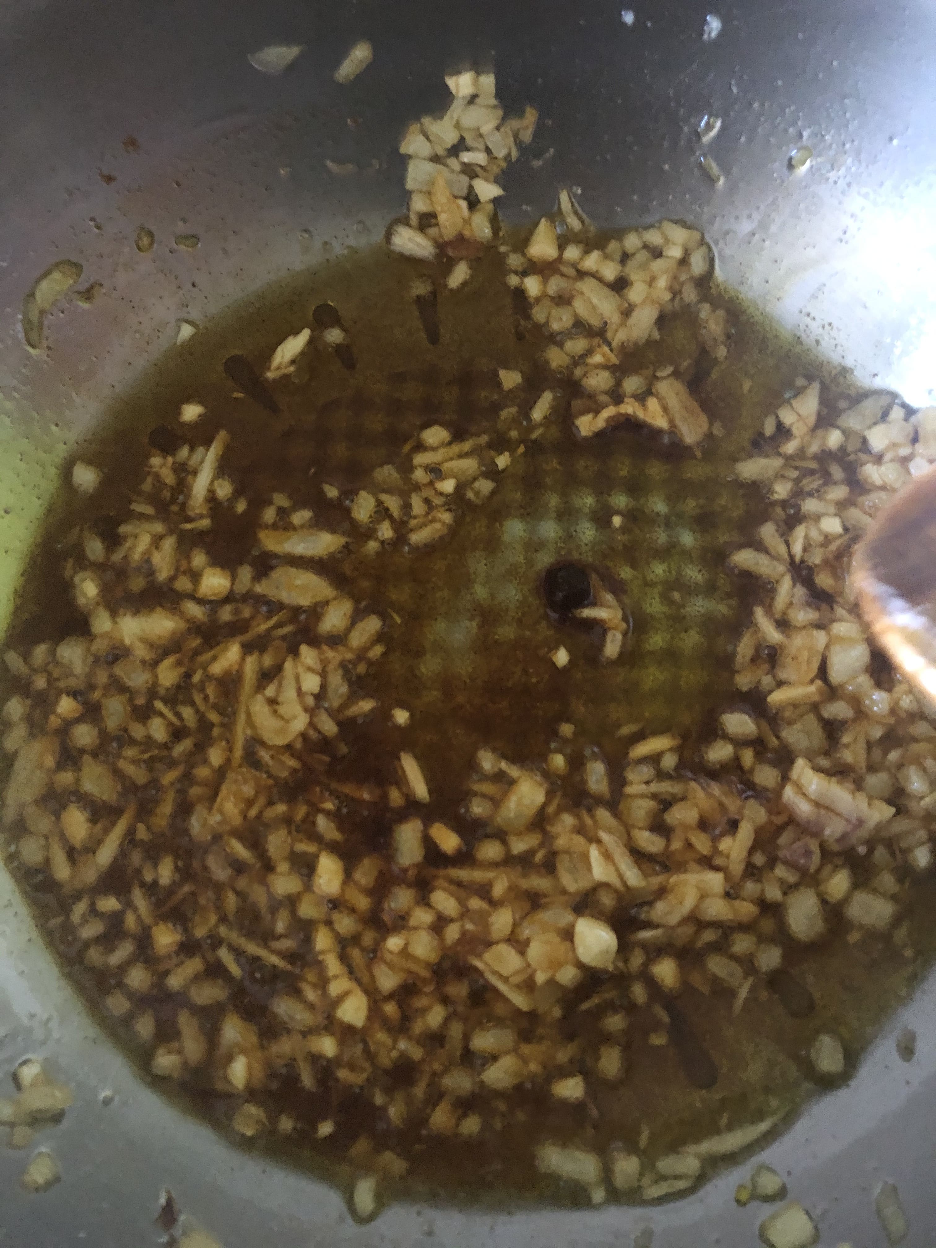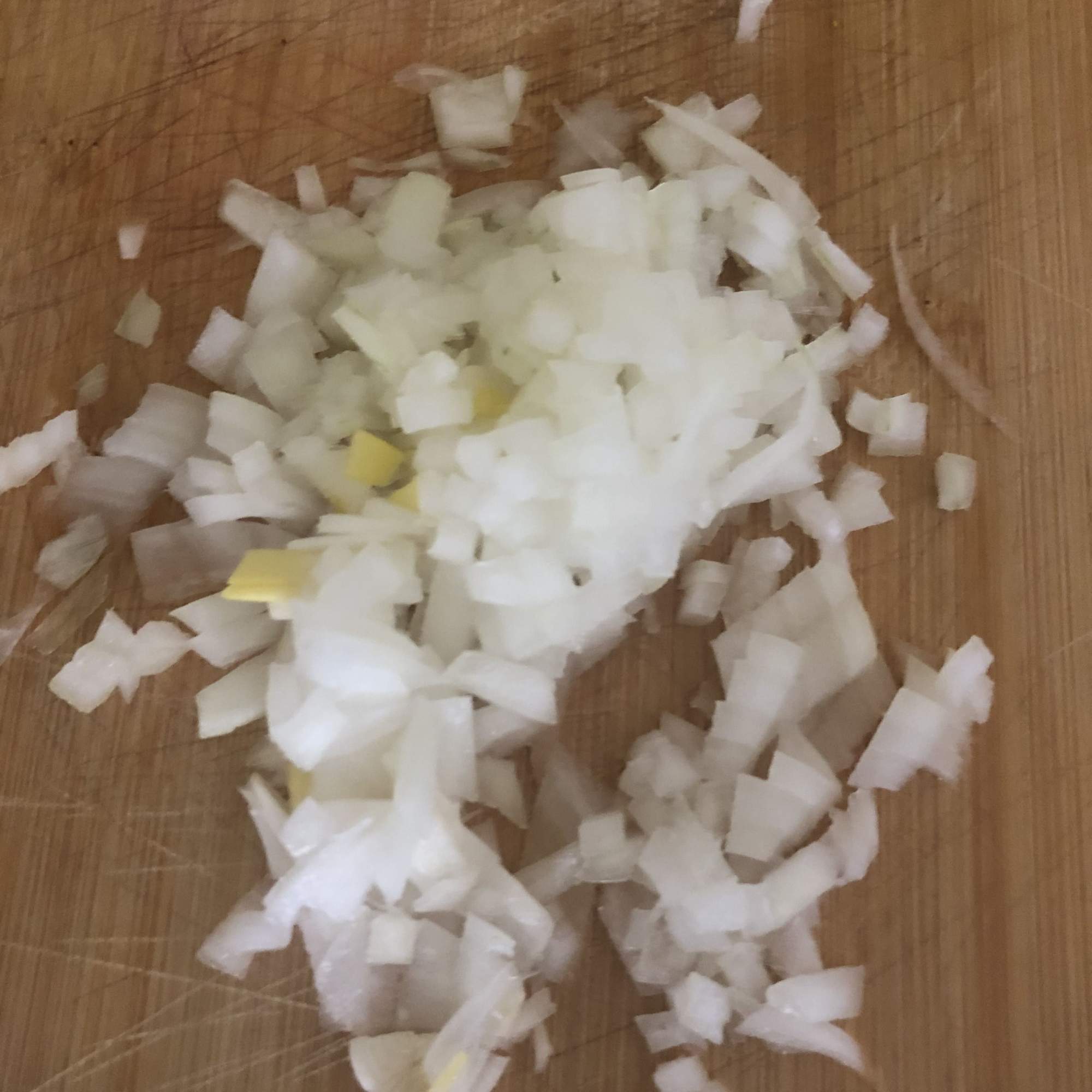 Pela y corta en dados medianos. Pica la cebolla y el ajo en brunoise. Pocha la cebolla en una sartén con un poco de aceite y cuando esté transparente añade el ajo. Cocina un minuto sin que se dore demasiado.