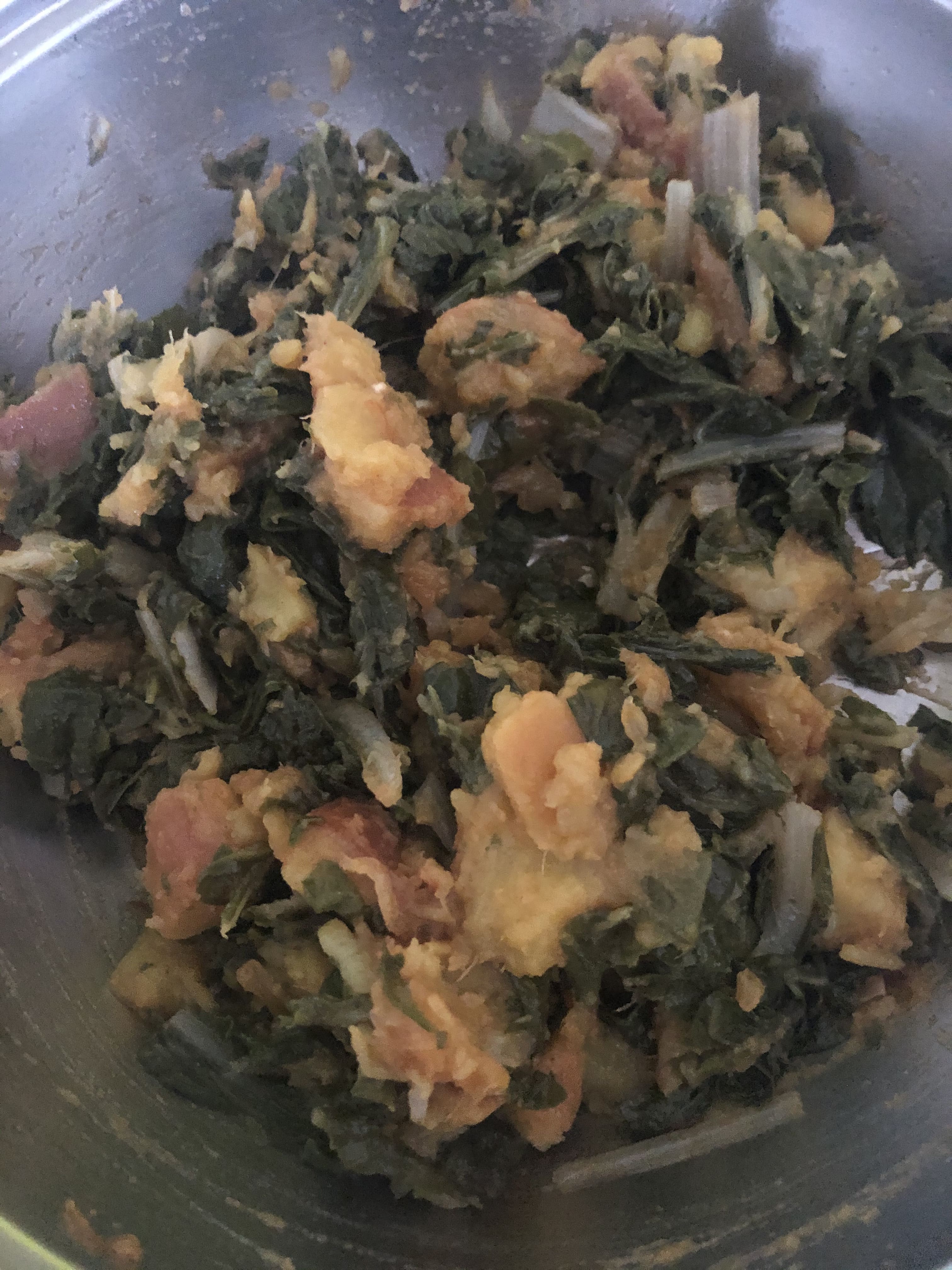 Añade el pimentón y remueve todo bien. Añade la batata y mezcla. Después de un par de minutos agrega las acelgas y mezcla todo bien.