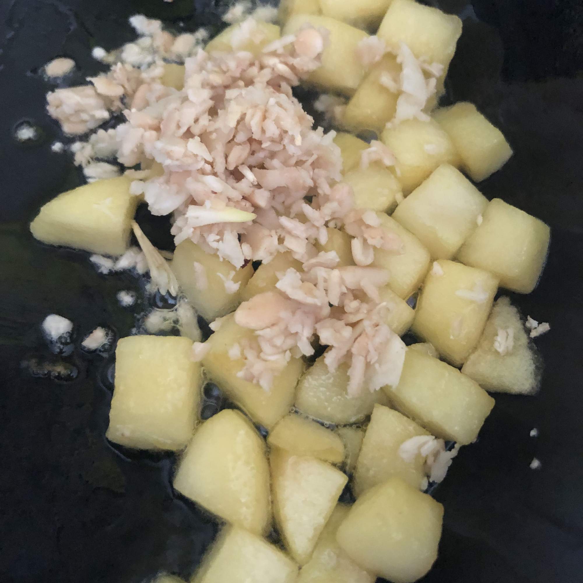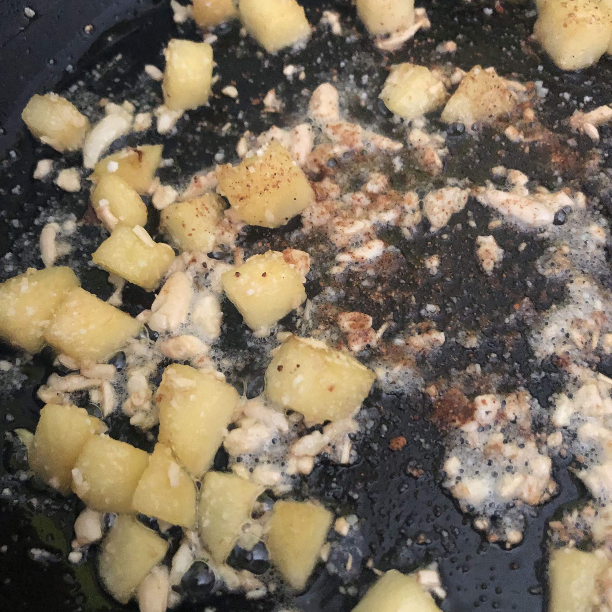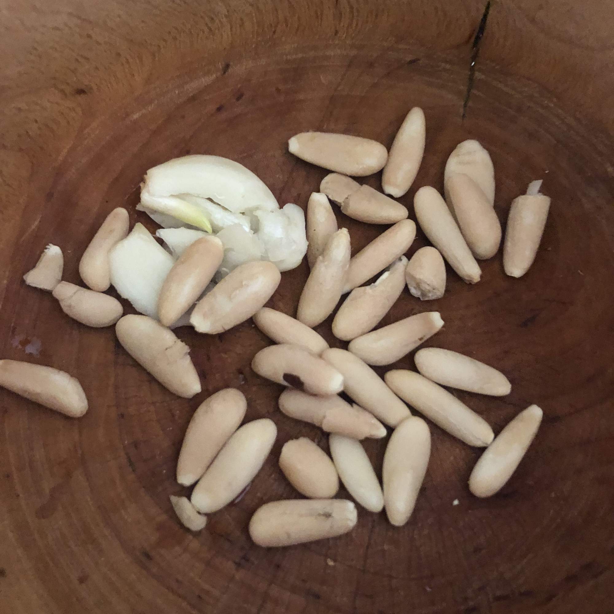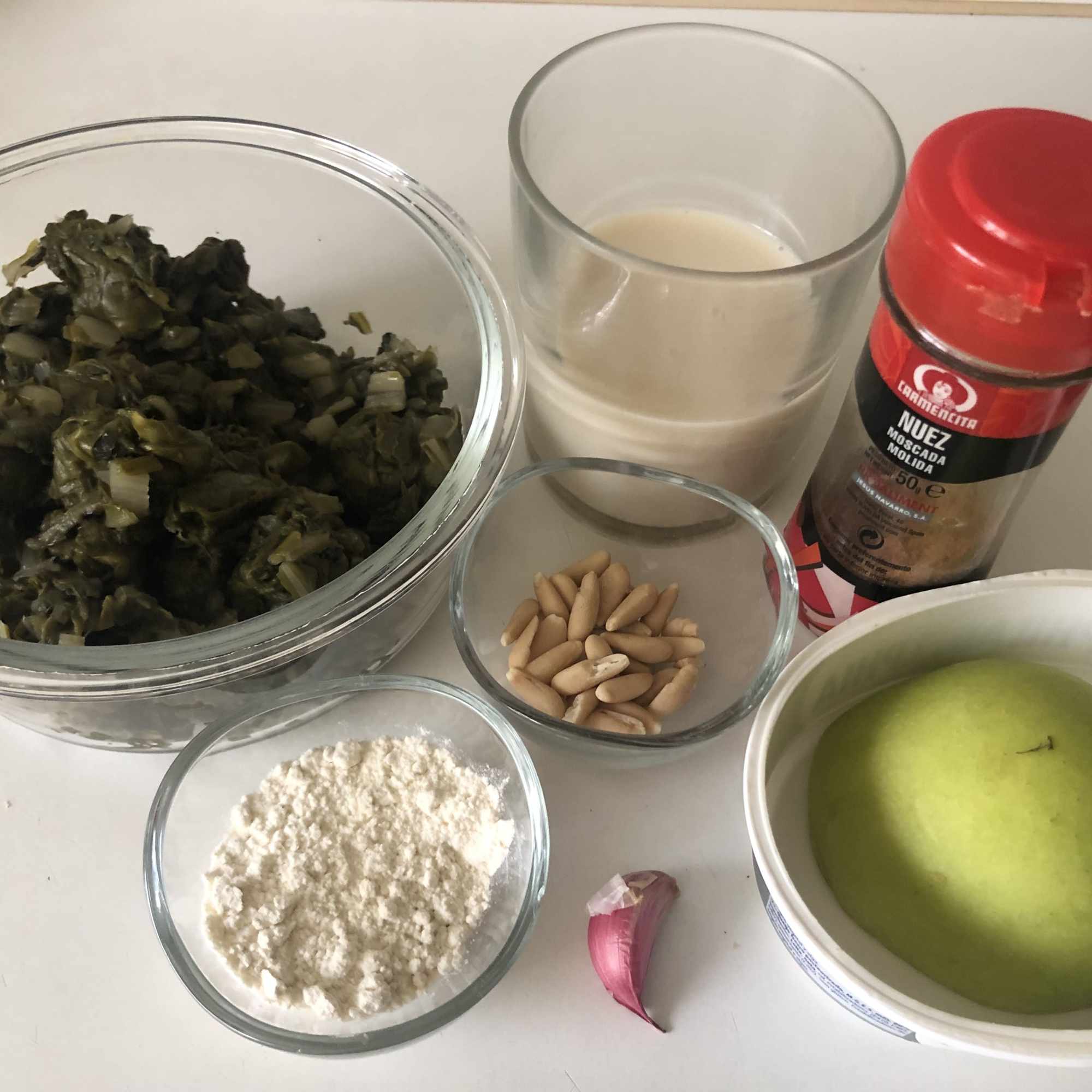 Pela la manzana y córtala en cubos medianos. Calienta un poco de aceite en una sartén y cocina a fuego medio-bajo hasta que quede blandita. Tritura con el mortero el ajo y los piñones y añade a la sartén. Cocina un par de minutos, añade la sal, la pimienta y la nuez moscada.