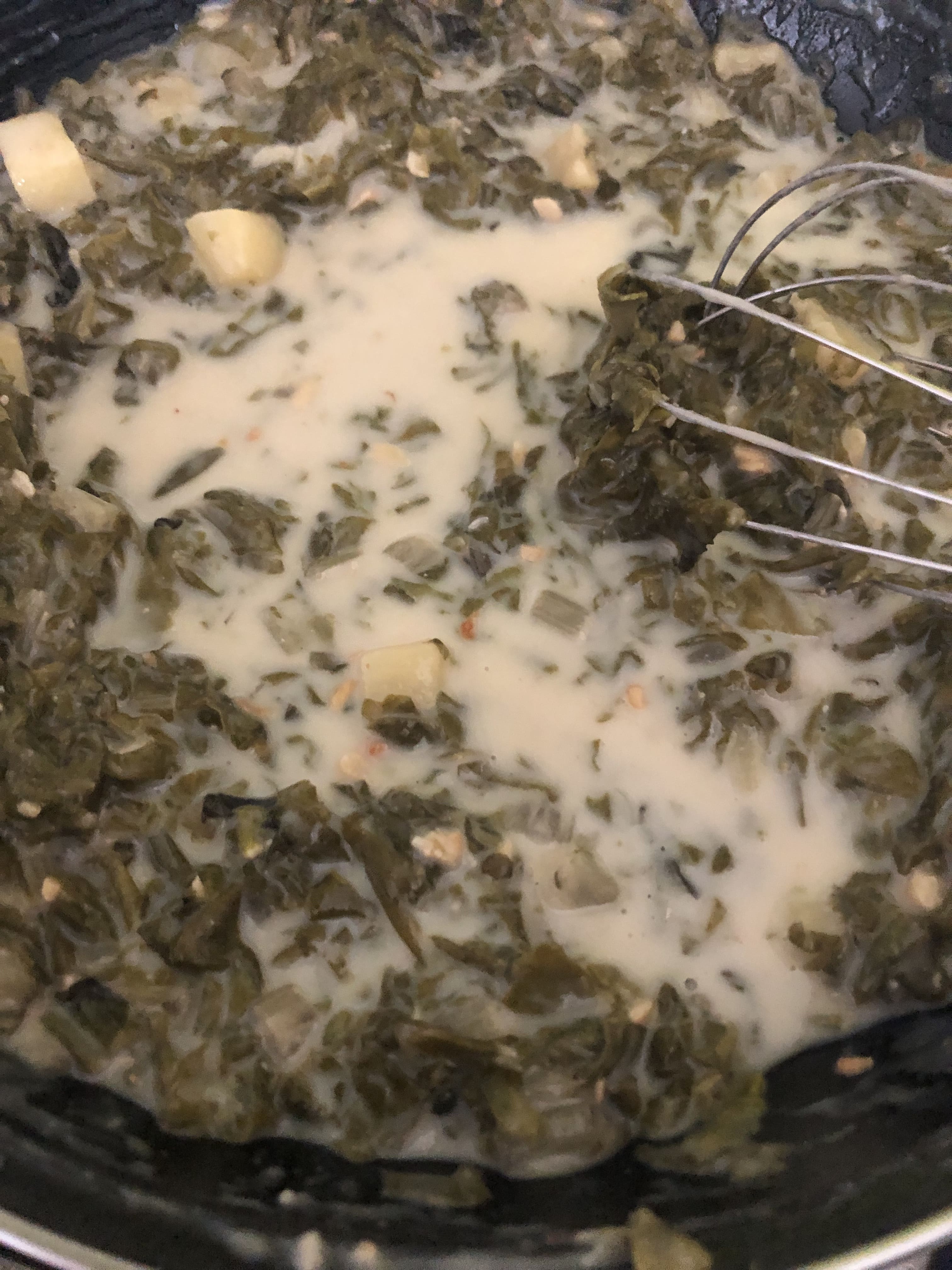 Agrega la harina y cocina un minuto, sin que se queme. Añade la mitad de la leche y remueve con unas varillas. Finalmente, agrega las acelgas escurridas, el resto de la leche y sigue removiendo para que se mezcle todo bien.