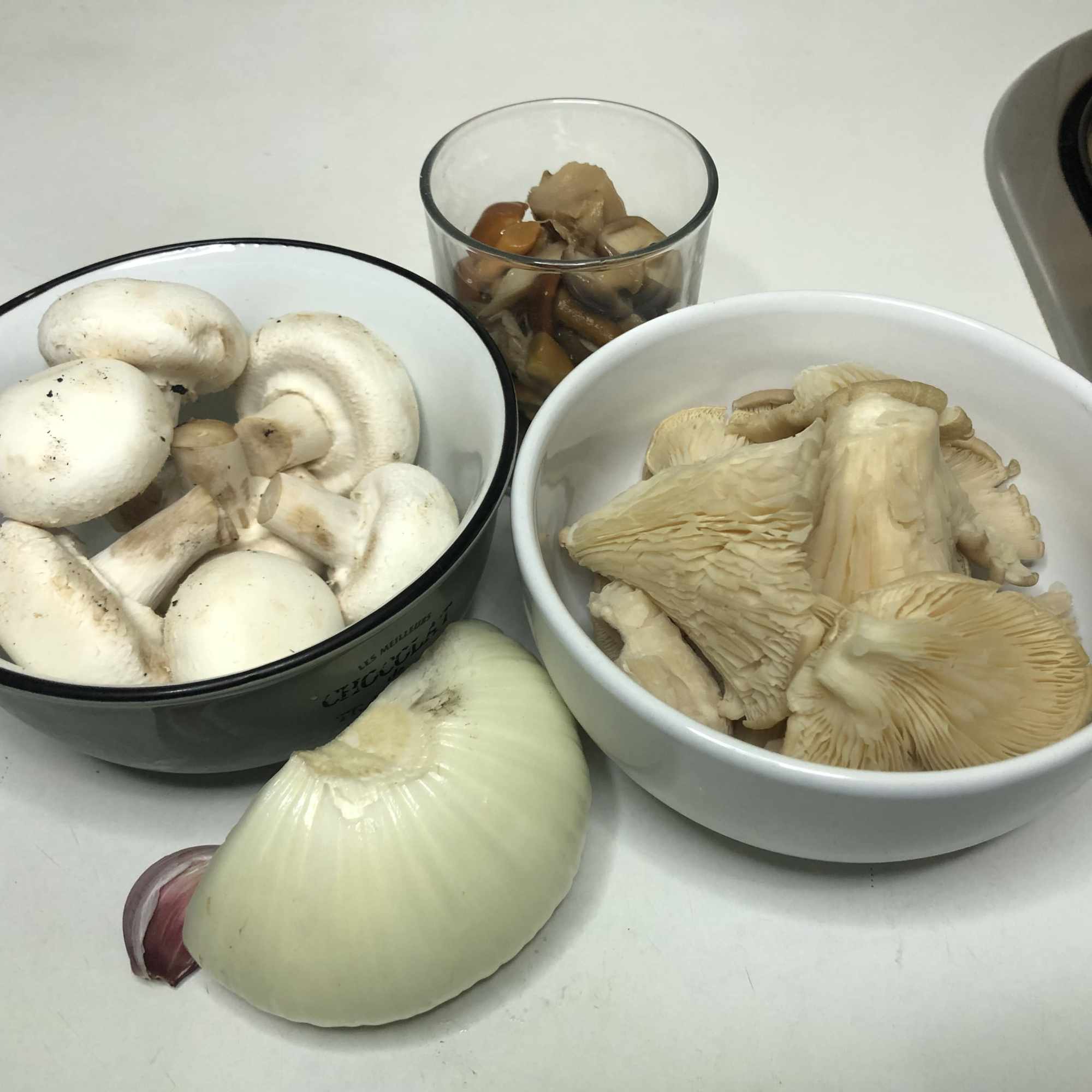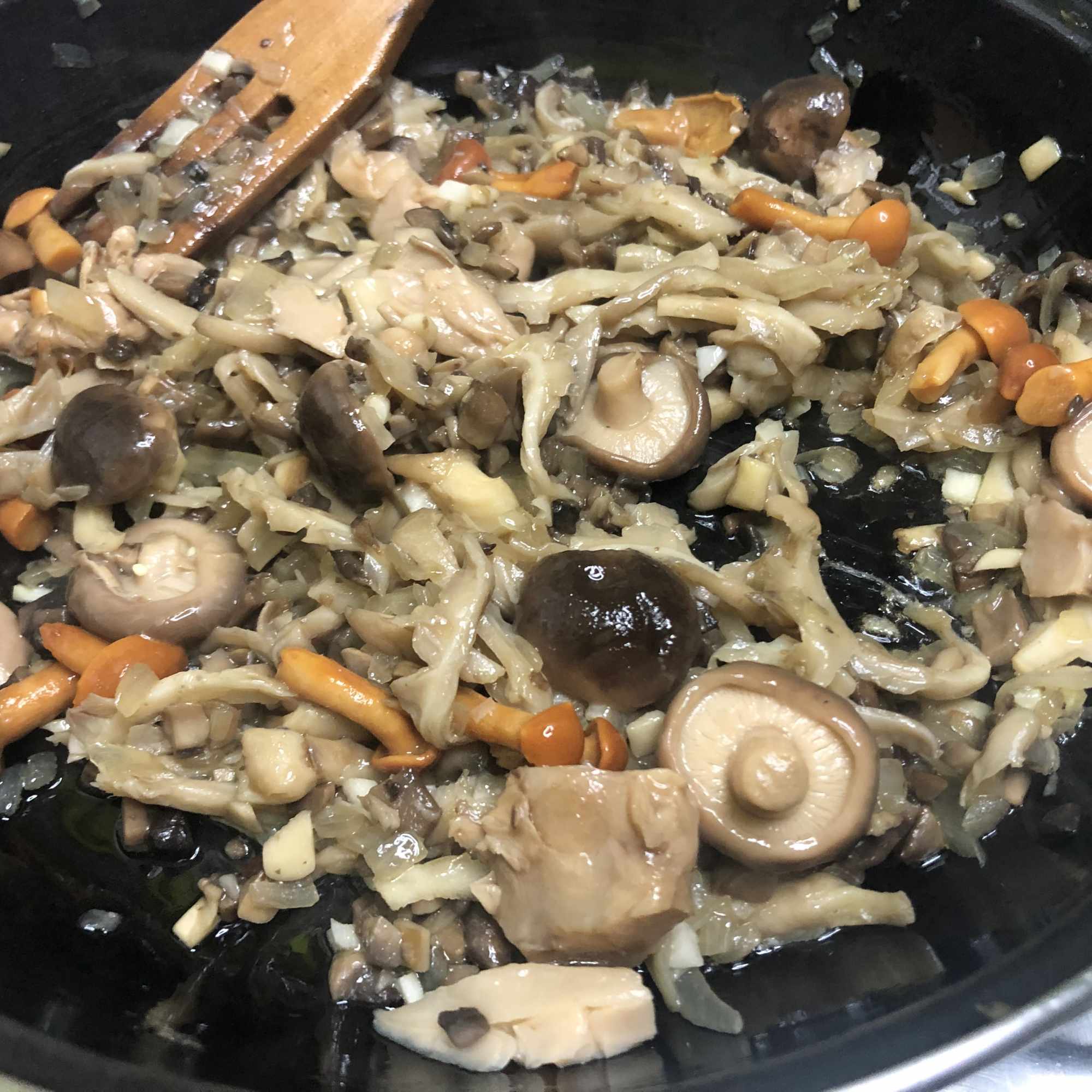 Calienta un poco de aceite en una sartén y pocha la cebolla a fuego medio-bajo. cuando empiece a transparentar añade los champiñones y cocina todo junto. Una vez estén blanditos añade las setas de cardo y cocina unos minutos más. Pica el ajo finamente y agrégalo a la sartén. finalmente, añade el surtido de setas y deja que se cocine todo junto unos minutos más. Separa un tercio de la mezcla para la salsa.