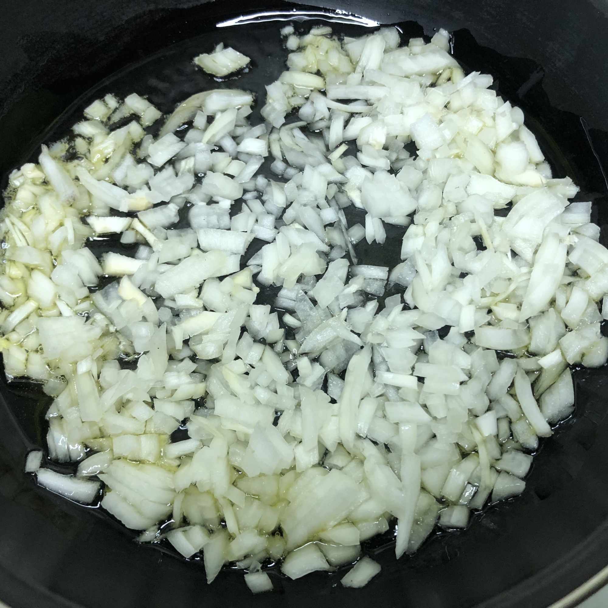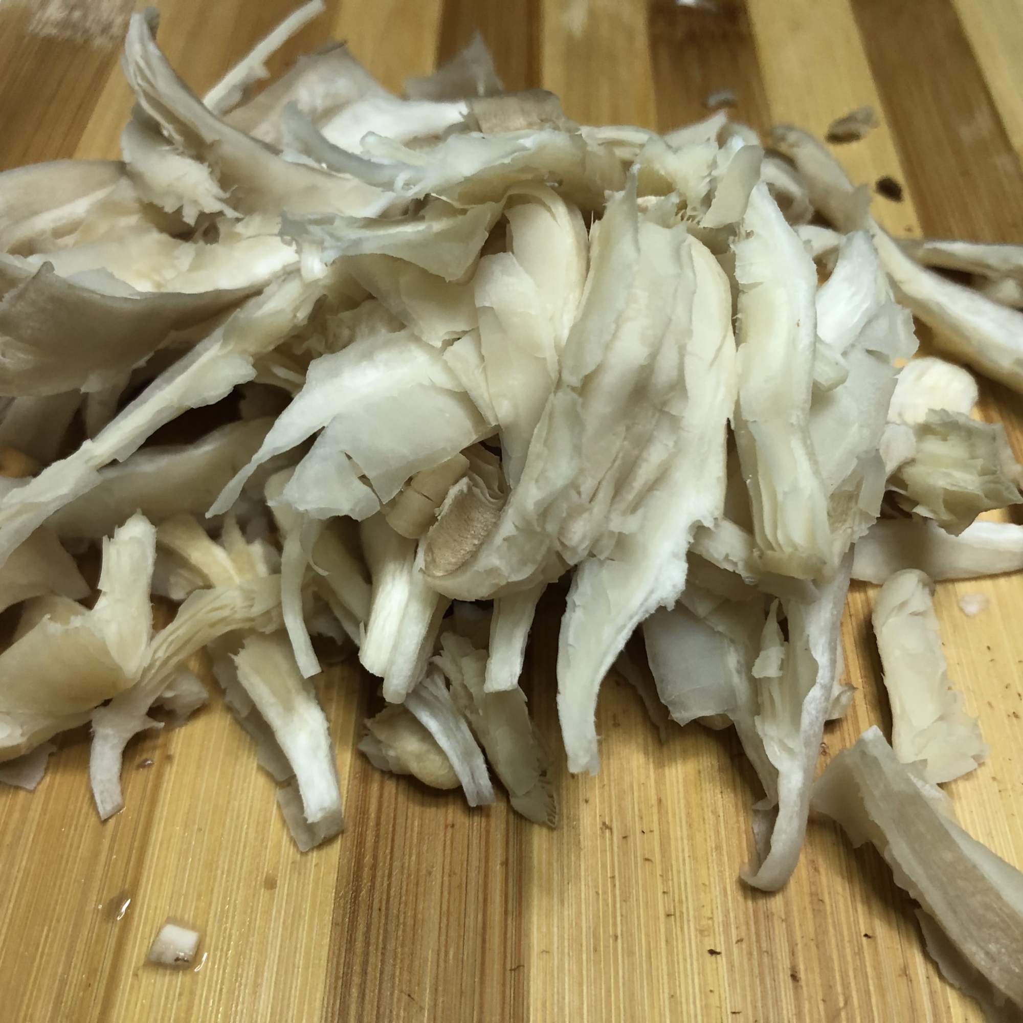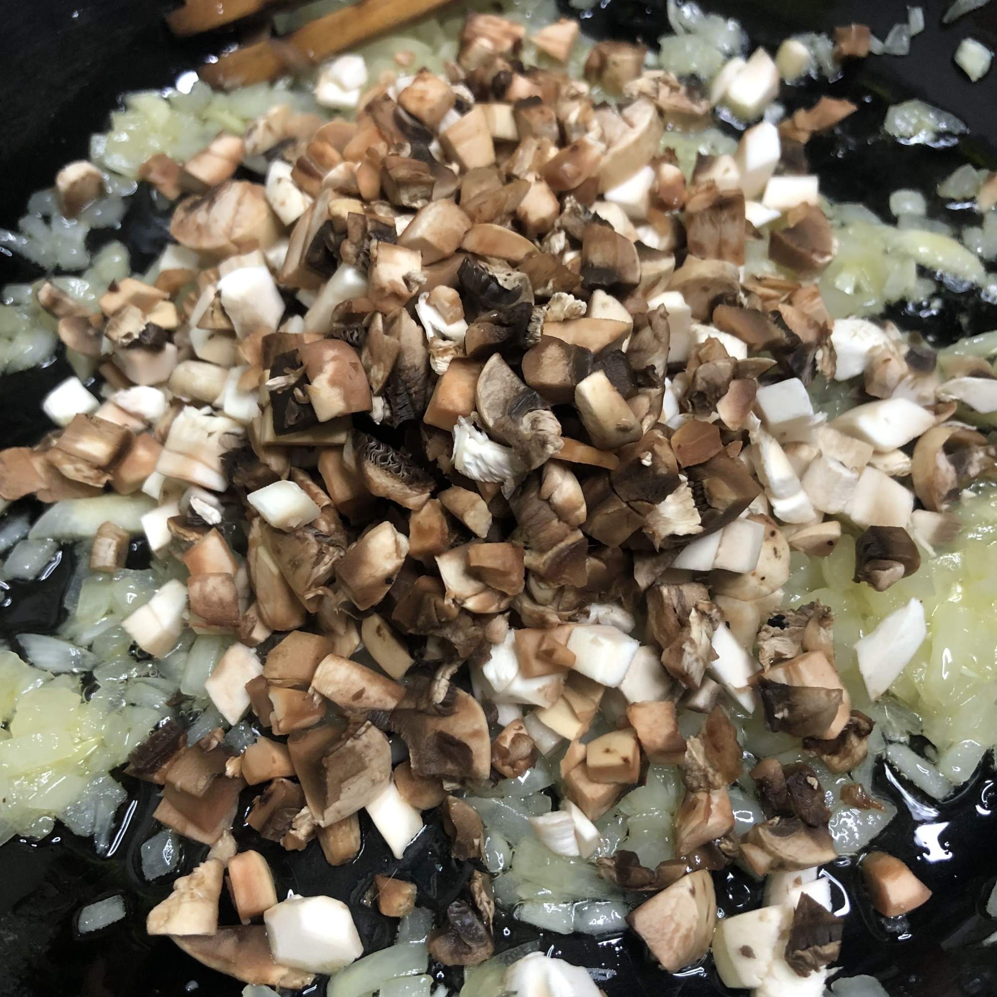 Mientras tanto limpia las setas y escurre el agua del surtido. Corta los champiñones en brunoise, las setas de cardo en tiras (puedes hacerlo con las manos) y la cebolla también en brunoise.