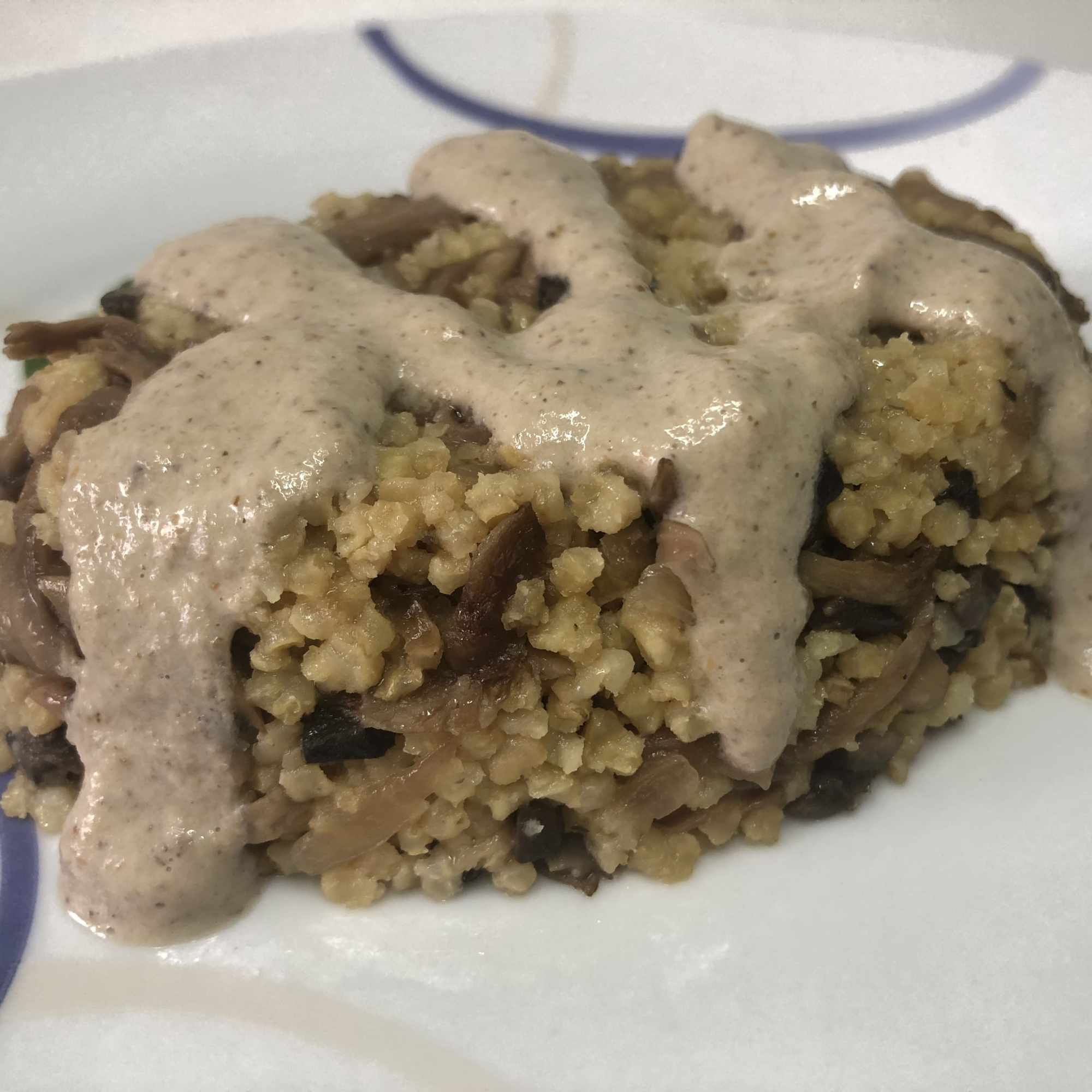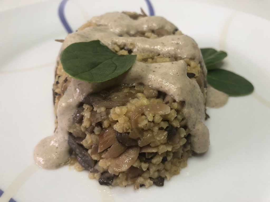 Añade el mijo y mezcla todo bien, separando con cuidado los granos. En otra sartén vierte la nata y las setas reservadas. Salpimenta y cocina un par de minutos. Tritura con la batidora. Si la salsa te queda muy espesa puedes añadirle un chorrito de leche.