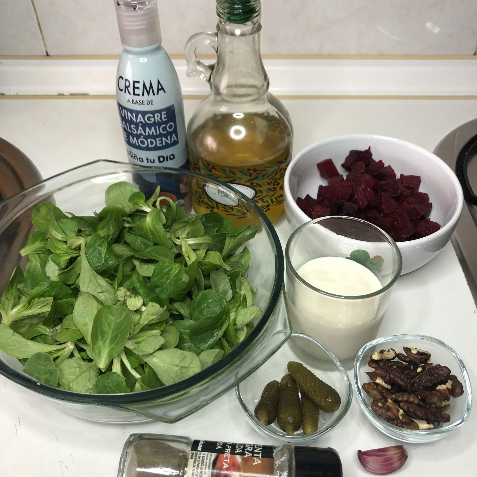 En un plato coloca una base de canónigos. Añade la ensalada de remolacha. Decora con nueces picadas.