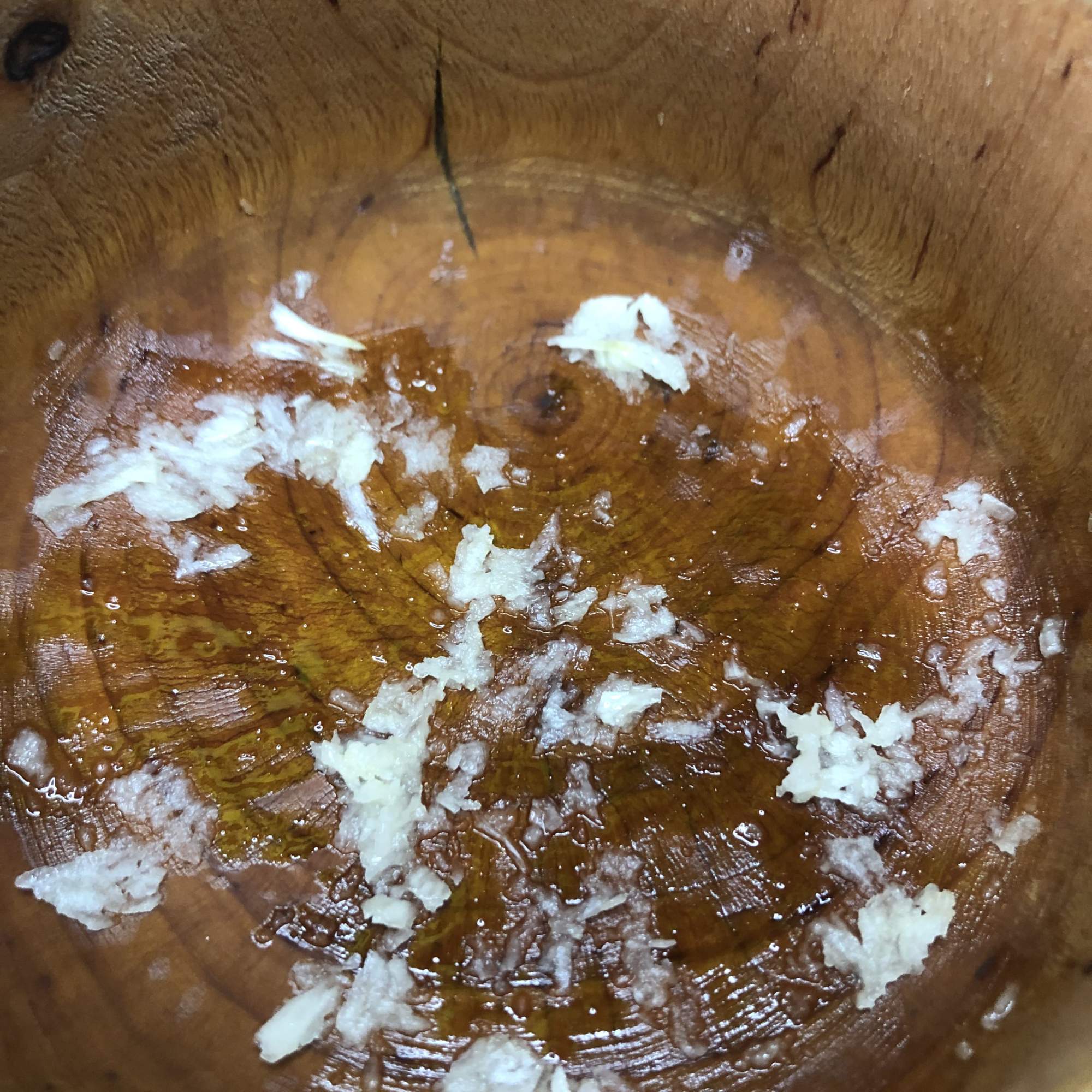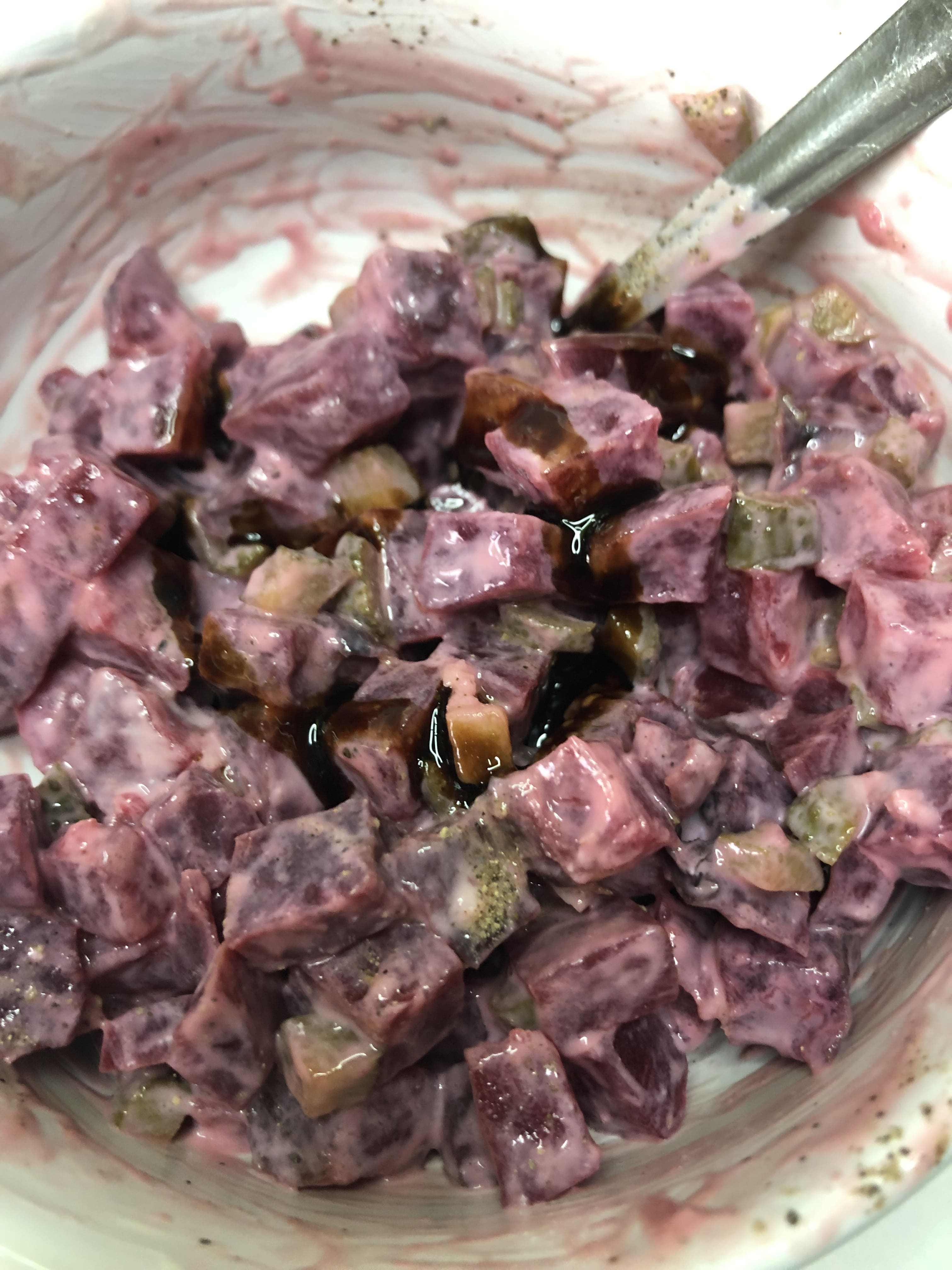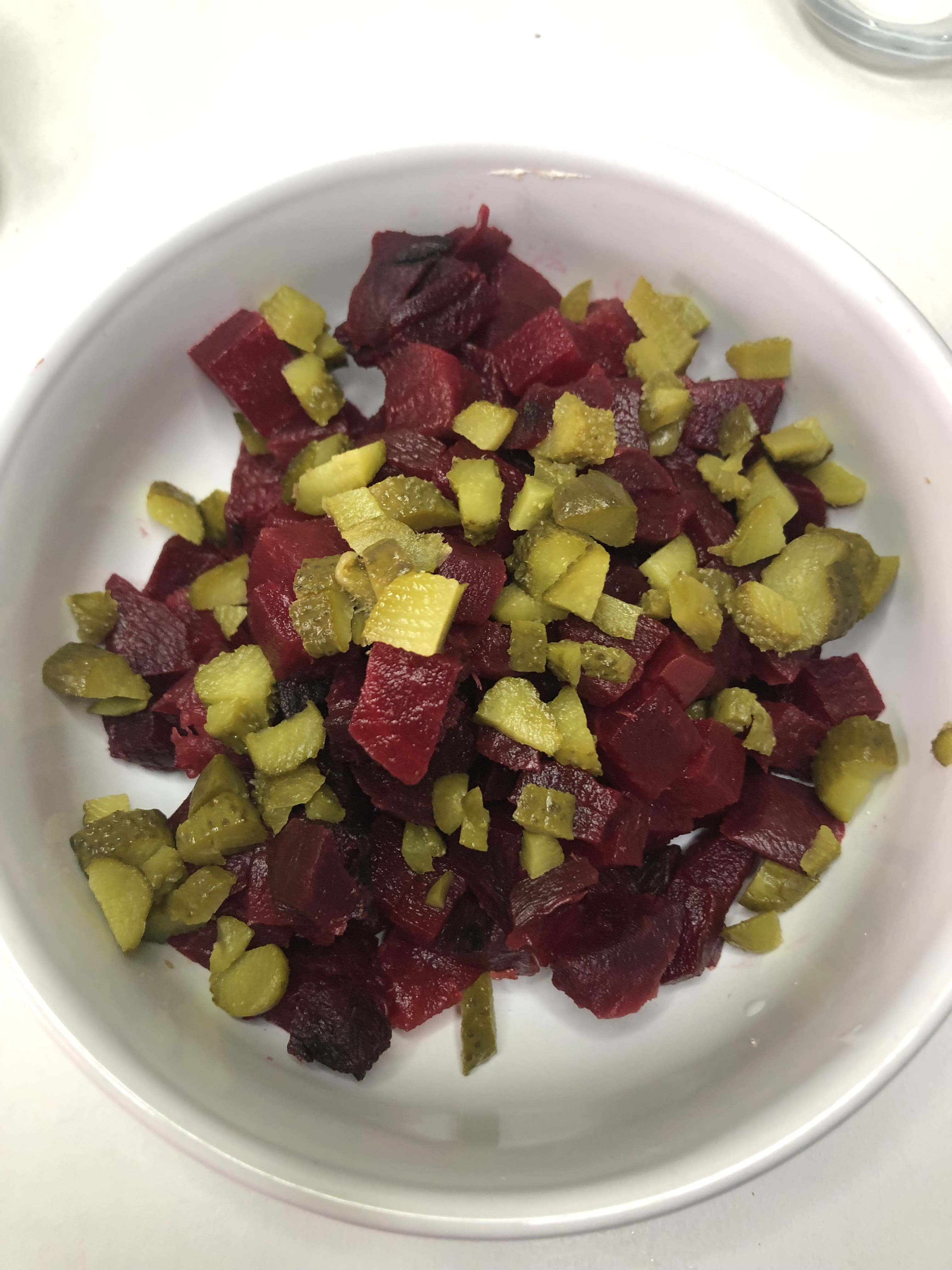 Corta la remolacha en cubos pequeños y los pepinillos. Tritura el ajo con el mortero y mezcla con el yogur.