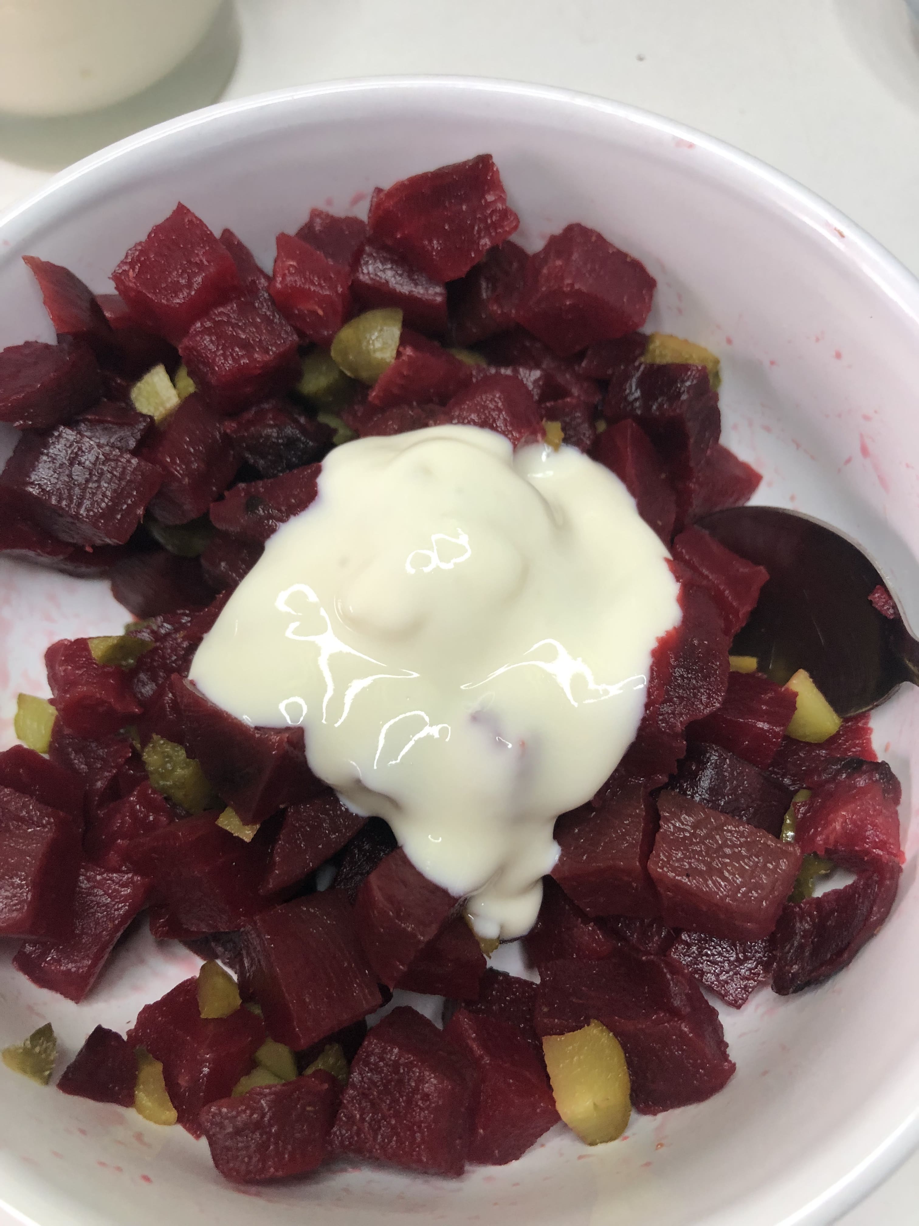 Pon la remolacha y los pepinillos en un recipiente. Agrega la sal, la pimienta, el aceite y el vinagre y mezcla todo bien. Por último, añade parte del yogur (deja un poco para el final para decorar) e integra todos los ingredientes.