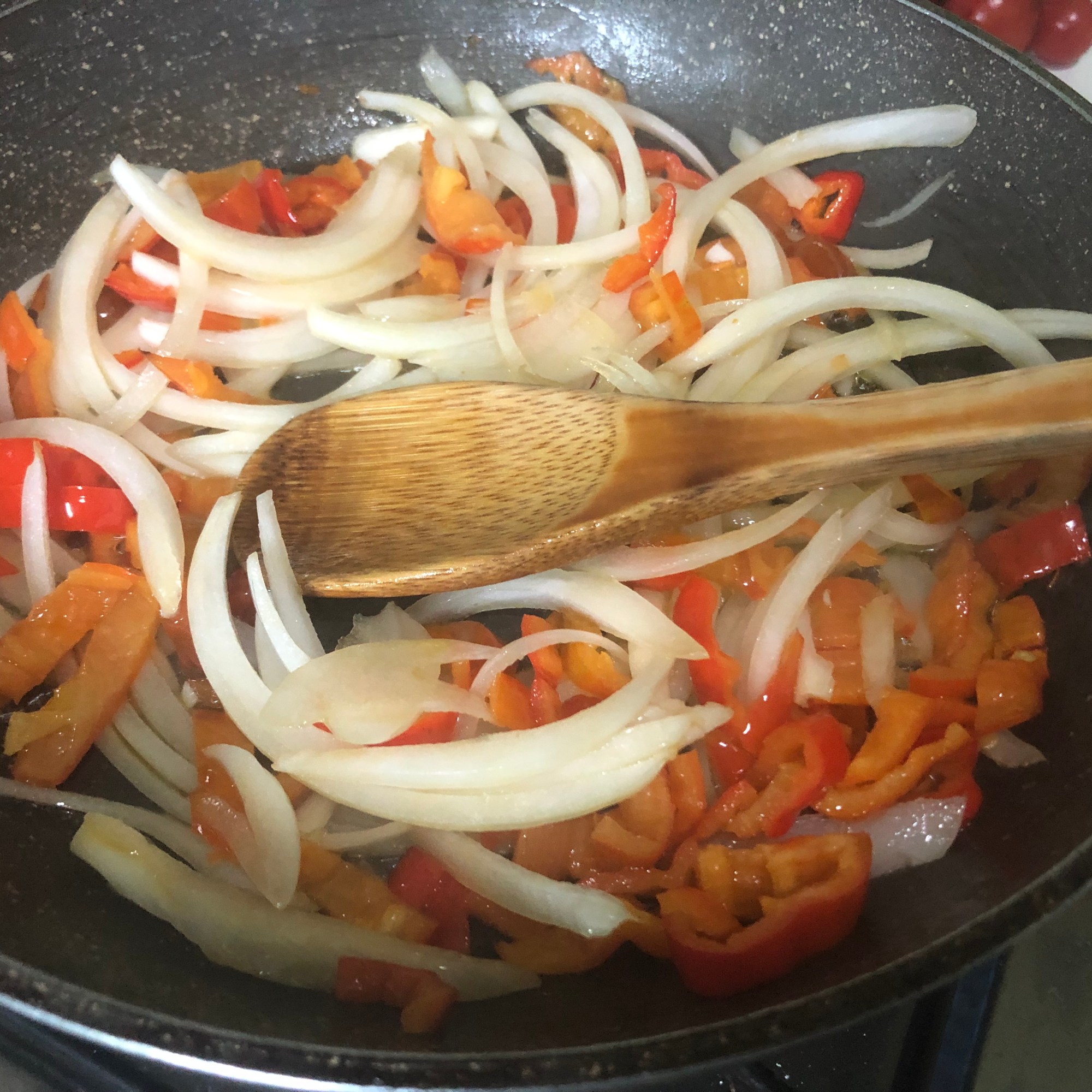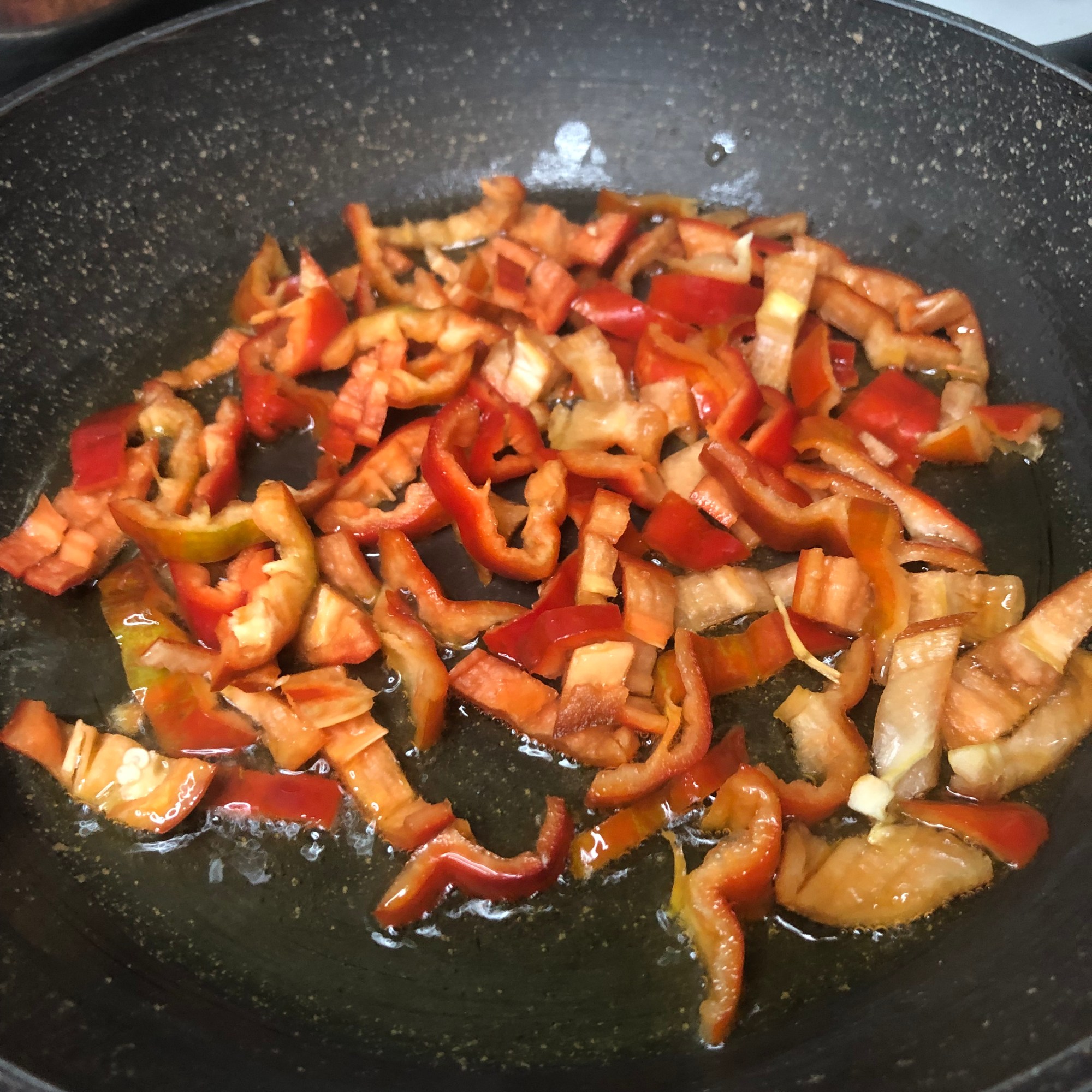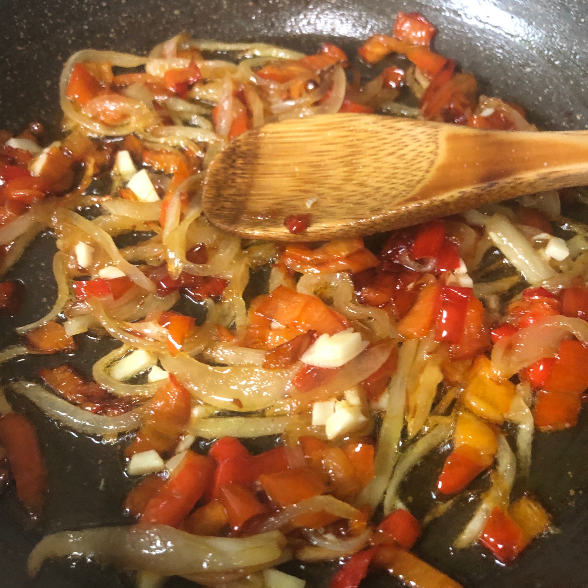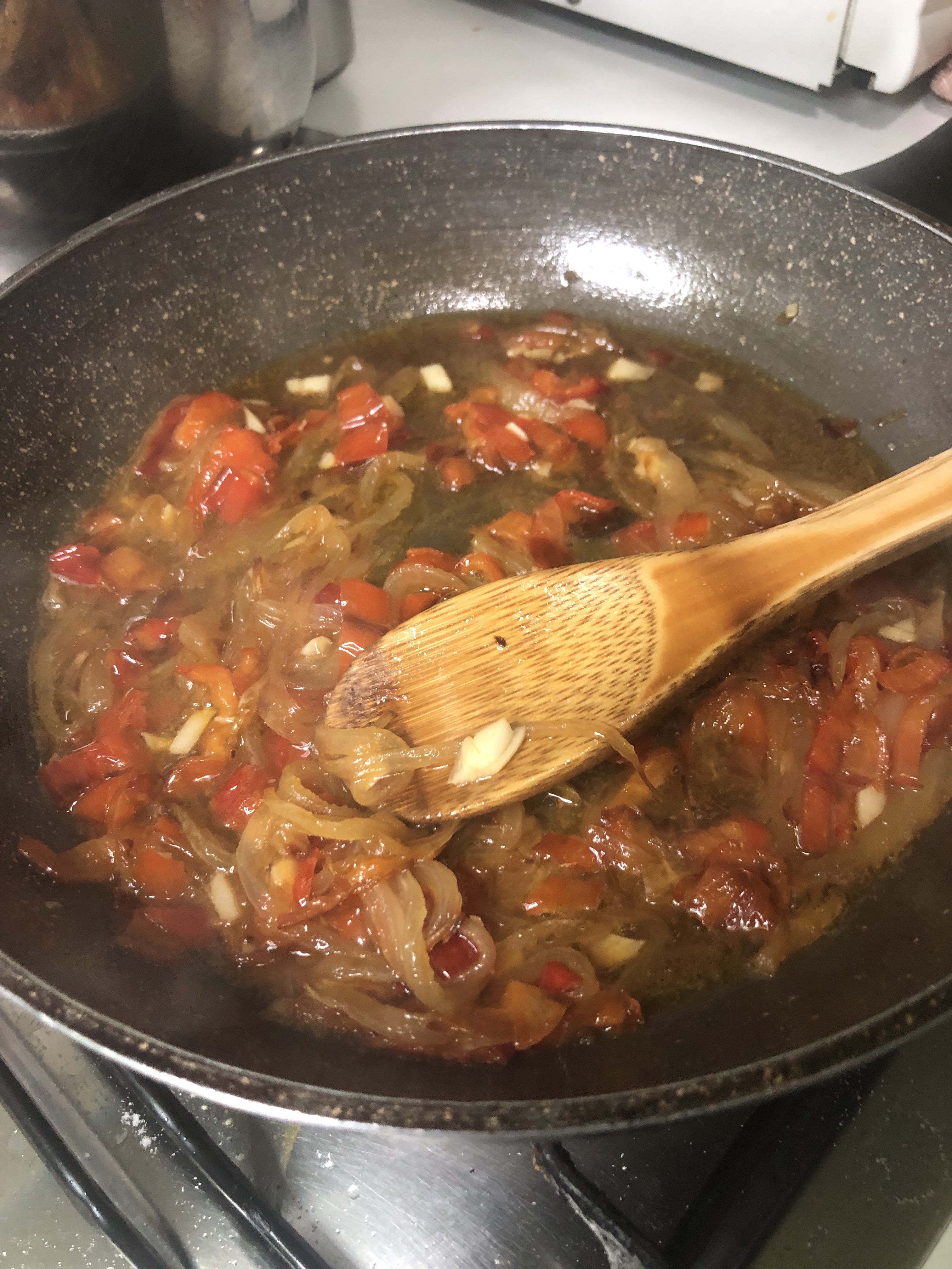 Sofríe el pimiento y cuando esté blandito añade la cebolla. Cuando empiece a transparentar agrega el ajo y cocina un par de minutos. Sazona.