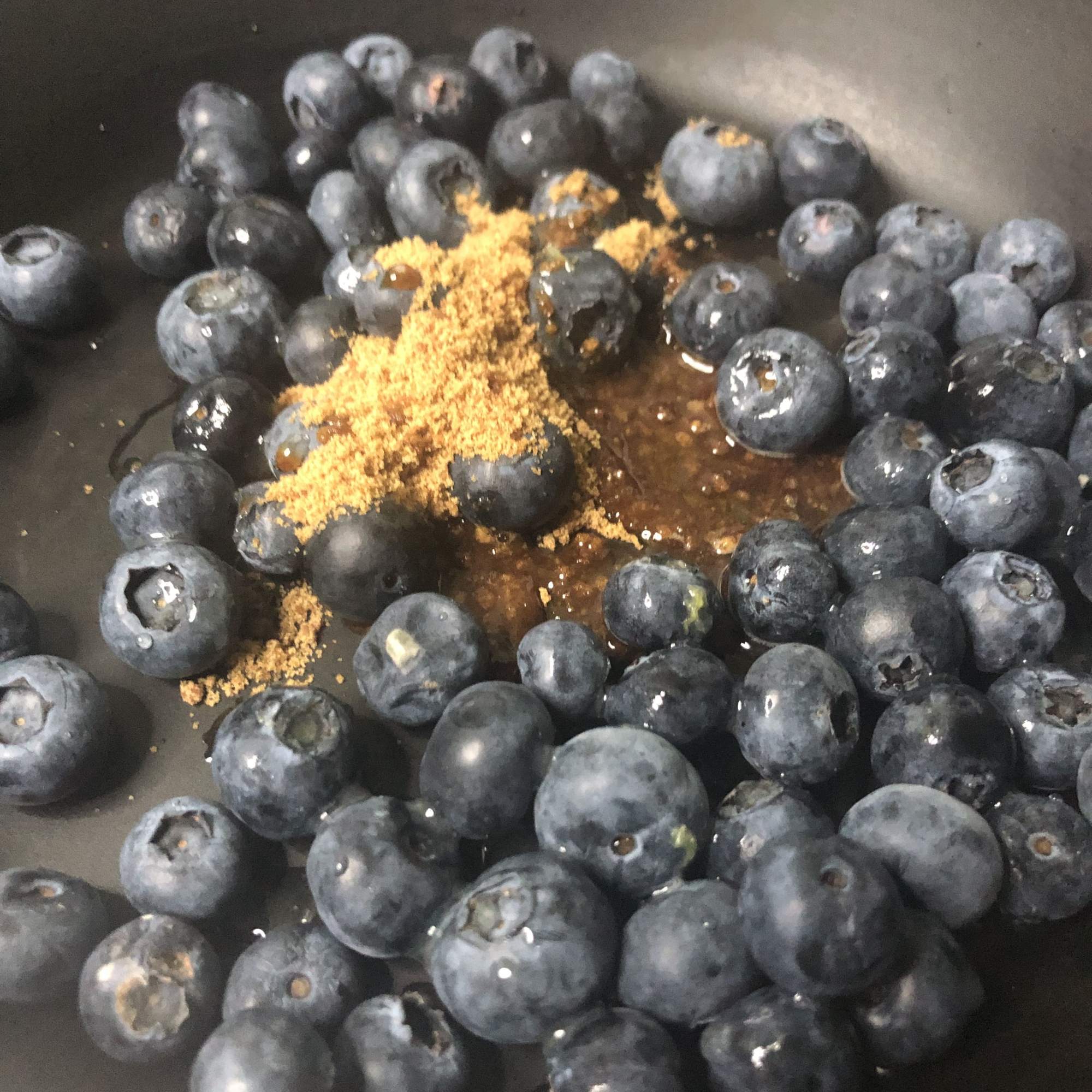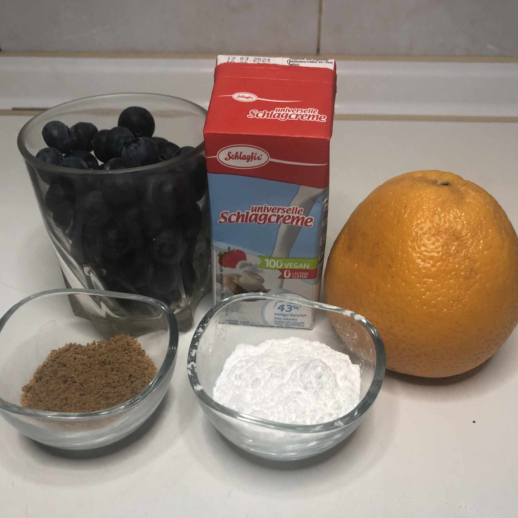 Prepara el recipiente donde vayas a montar la nata, metiéndolo unos 15 minutos en el congelador para que esté bien frío. Haz lo mismo con las varillas. En una sartén vierte los arándanos, la panela y el zumo de naranja y cocina a fuego medio bajo durante unos 10-15 minutos o hasta que la mayoría de arándanos se hayan desecho. Deja enfriar.
