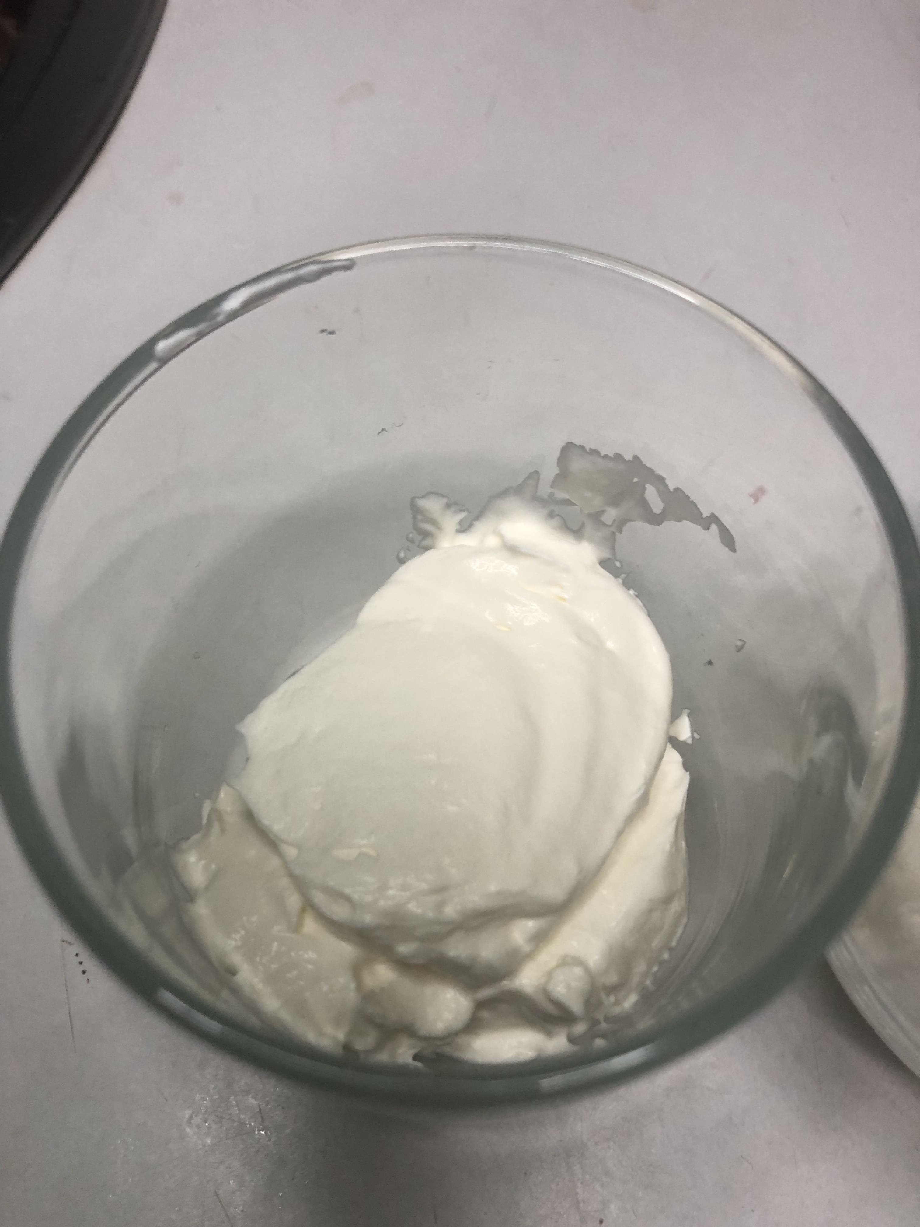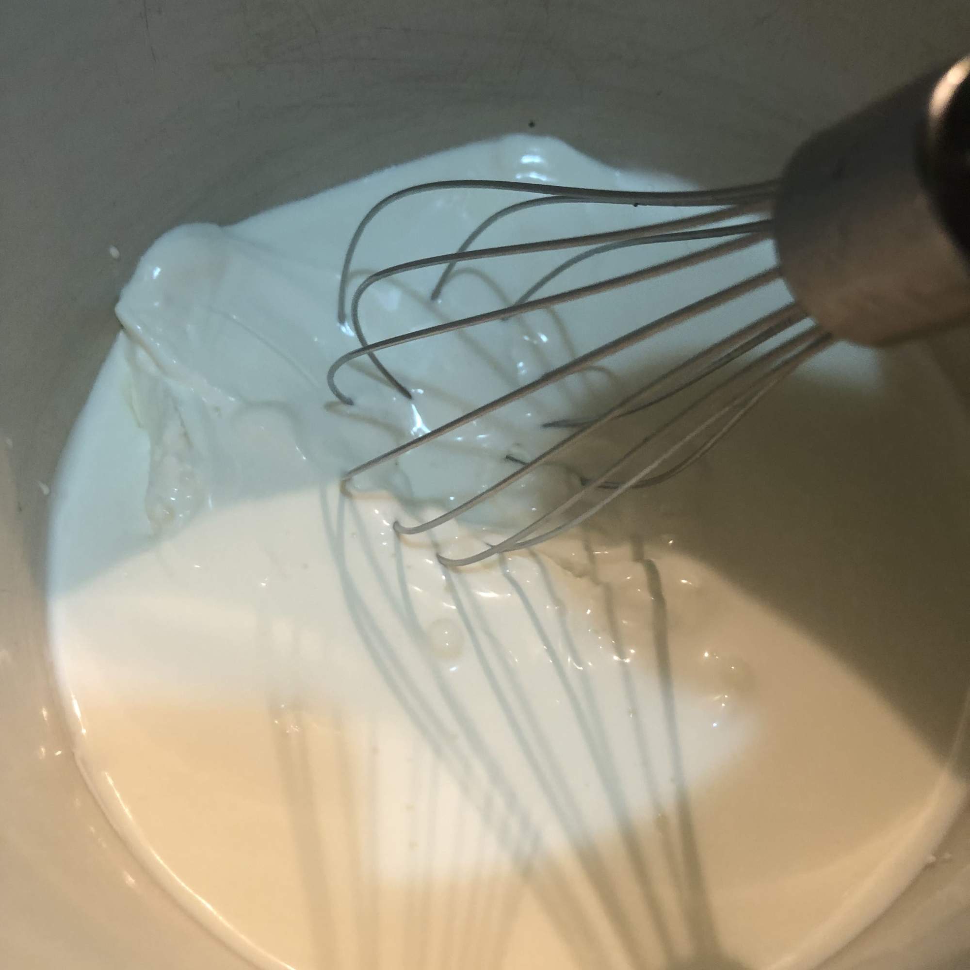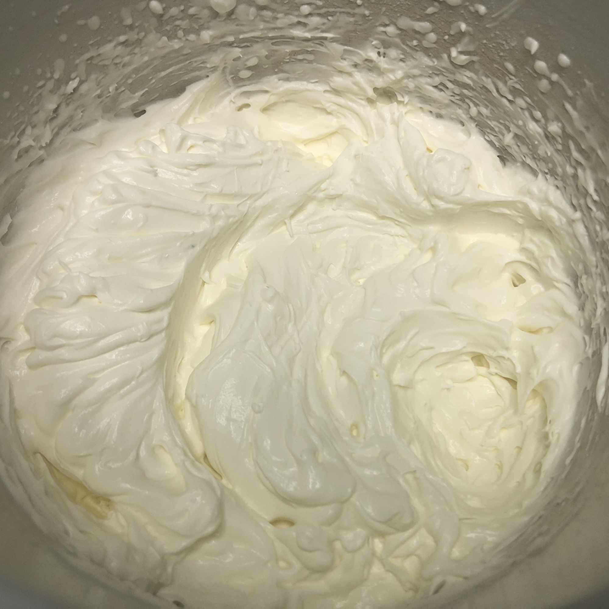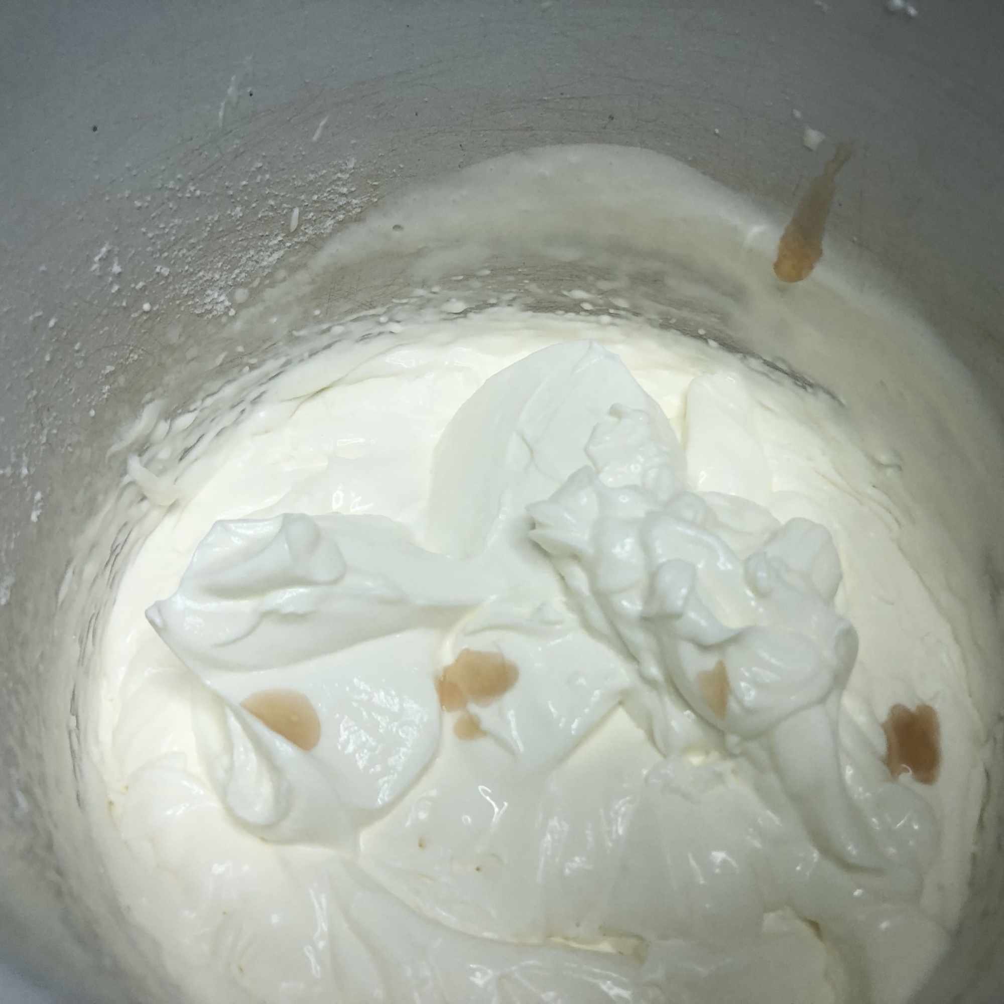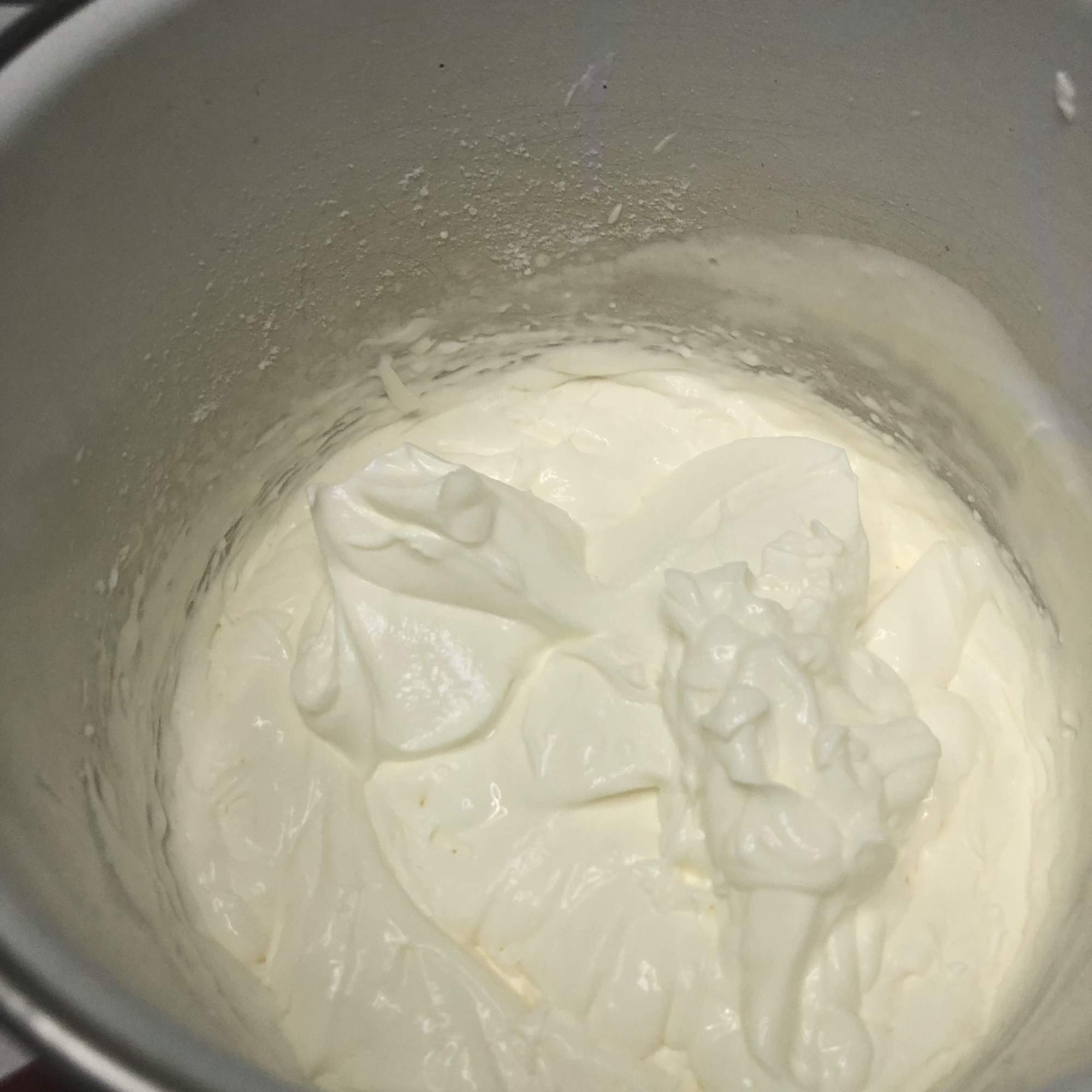 Vierte la nata en el recipiente frío y monta con varillas. Cuando empiece a estar cremosa añade el azúcar glass hasta que adquiera una mayor consistencia. Agrega entonces el yogur y la vainilla y sigue batiendo hasta que haga picos.