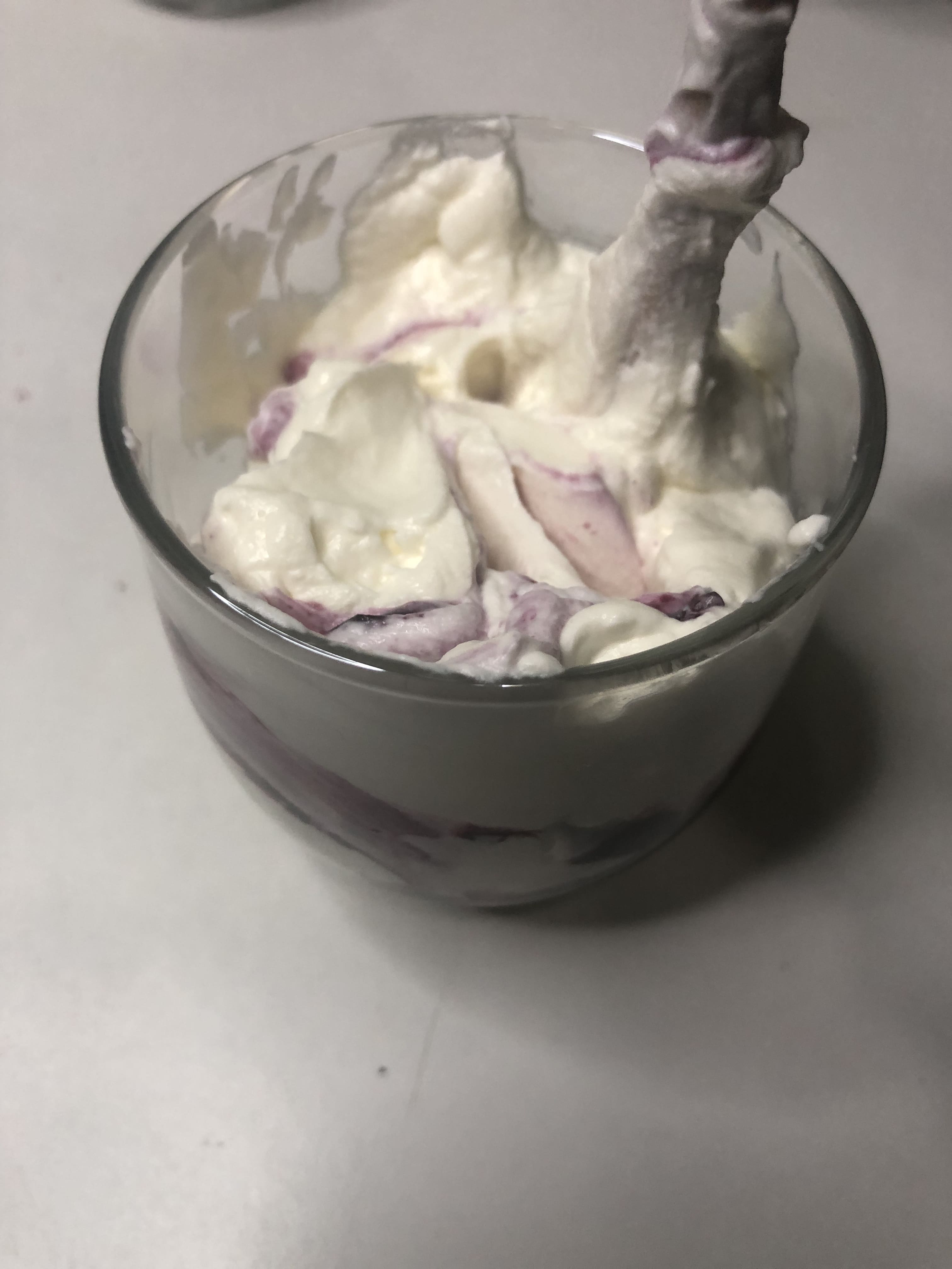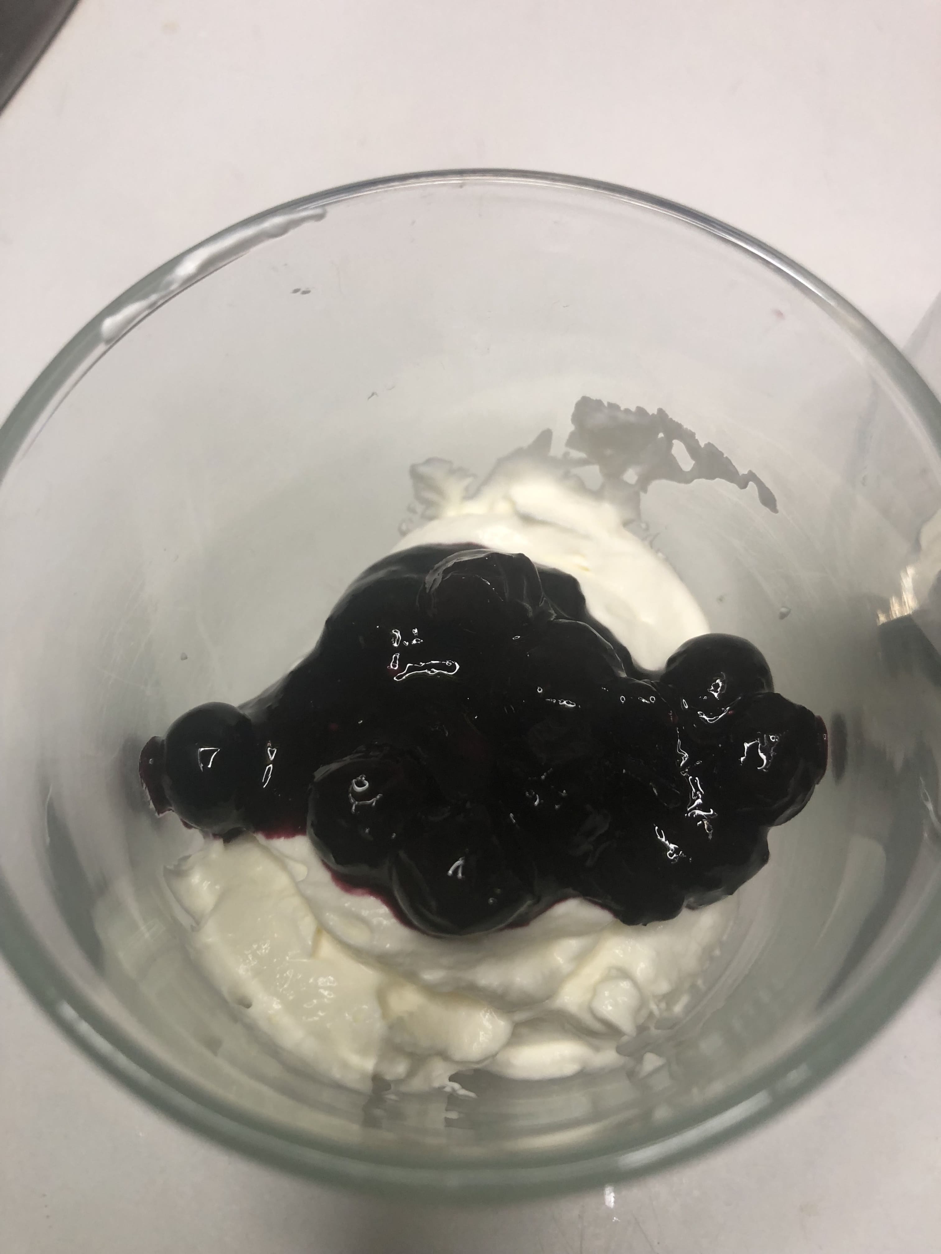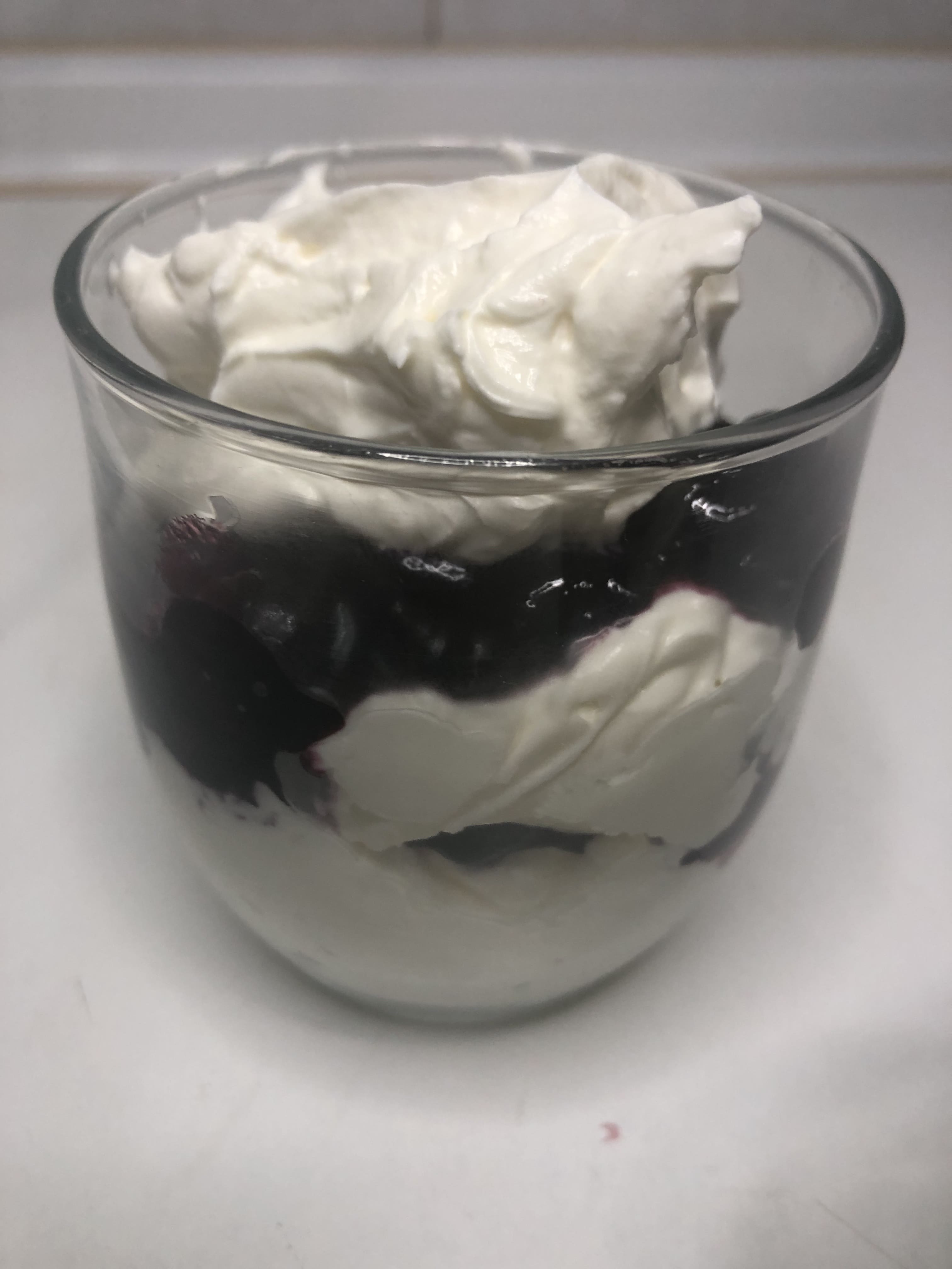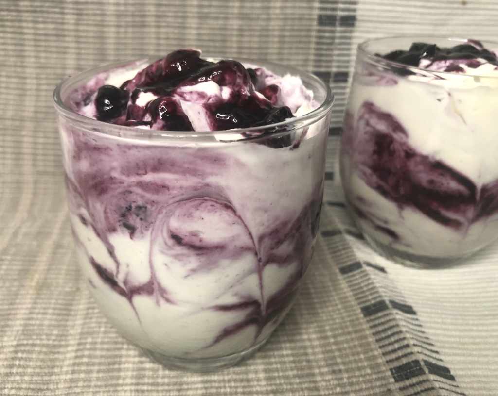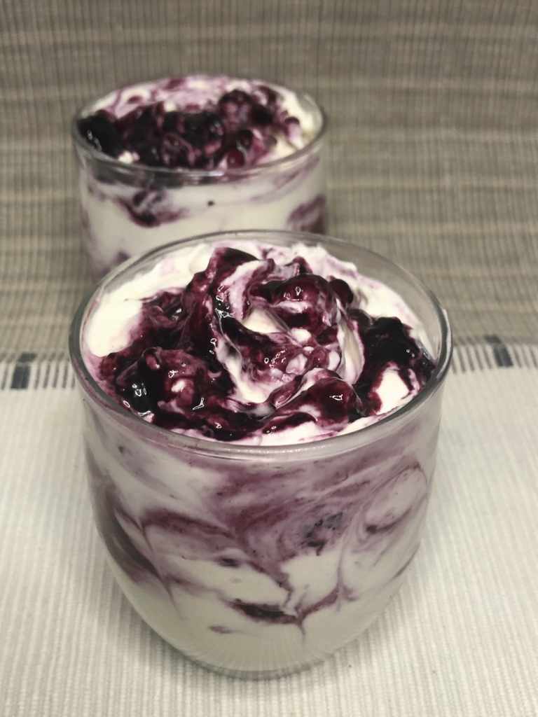 En un vasito ve alternando capas de crema de nata y yogur y de arándanos (intenta que estén un poco fríos). Con ayuda de un palillo o una cuchara ve haciendo surcos para que se entremezclen entre ellos. Decora con más arándanos.