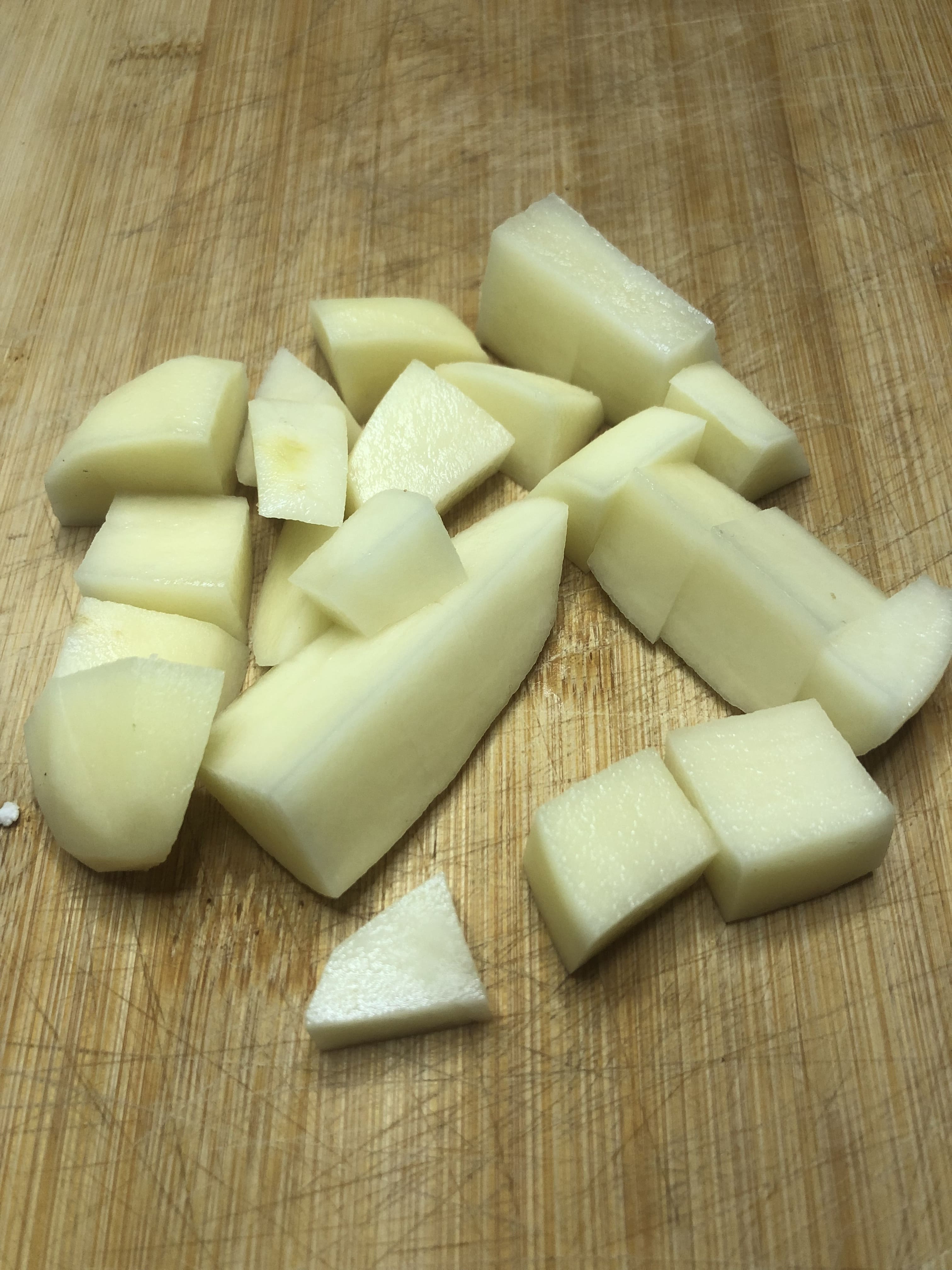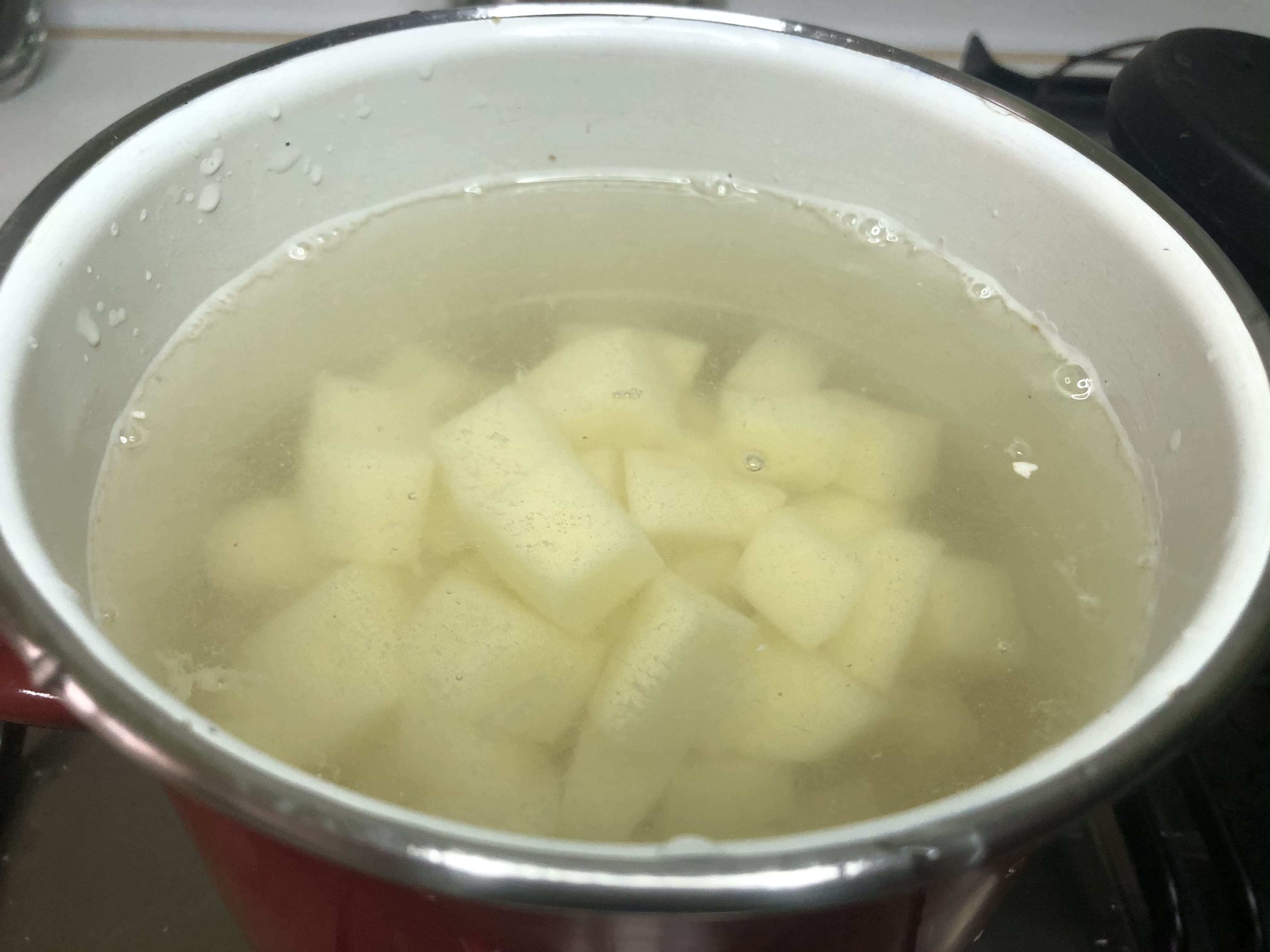 Pela las patatas y corta en cubos medianos. Hierve agua en una cazuela (sin sal ni nada) y cuece las patatas hasta que estén tiernas. Escurre y deja templar un poco.