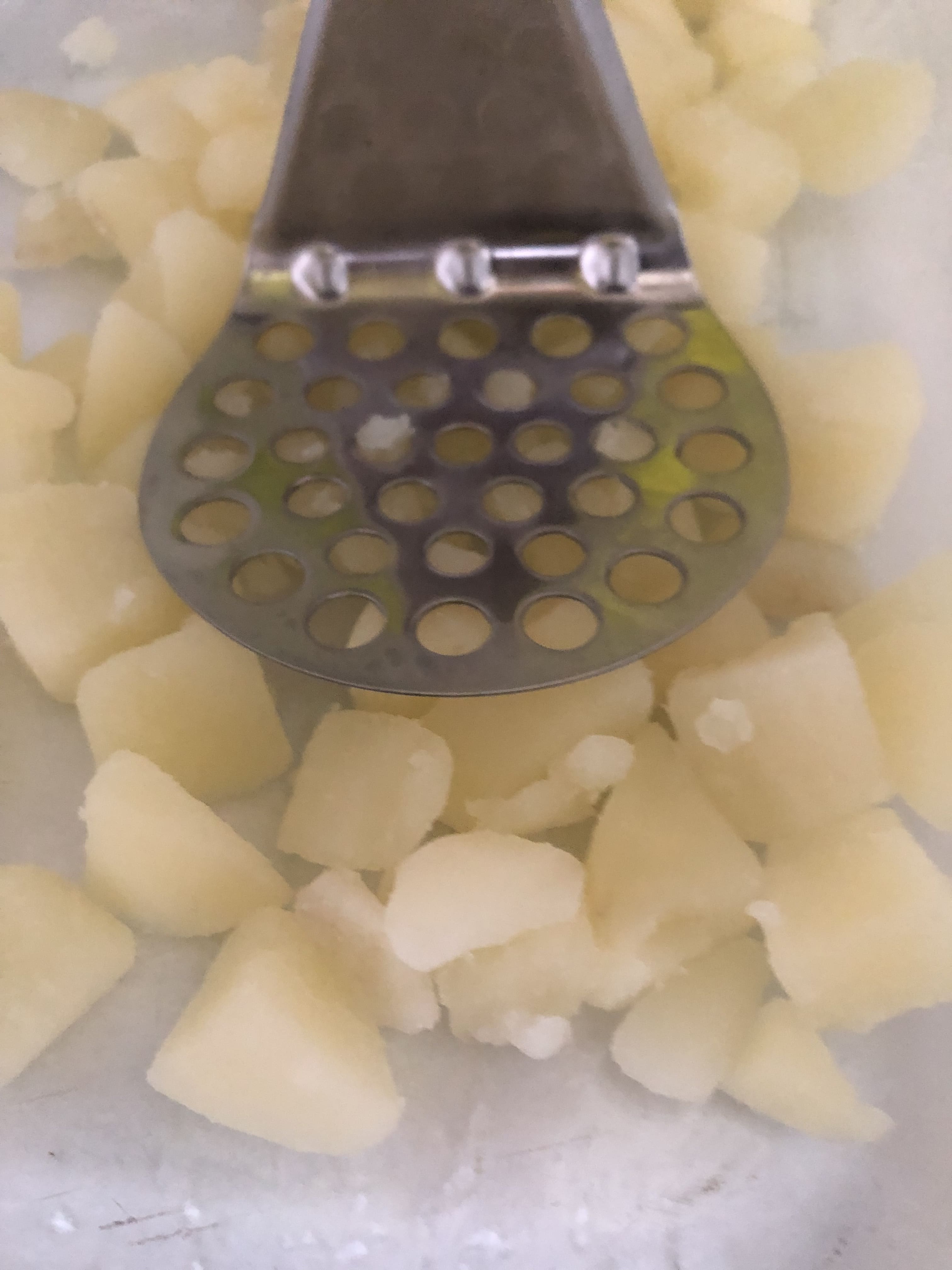En un recipiente coloca las patatas y haz un puré homogéneo (con un tenedor o pisapurés). Agrega las espinacas, que habrás escurrido de nuevo para eliminar el exceso de agua, e integra todo bien.