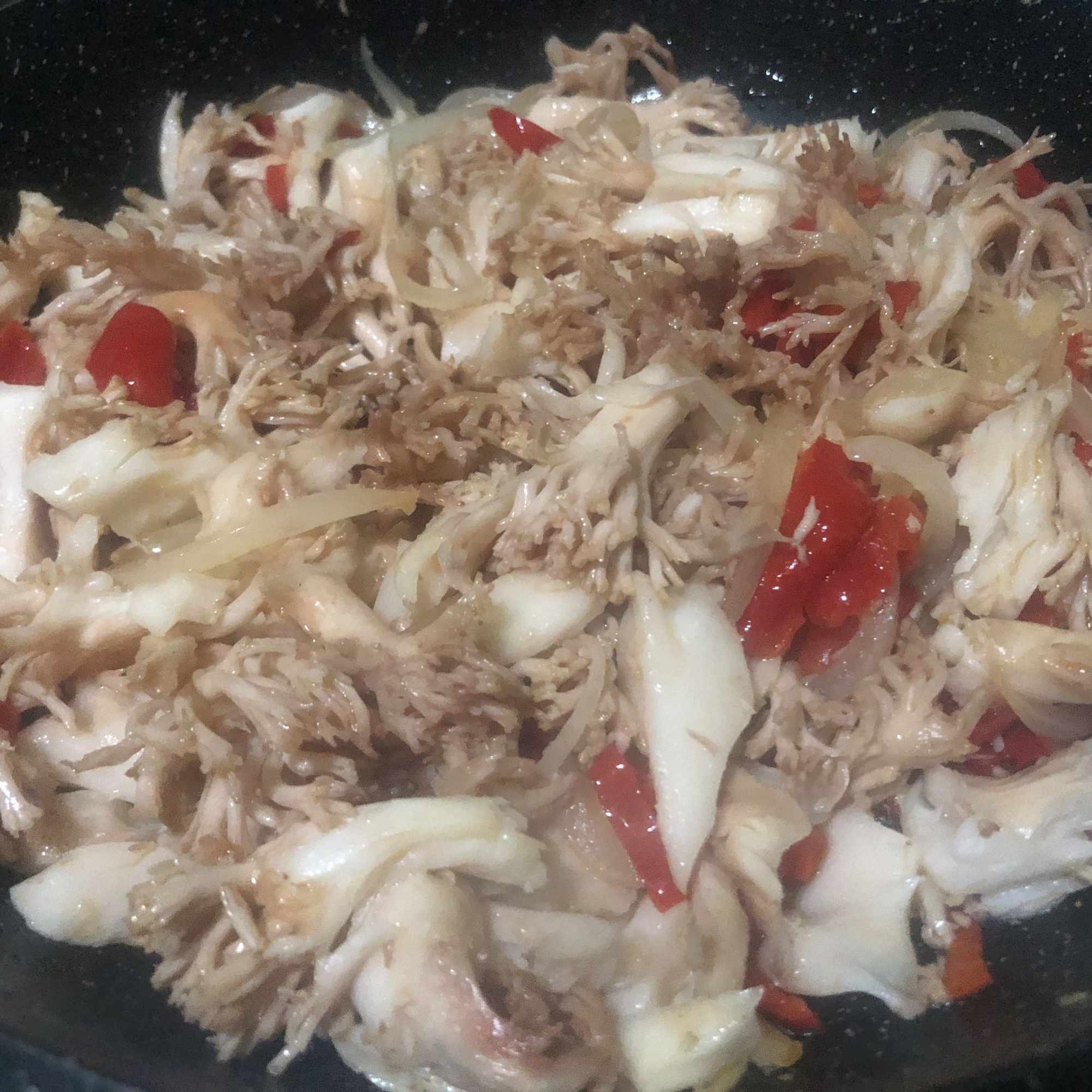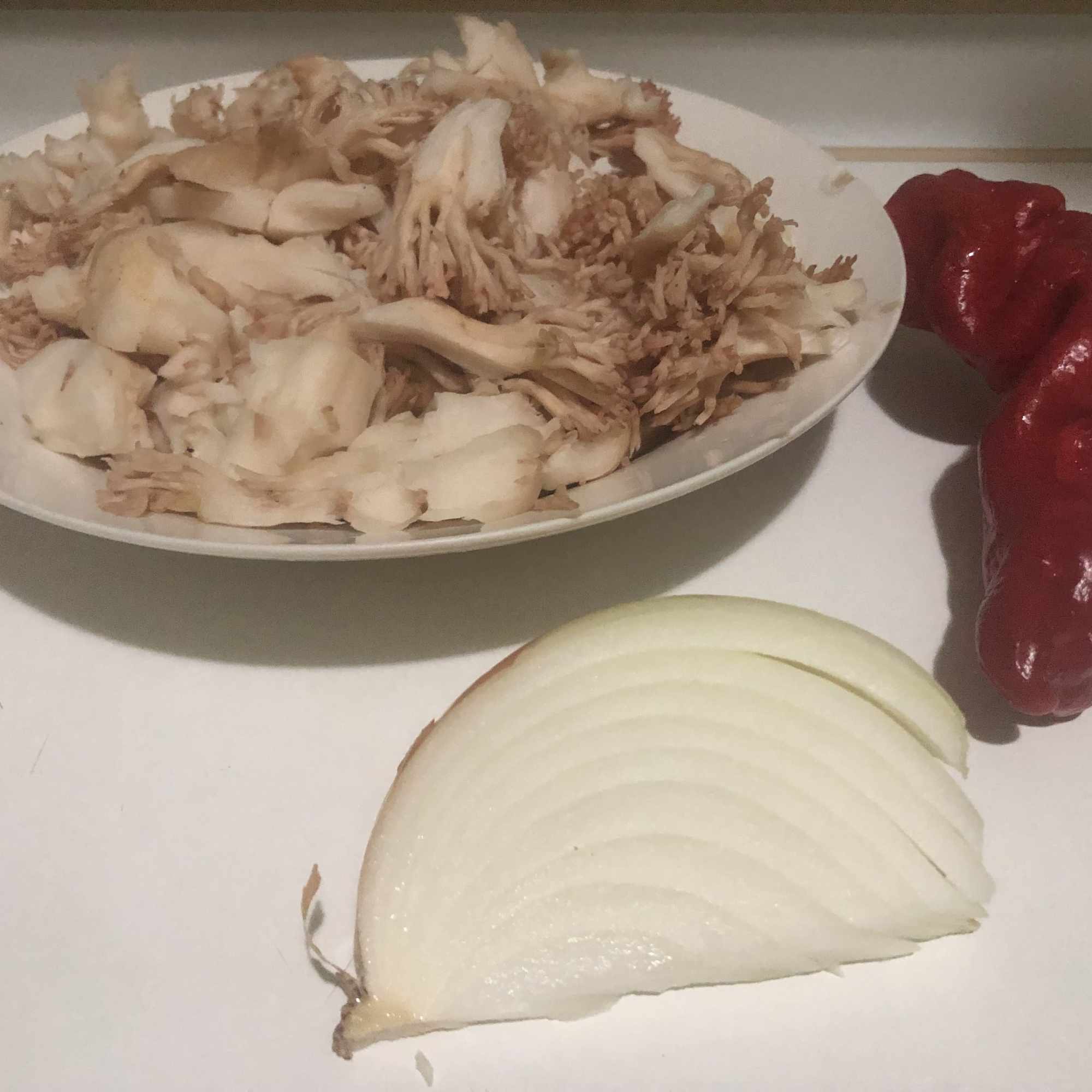 Lava bien las setas, haciendo hincapié en la parte rizada. Corta en trozos no demasiado grandes. Corta la cebolla y el pimiento en juliana.