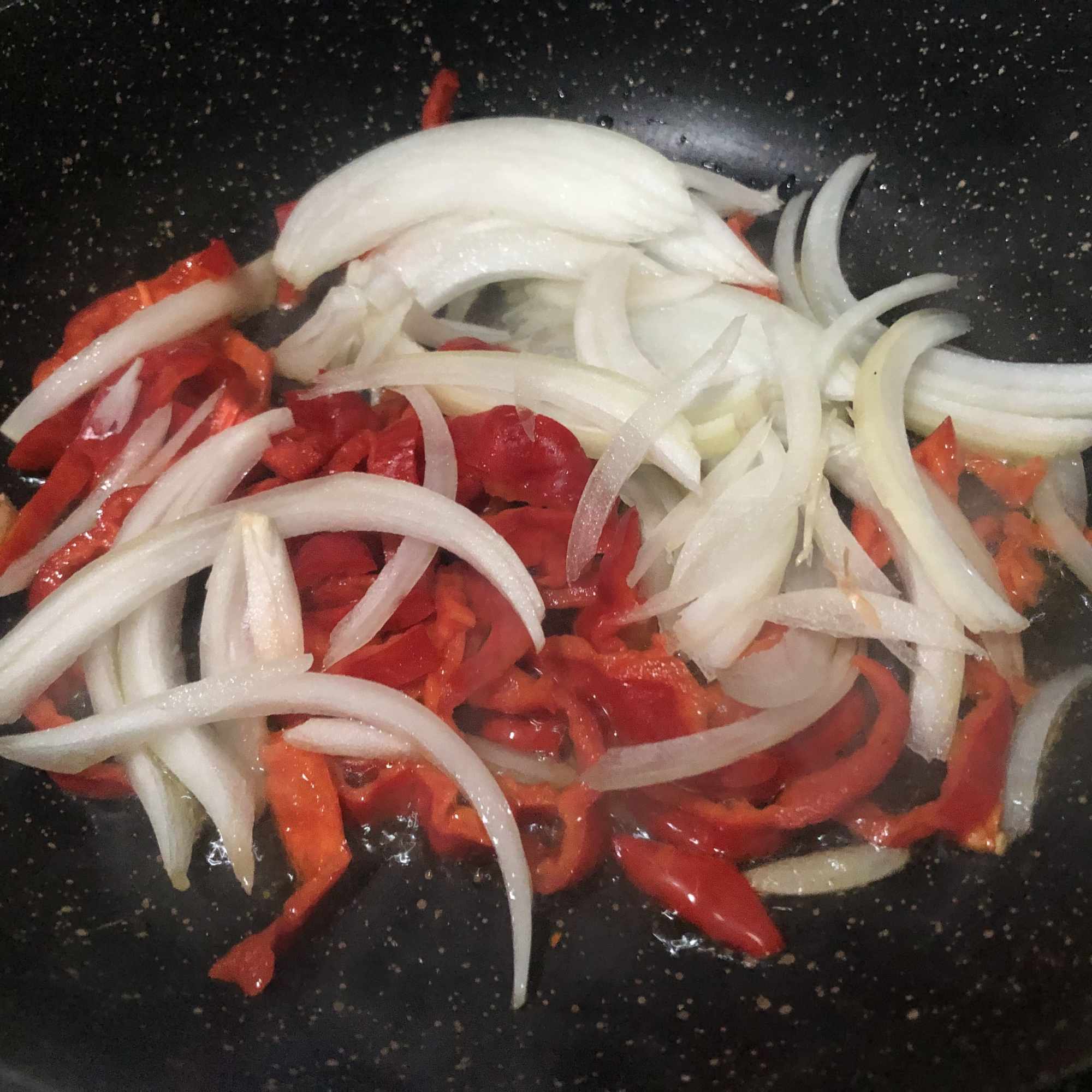 Sofríe la cebolla y el pimiento en una sartén con un poco de aceite y a fuego medio bajo. Sazona y cocina hasta que empiecen a estar blanditas. Agrega las setas, removiendo de vez en cuando para que se cocine todo por igual.