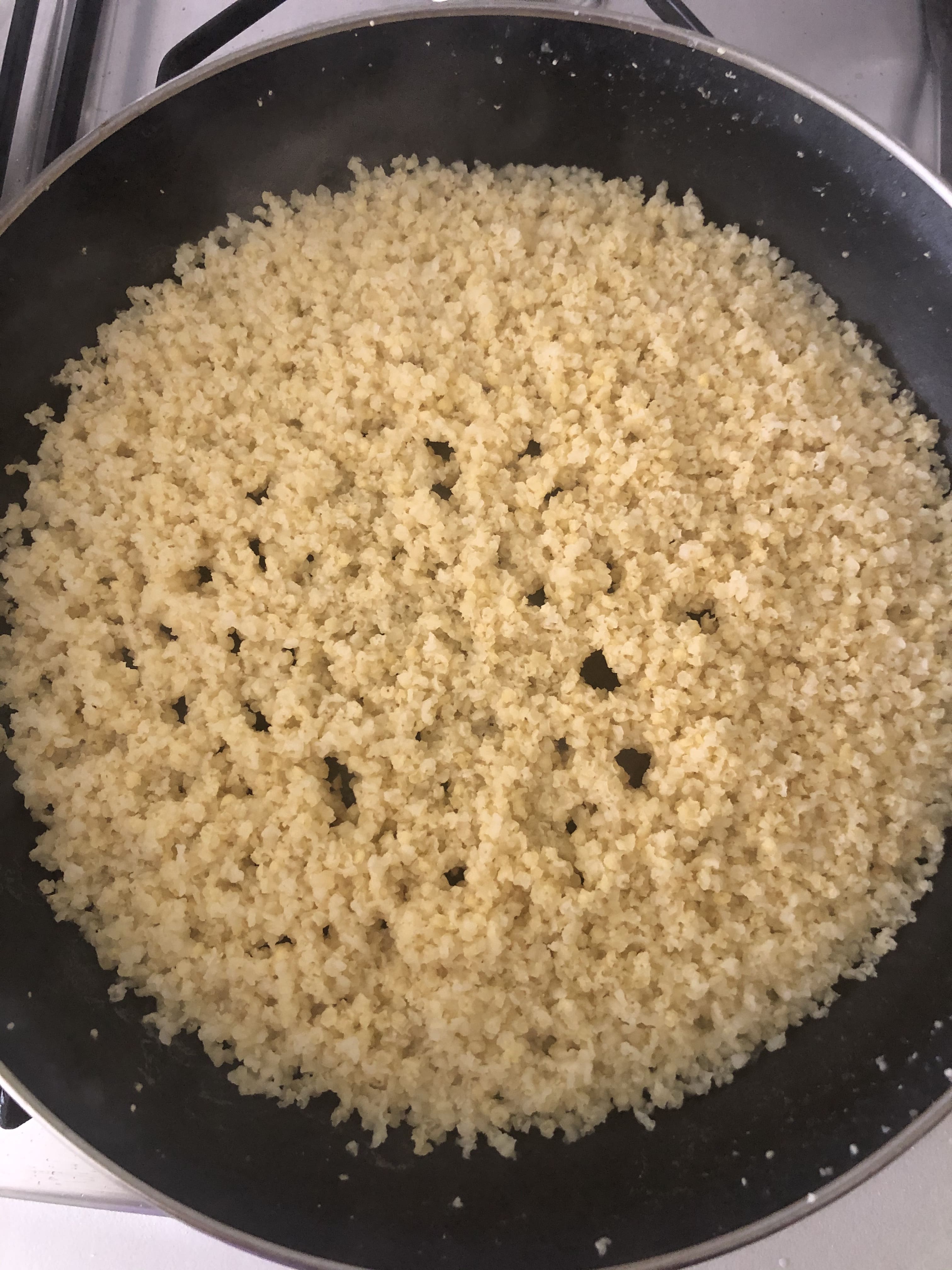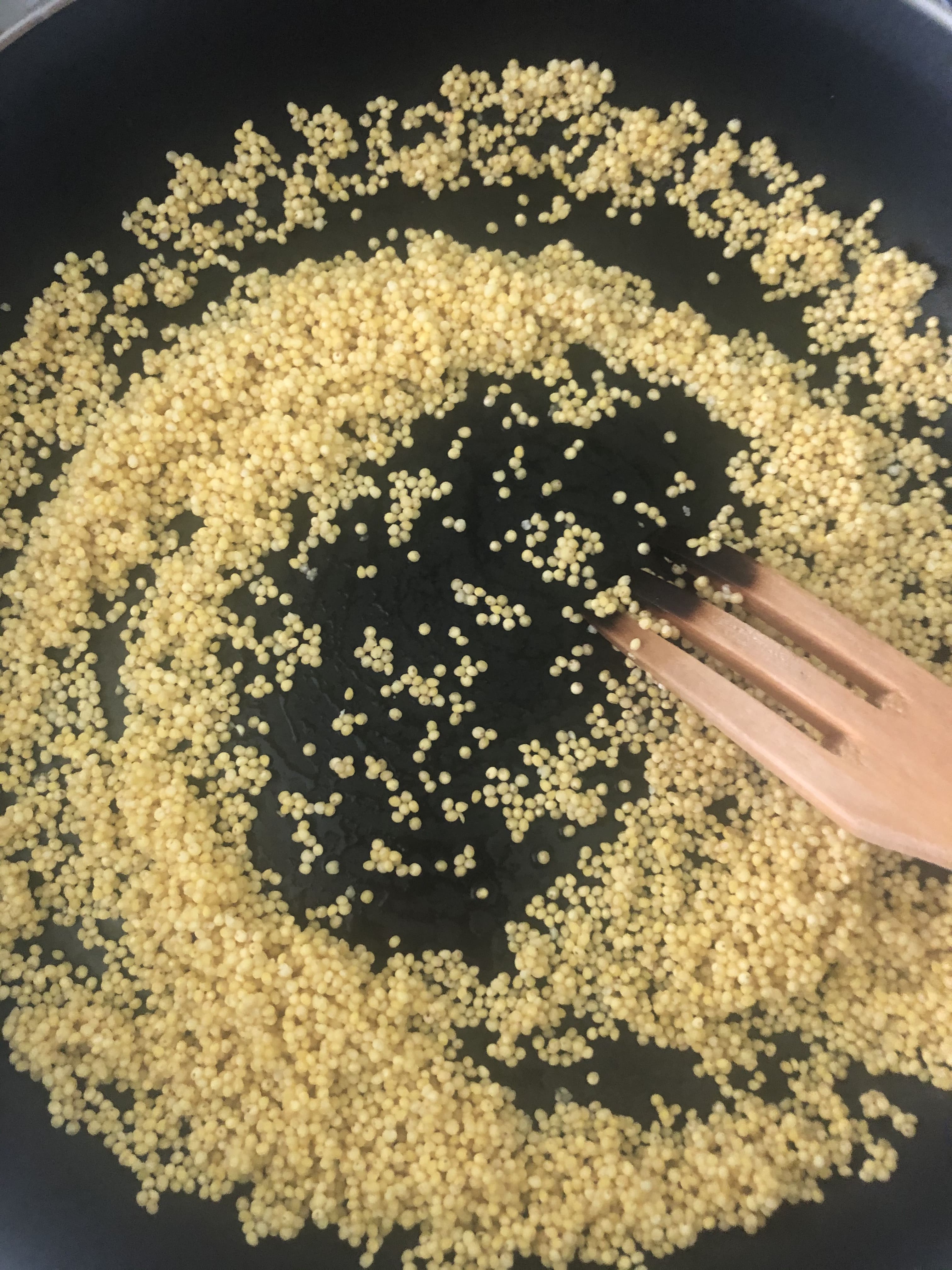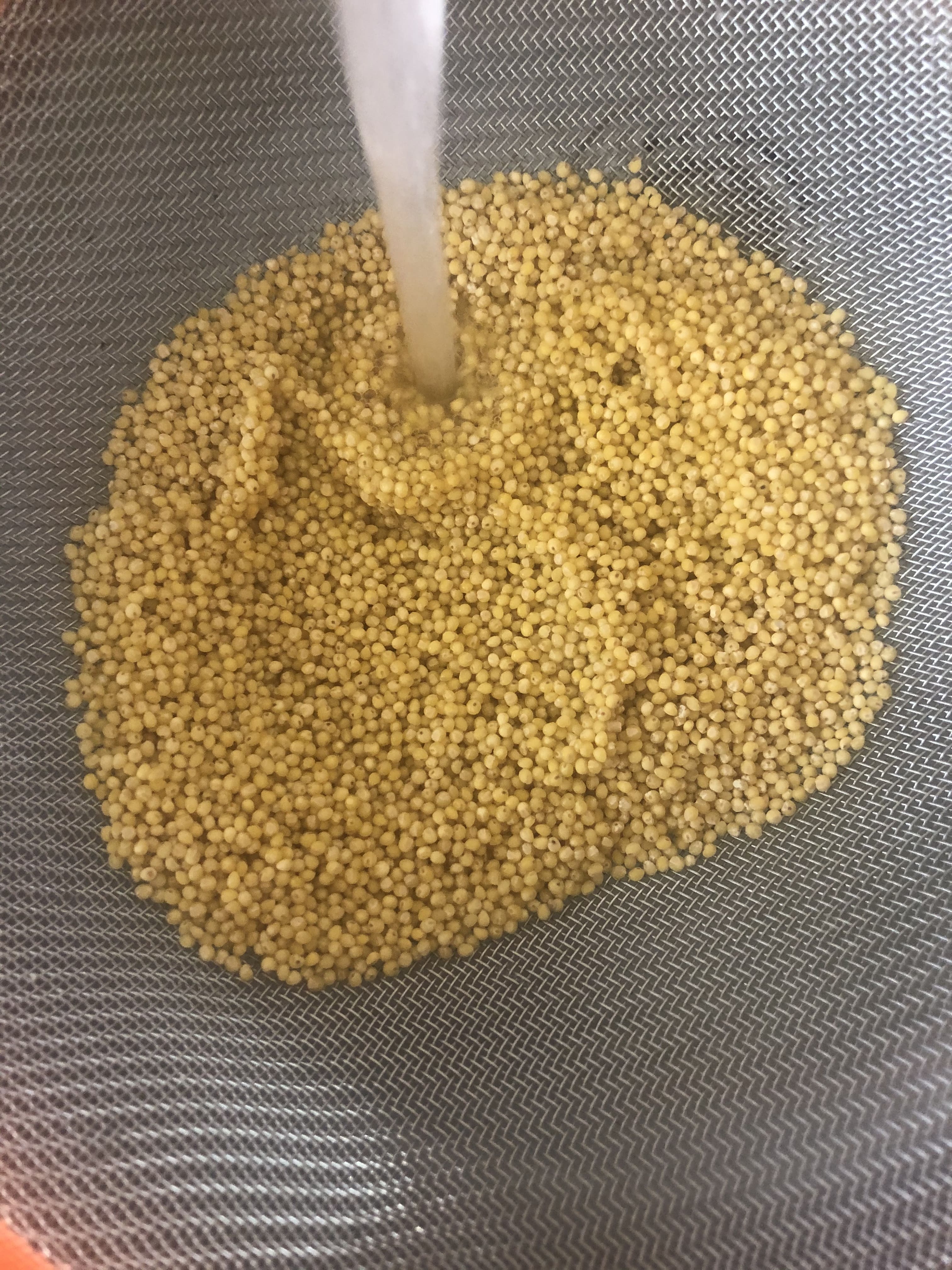 Mientras tanto prepara el mijo. Lava el grano con ayuda de un colador hasta que el agua salga clara. En una sartén sin aceite tuesta el mijo a fuego bajo hasta que empiece a oler a nuez. Agrega el agua, sube el fuego y lleva a ebullición. Cubre con una tapadera, baja el fuego al mínimo y cuece 15-20 minutos o hasta que absorba toda el agua. Deja templar.
