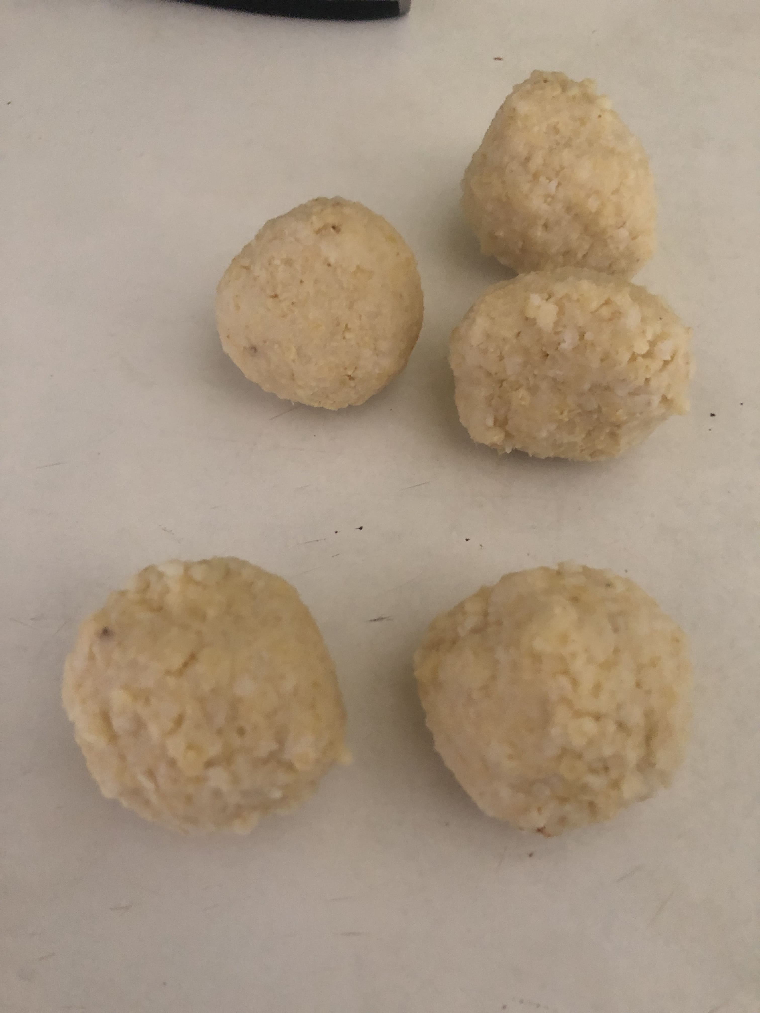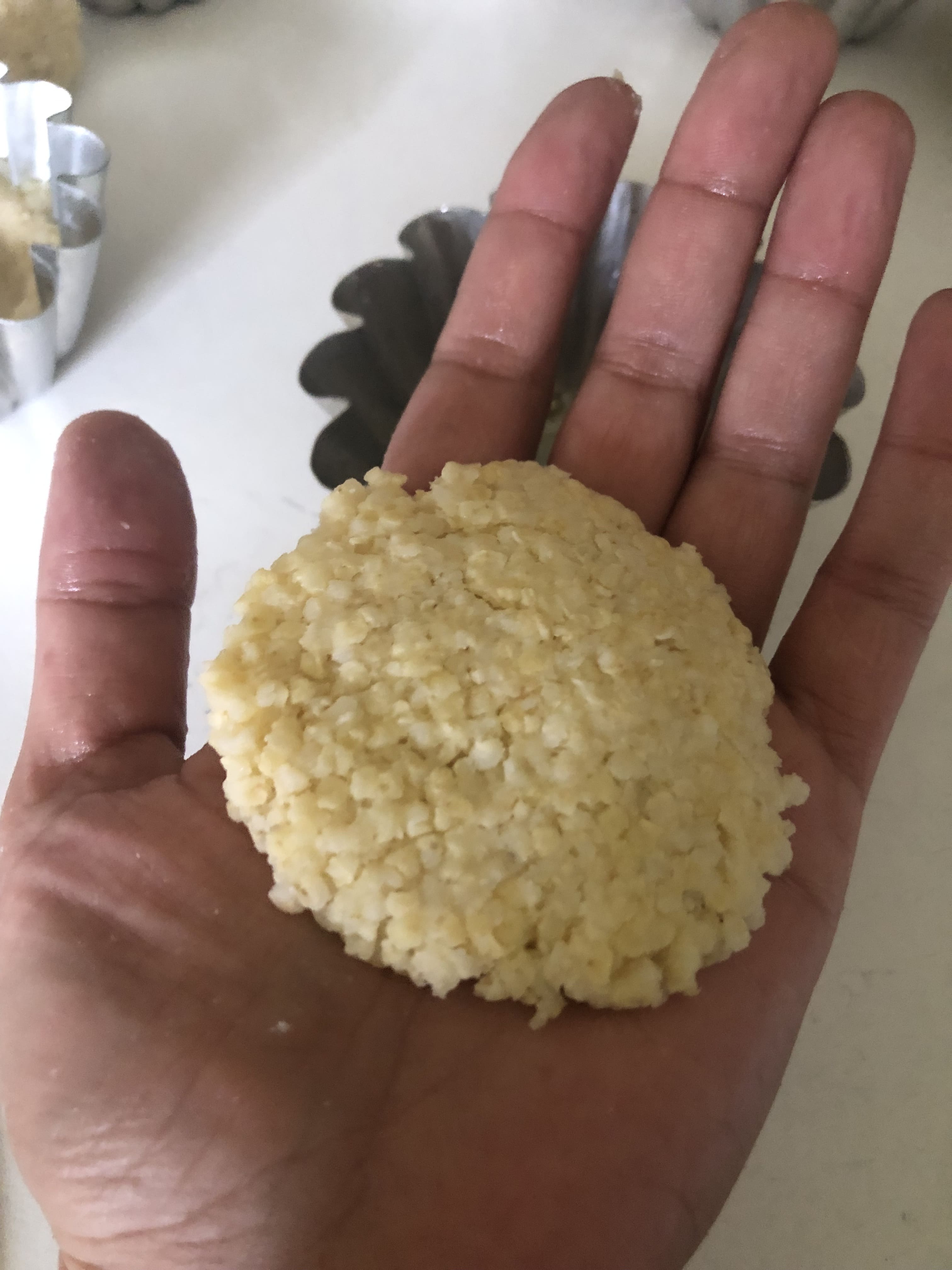 Prepara las cestitas: con las manos un poco húmedas haz bolitas de masa de unos 40 gr y aplástalas un poco. Engrasa el molde (yo he utilizado flaneras) y coloca en el fondo, presionando bien los bordes para dar forma.