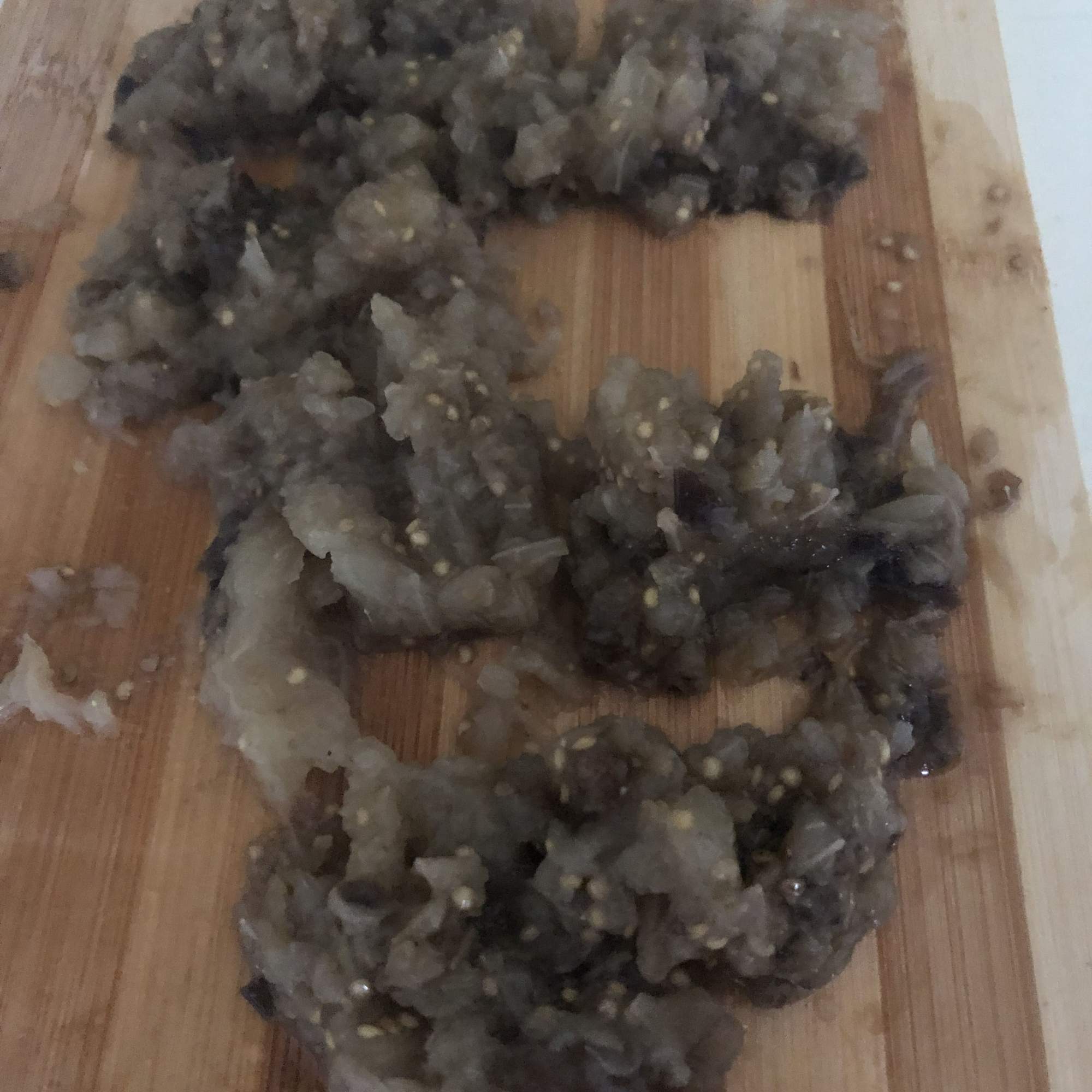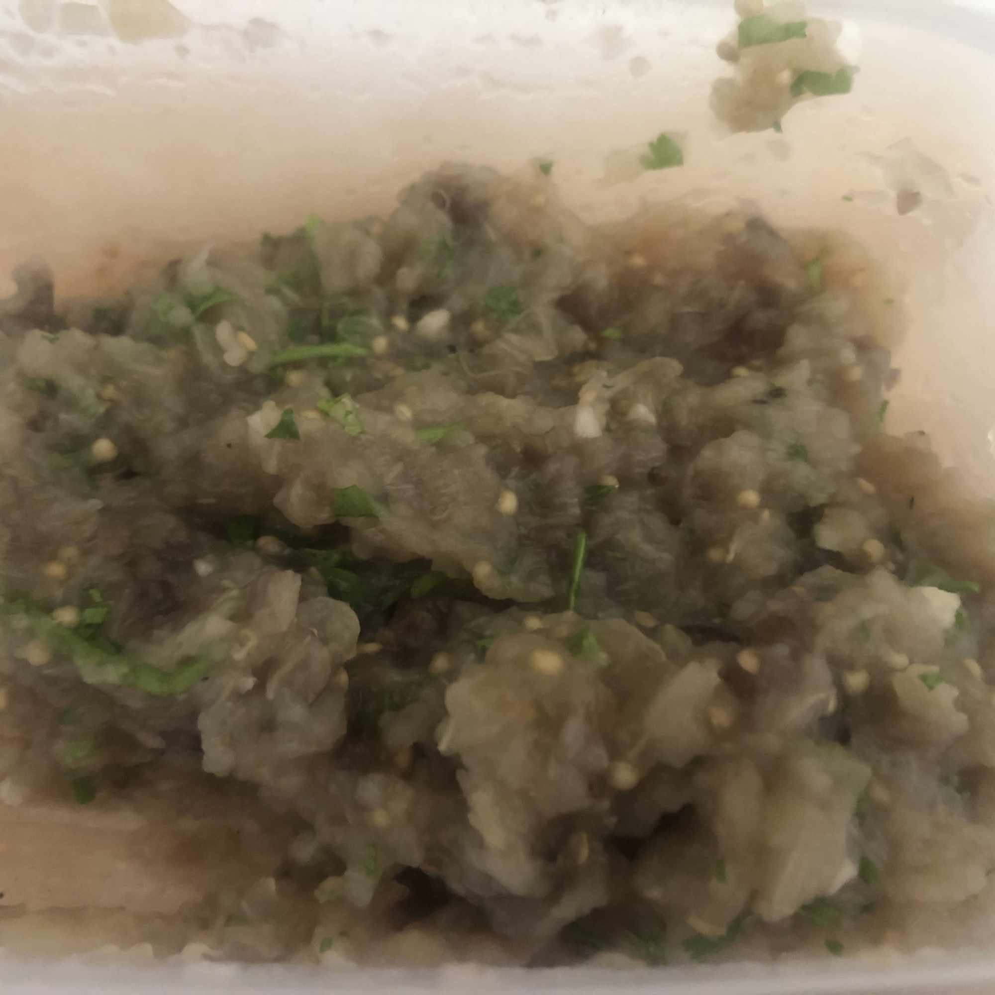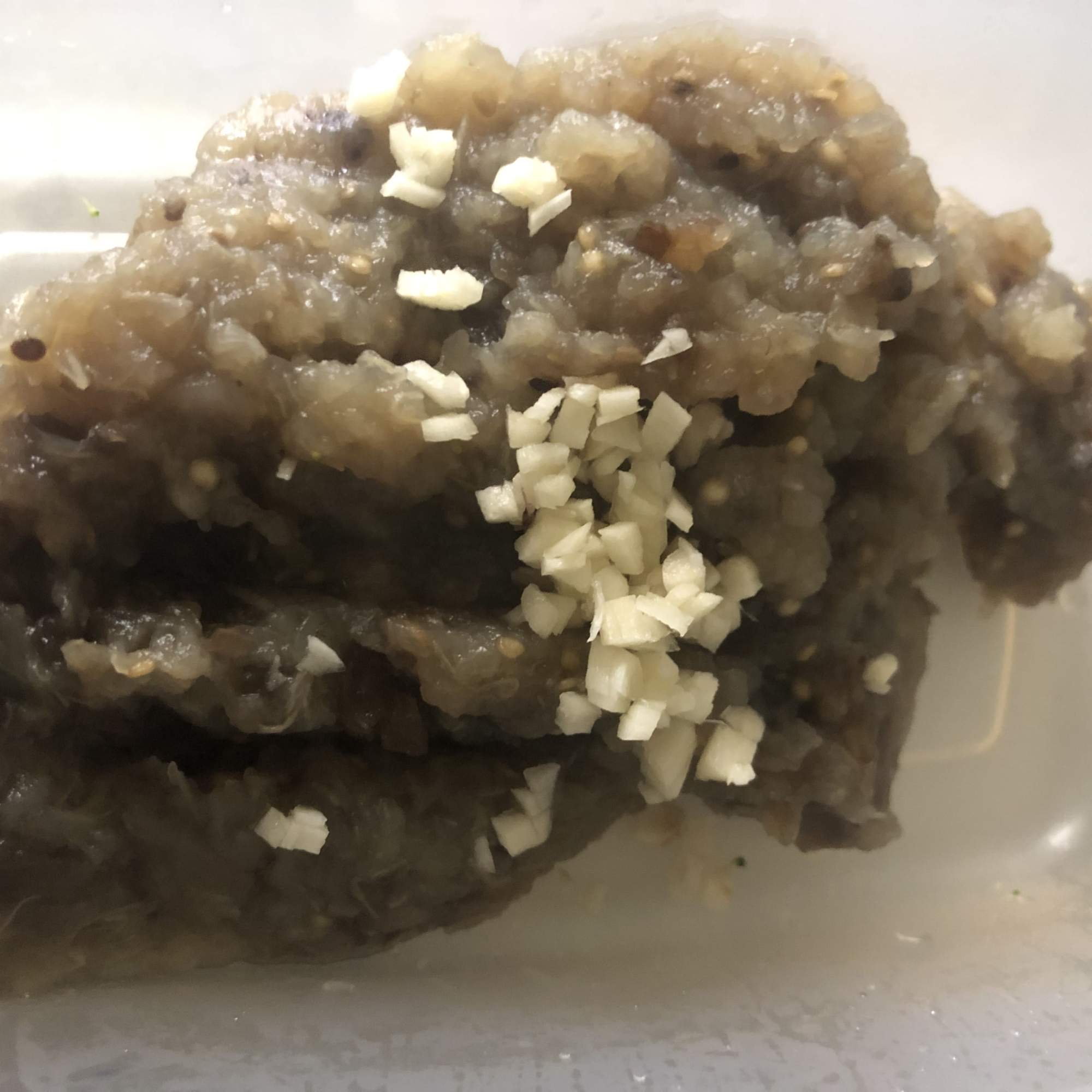 Termina de preparar la ensalada: retira la piel de la berenjena y las semillas (si quieres). Tritura finamente con un cuchillo. Pica el ajo y el perejil finamente y añade a la berenjena. Sazona a tu gusto y agrega el zumo de limón. Mezcla todo bien y reserva.