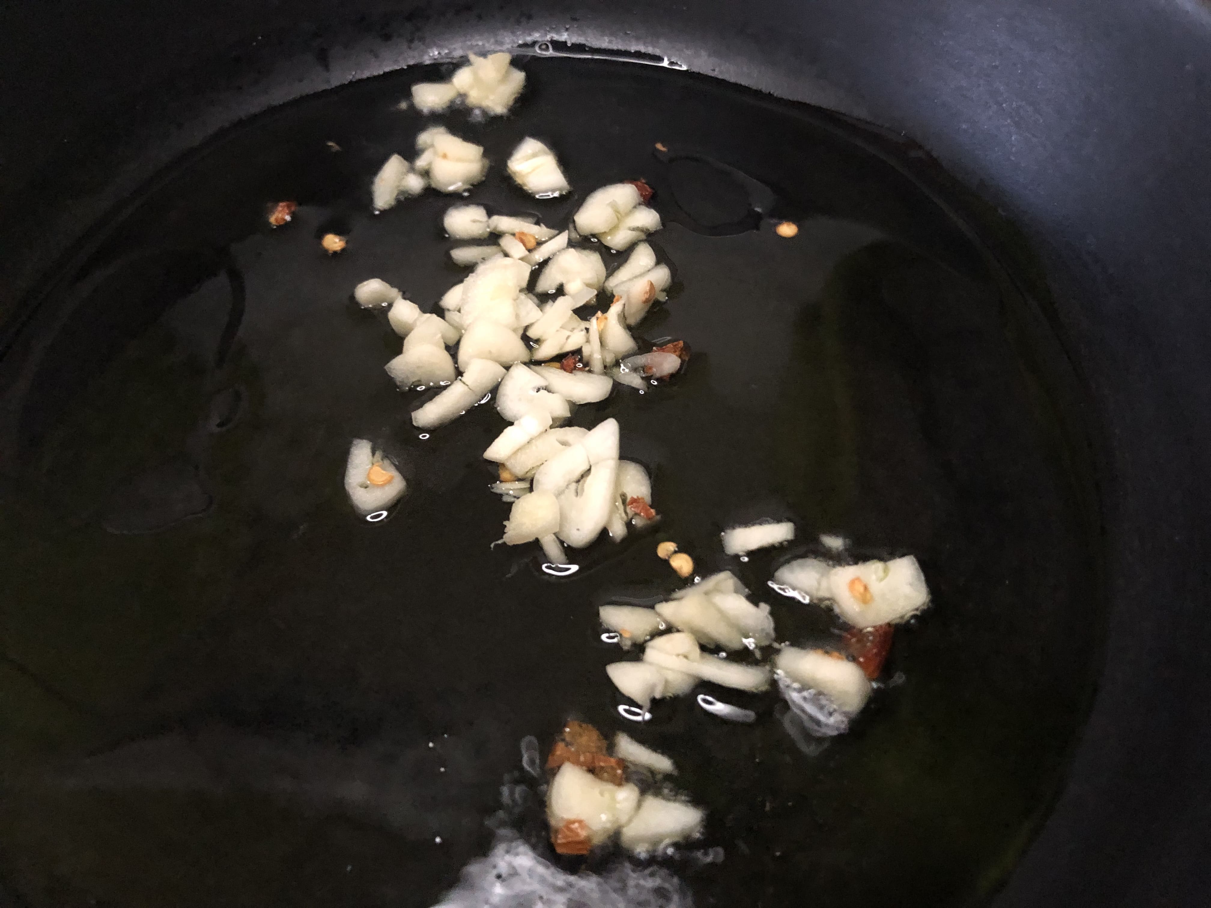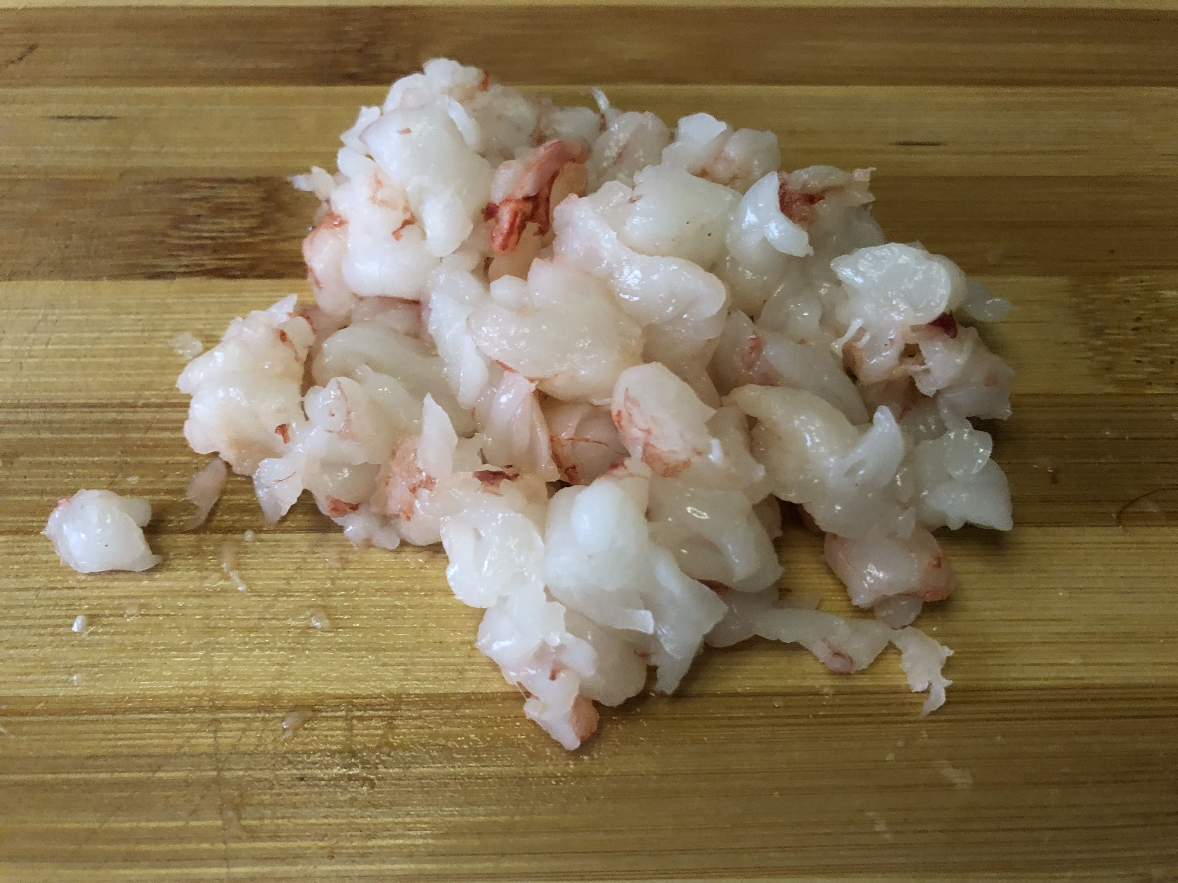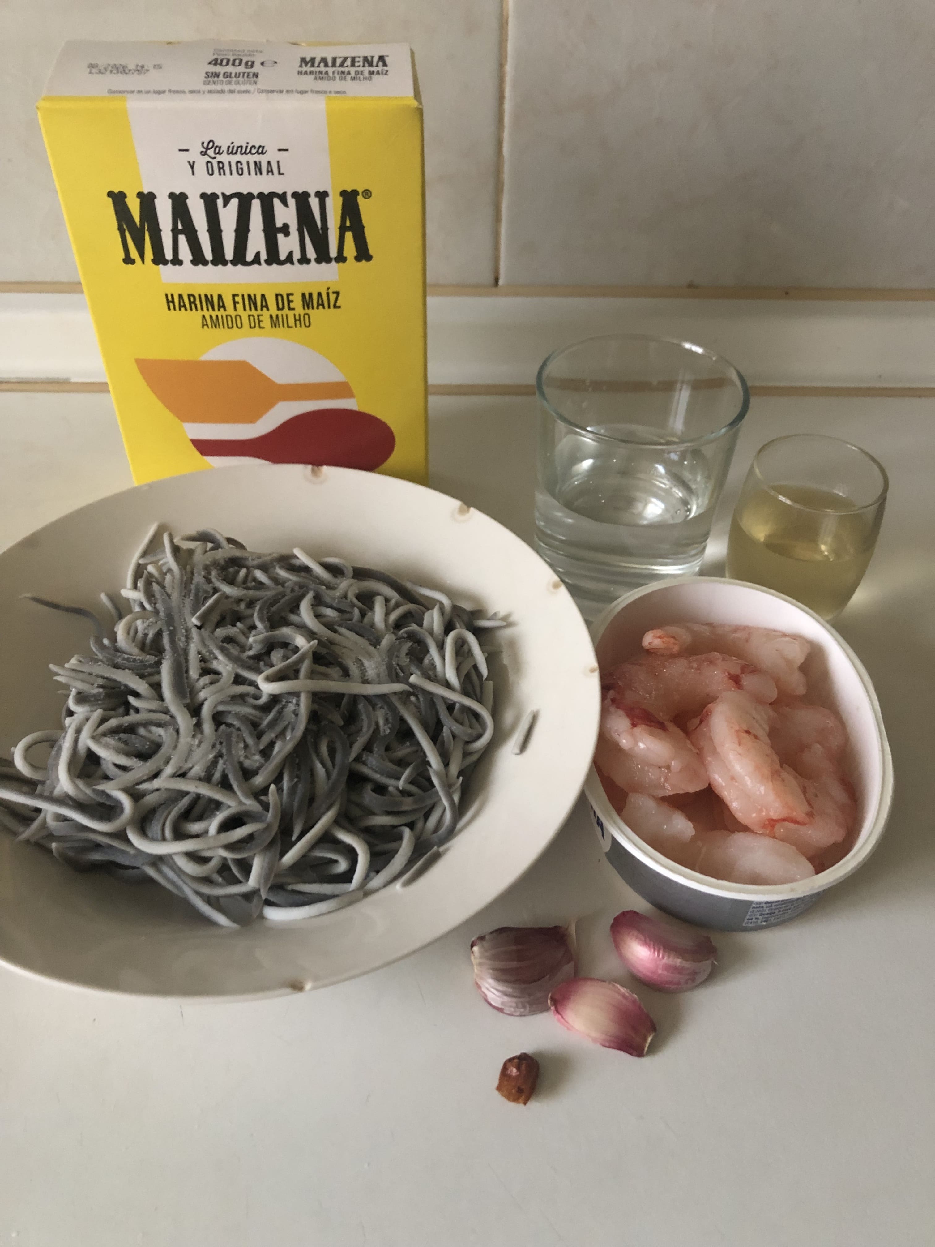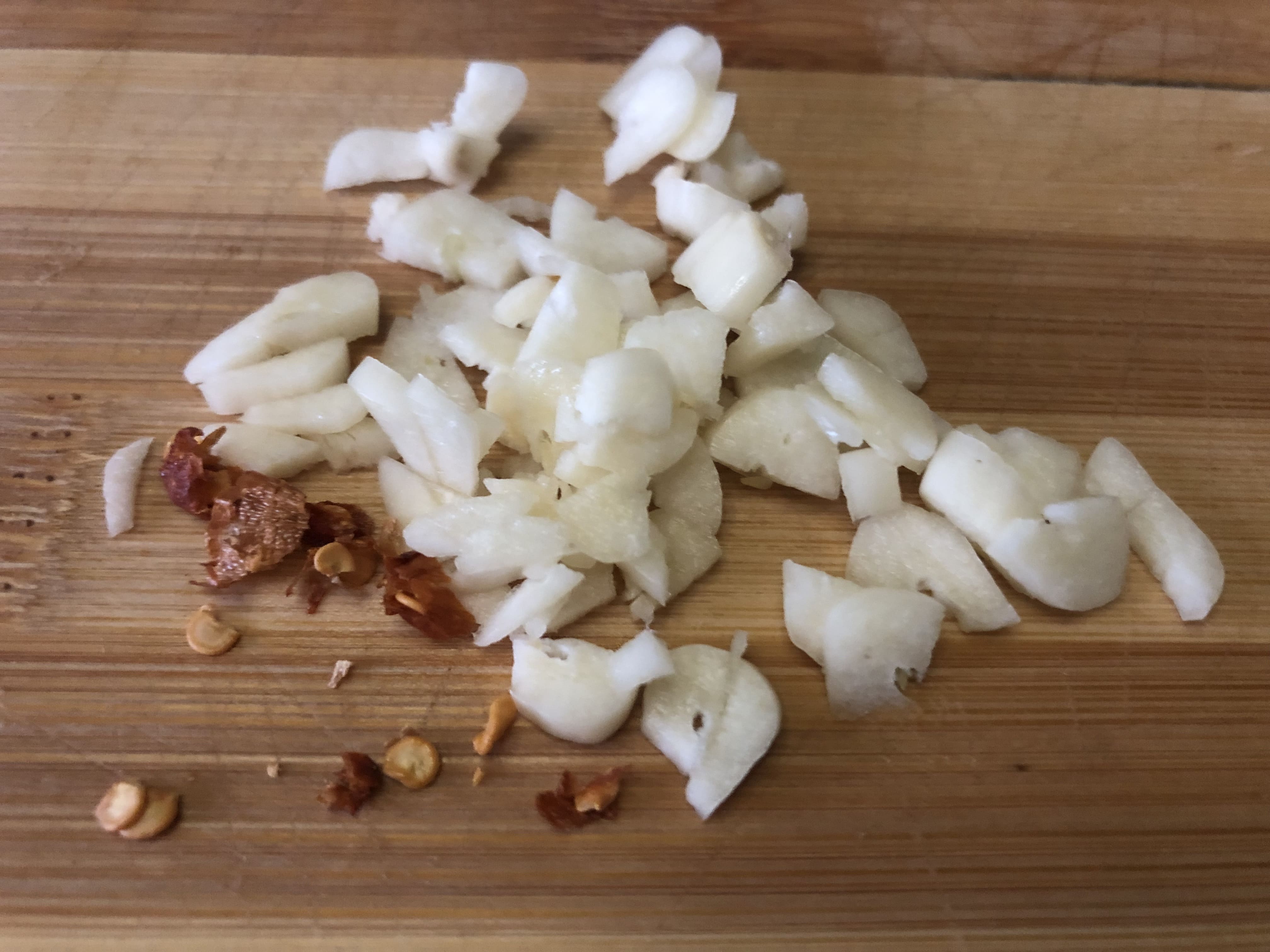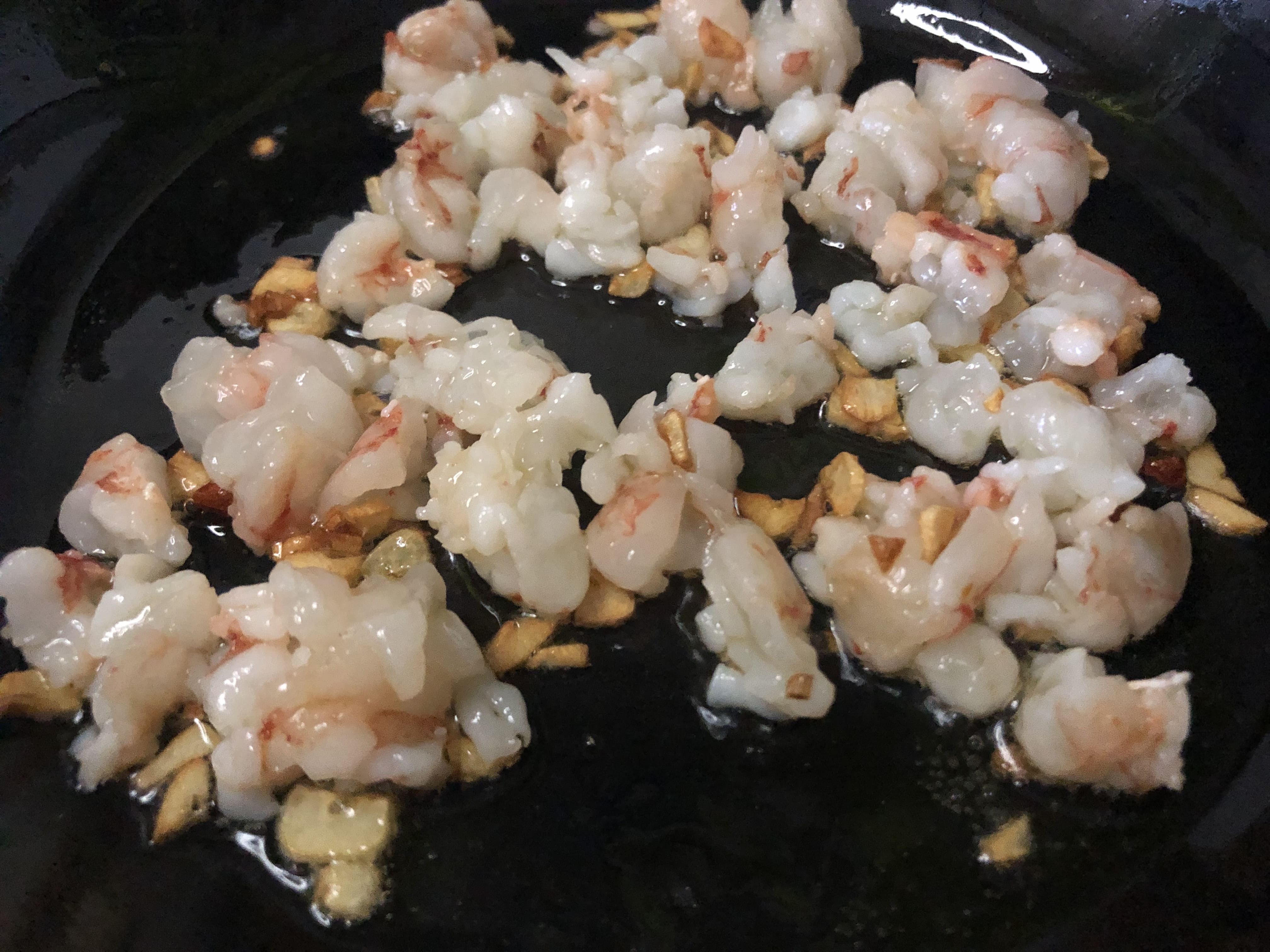 Pela el ajo y corta en láminas. Pica la guindilla muy fina. Pica también los gambones.