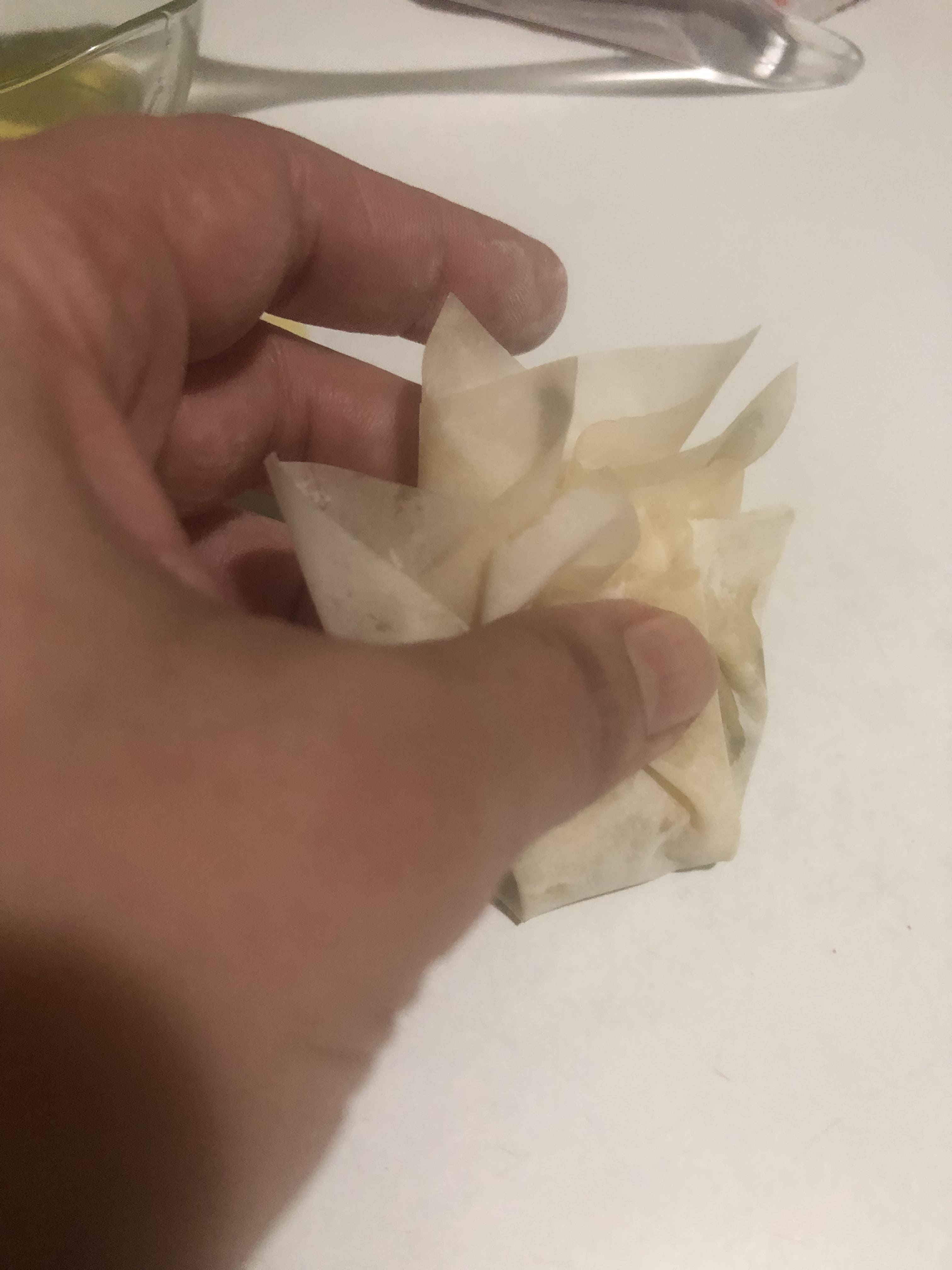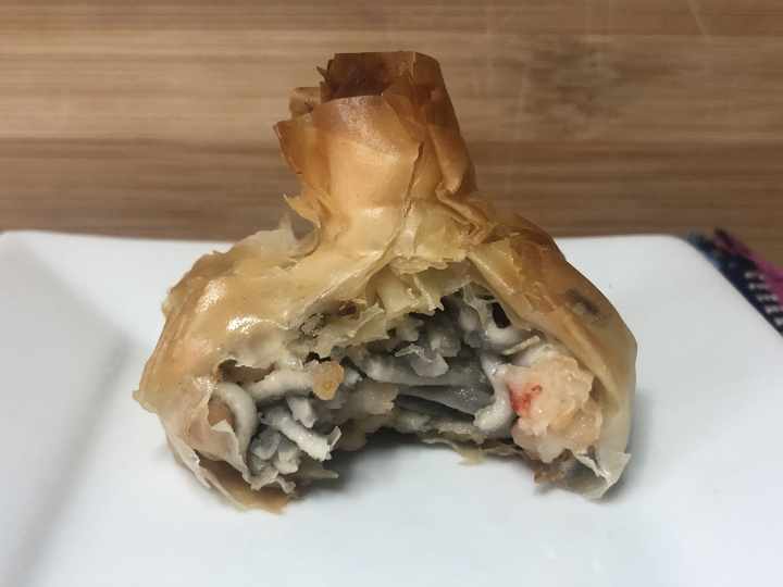 Llevaba mucho tiempo con ganas de probar la masa filo y pensé que este era un momento ideal para hacerlo. Había visto muchas ideas en la red sobre recetas con esta masa y me llamaba sobremanera la atención unos saquitos rellenos, así que me puse manos a la obra siguiendo las instrucciones que había visto en la mayoría de recetas. Resultado: un desastre y varios intentos hasta conseguir el resultado que esperaba.