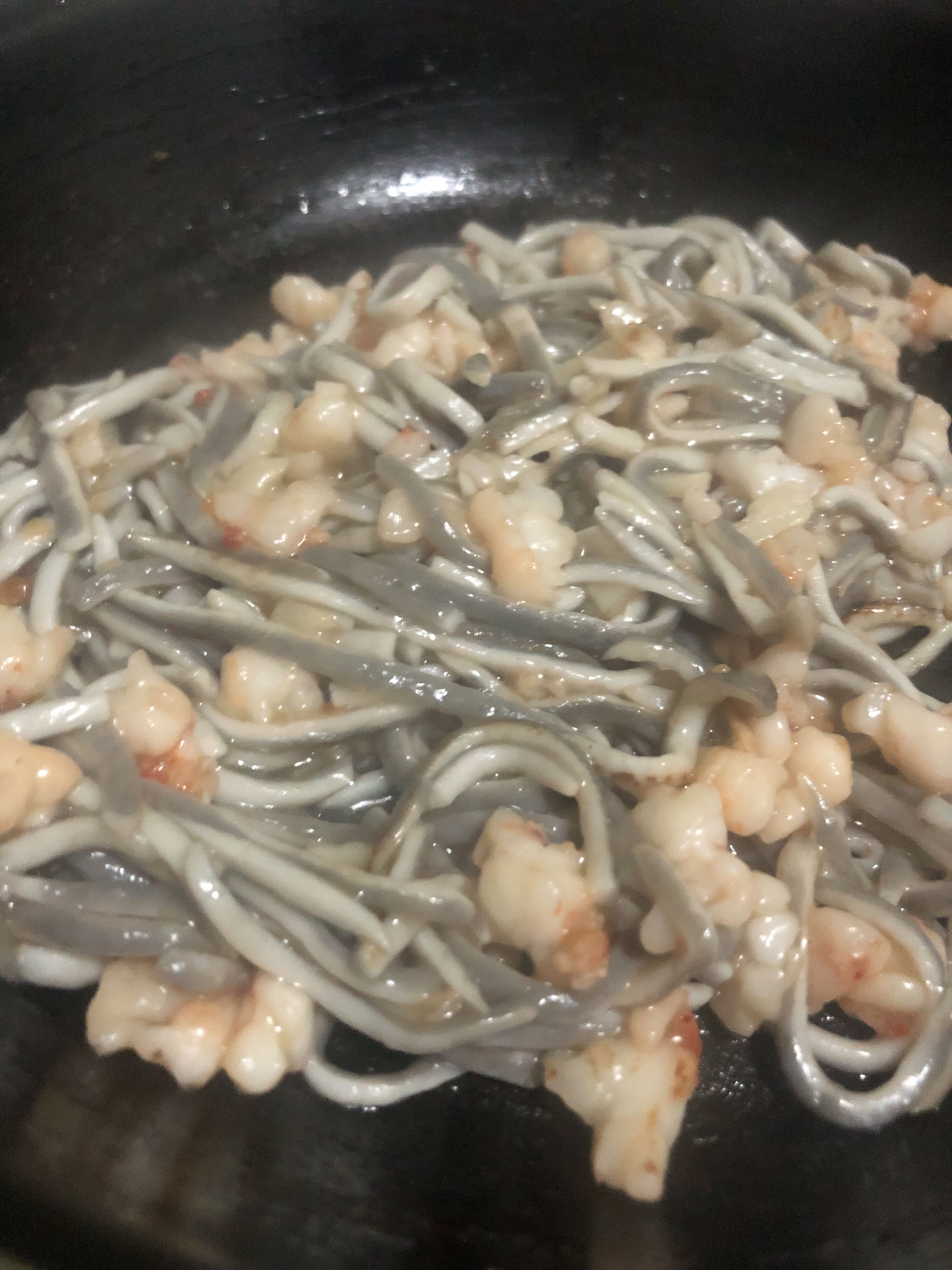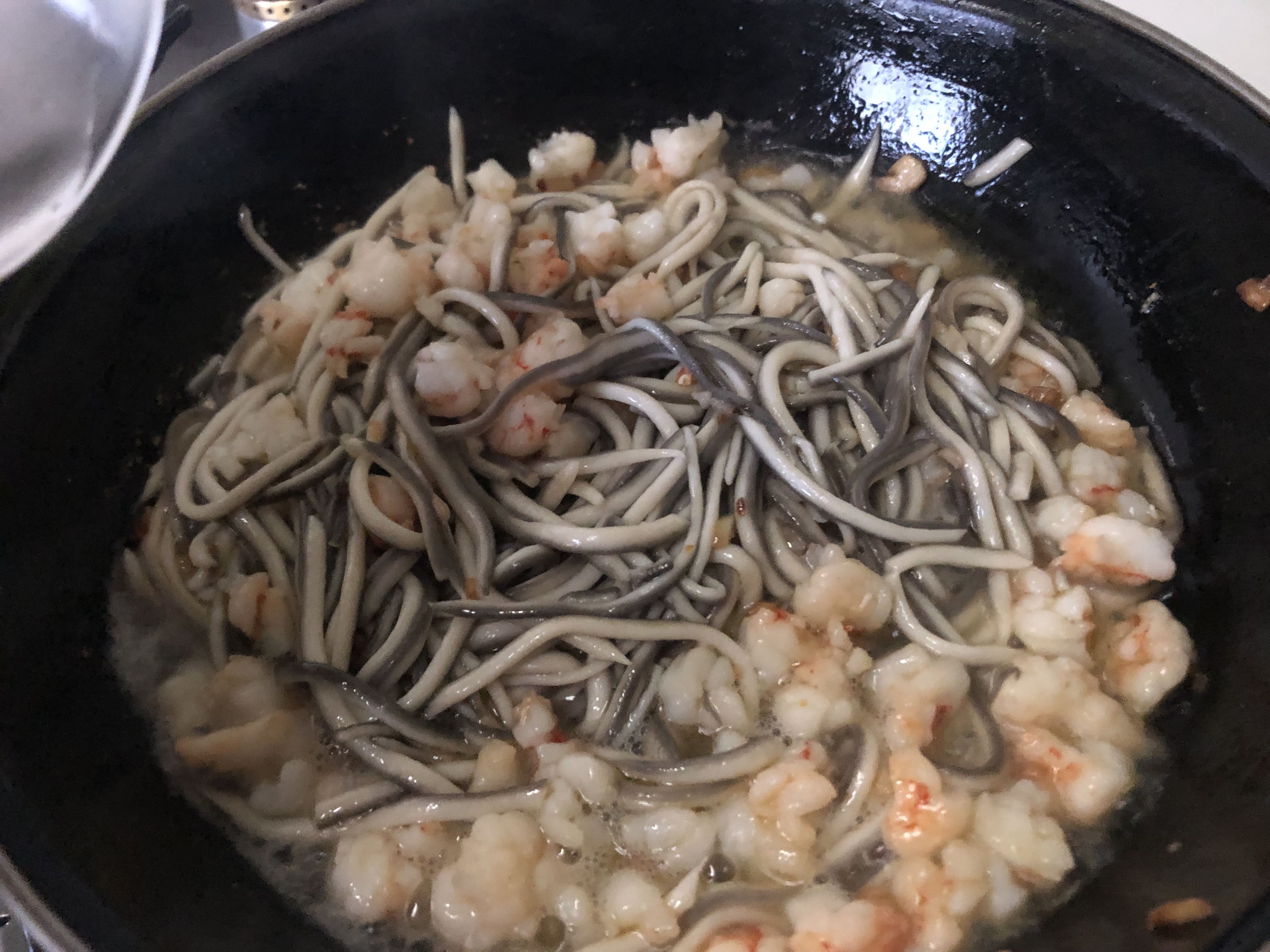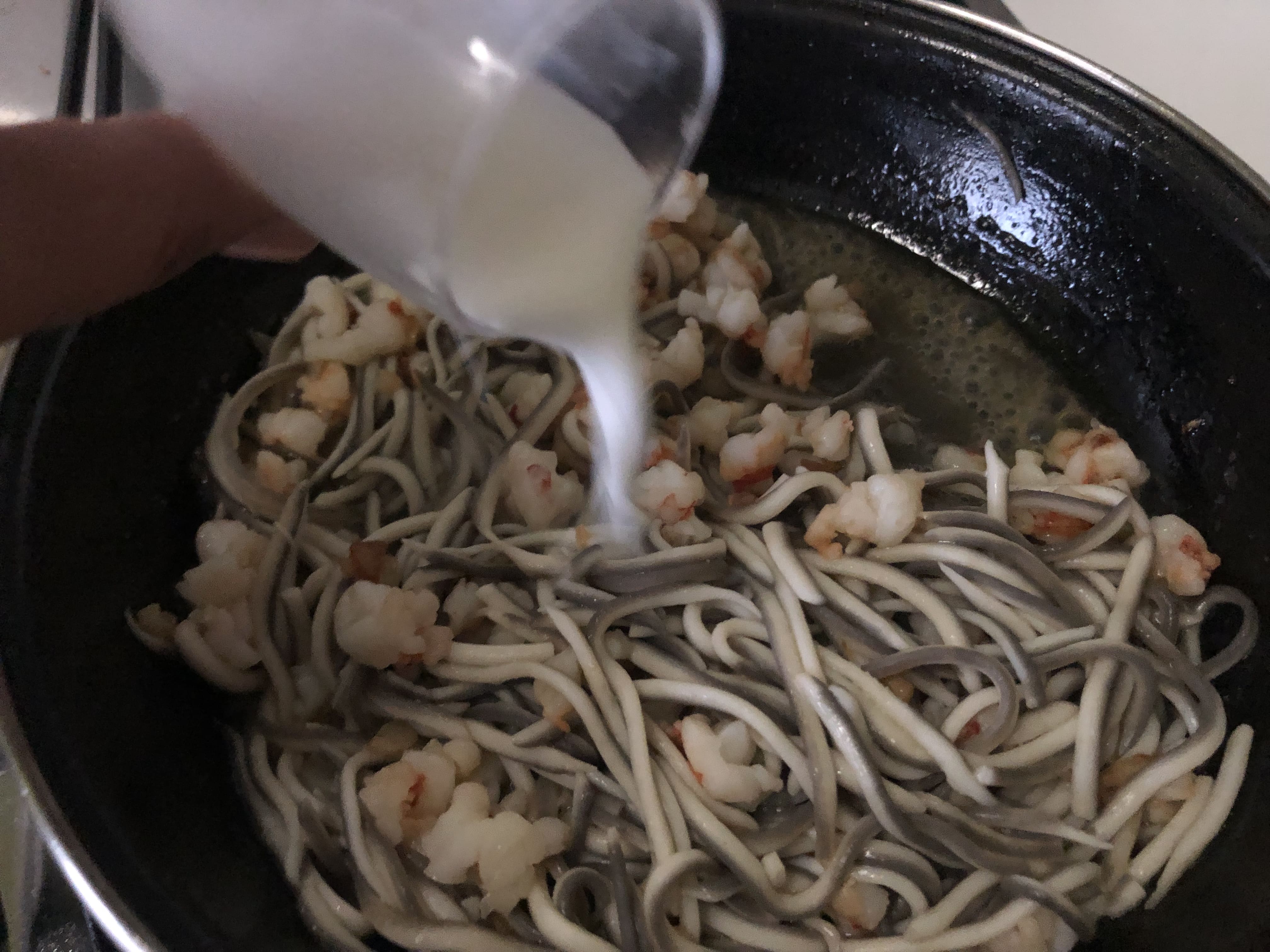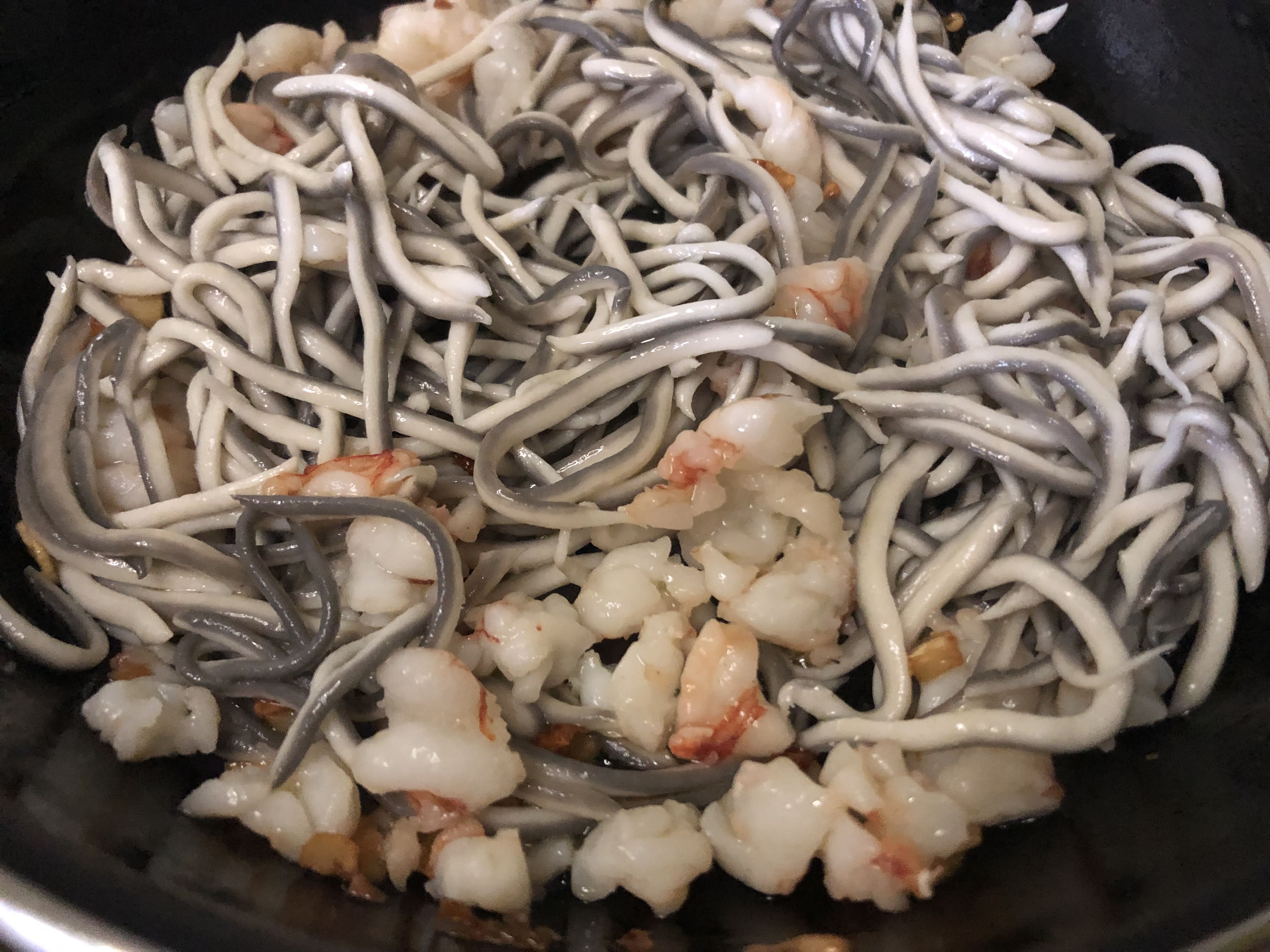 Calienta un poco de aceite y saltea, no dejes que el ajo se dore. Agrega los gambones y cocina hasta que cambien de color. Añade entonces las gulas y cocina todo a fuego bajo durante unos minutos.