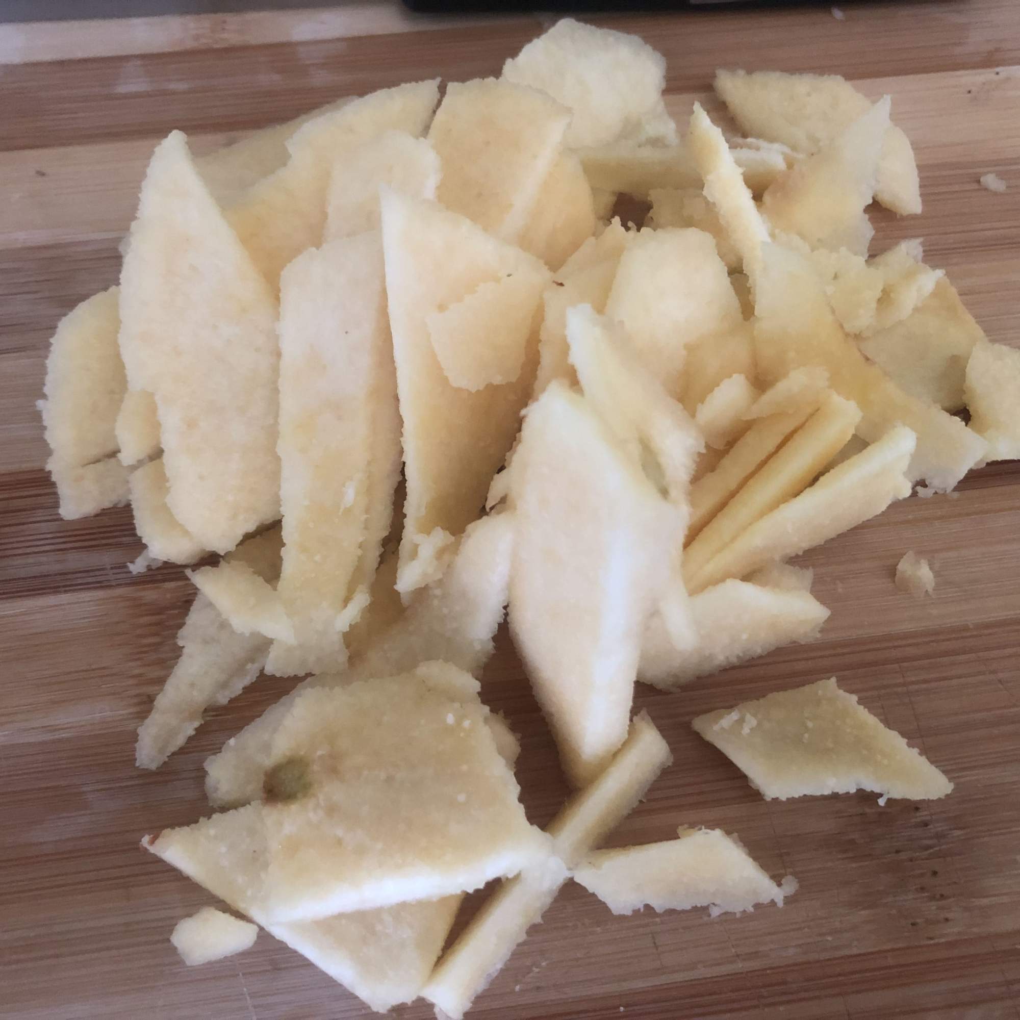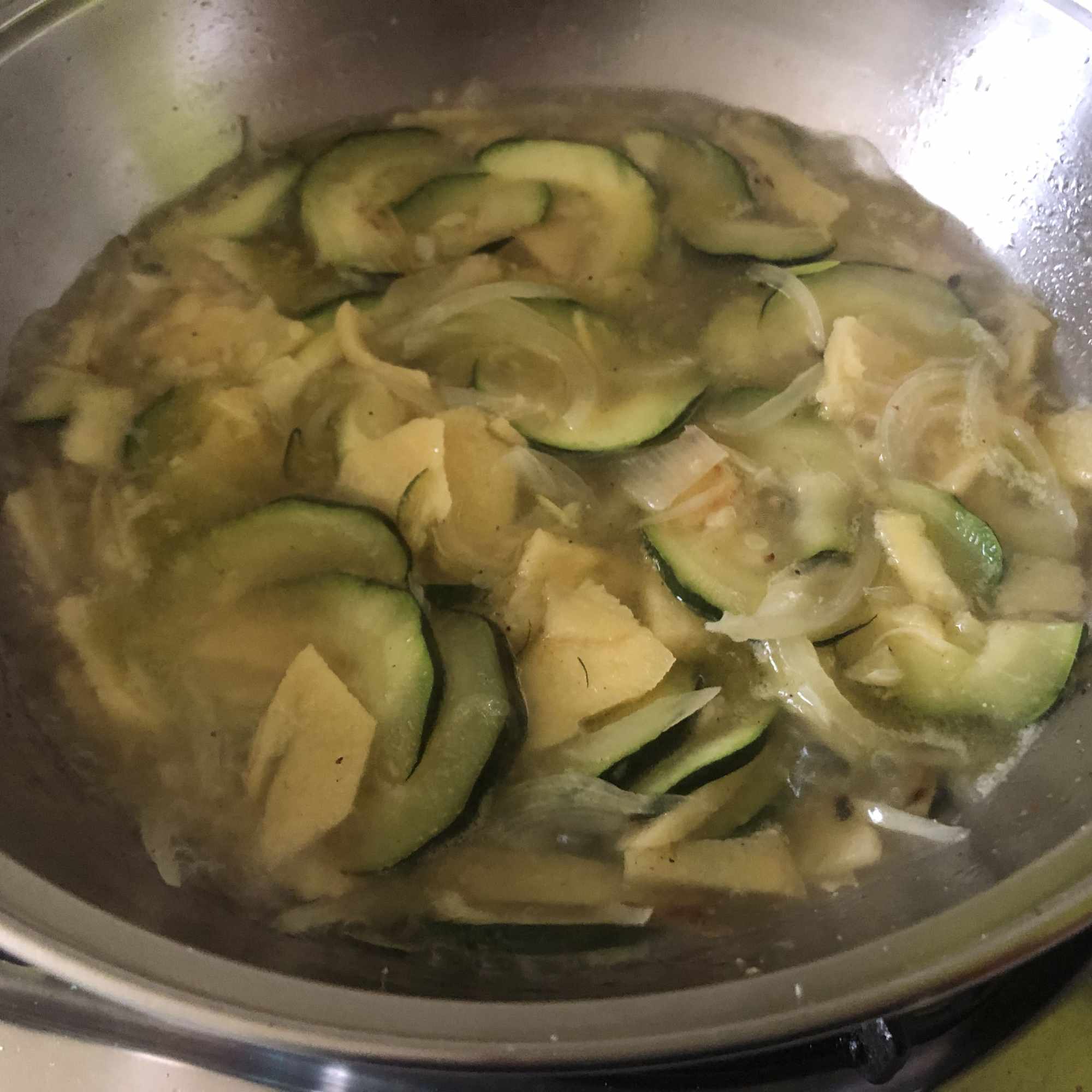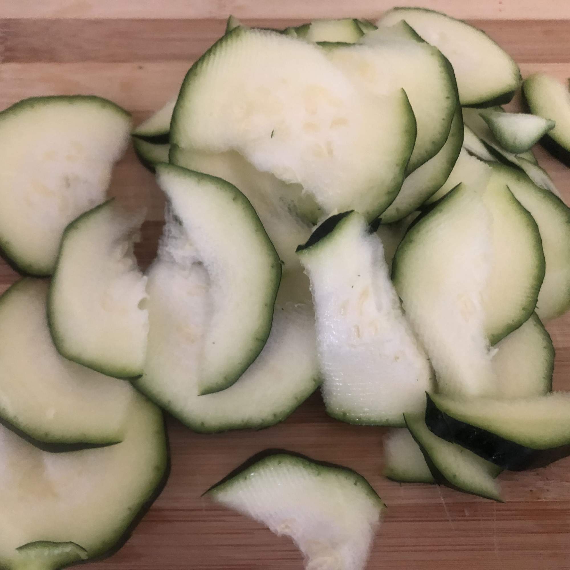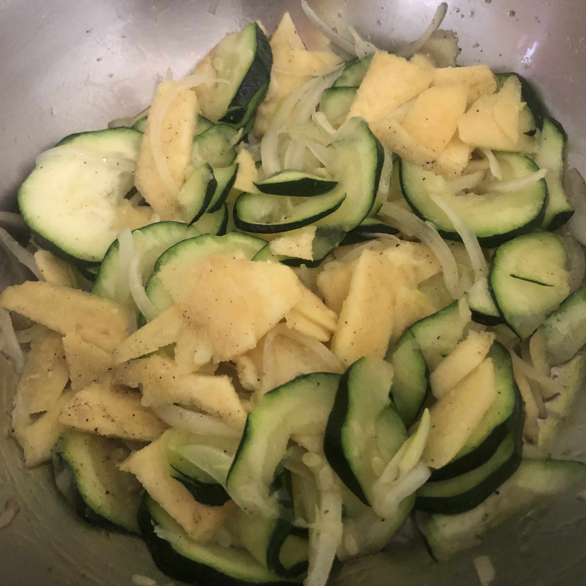 Lava el calabacín y corta en láminas finas. Pela y corta el membrillo en láminas y la cebolla en juliana.