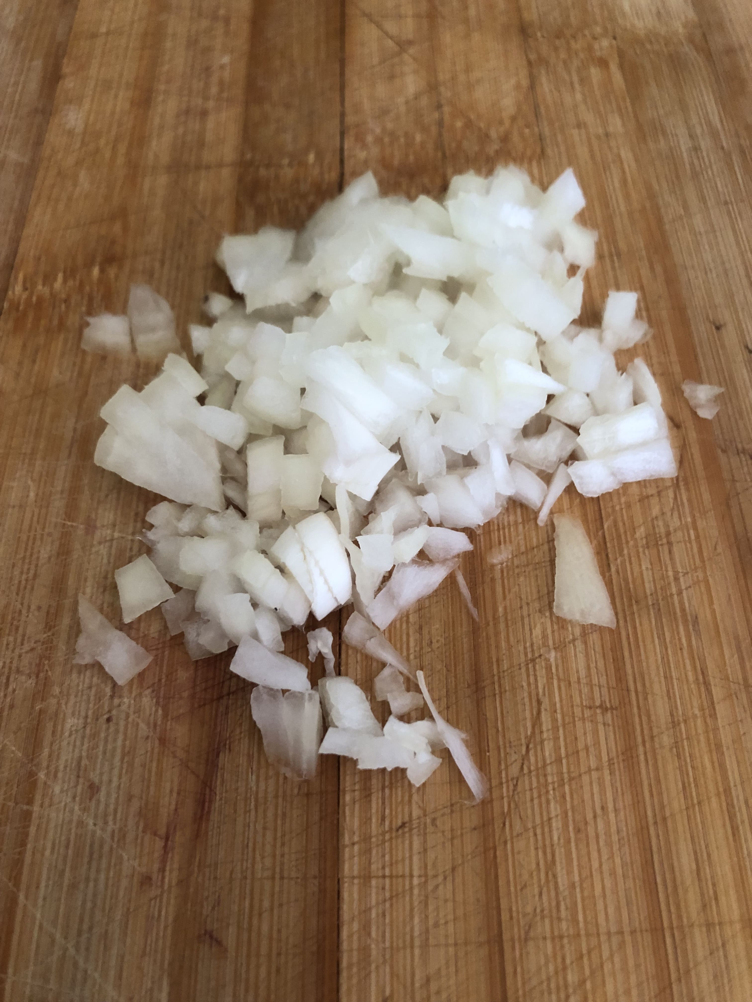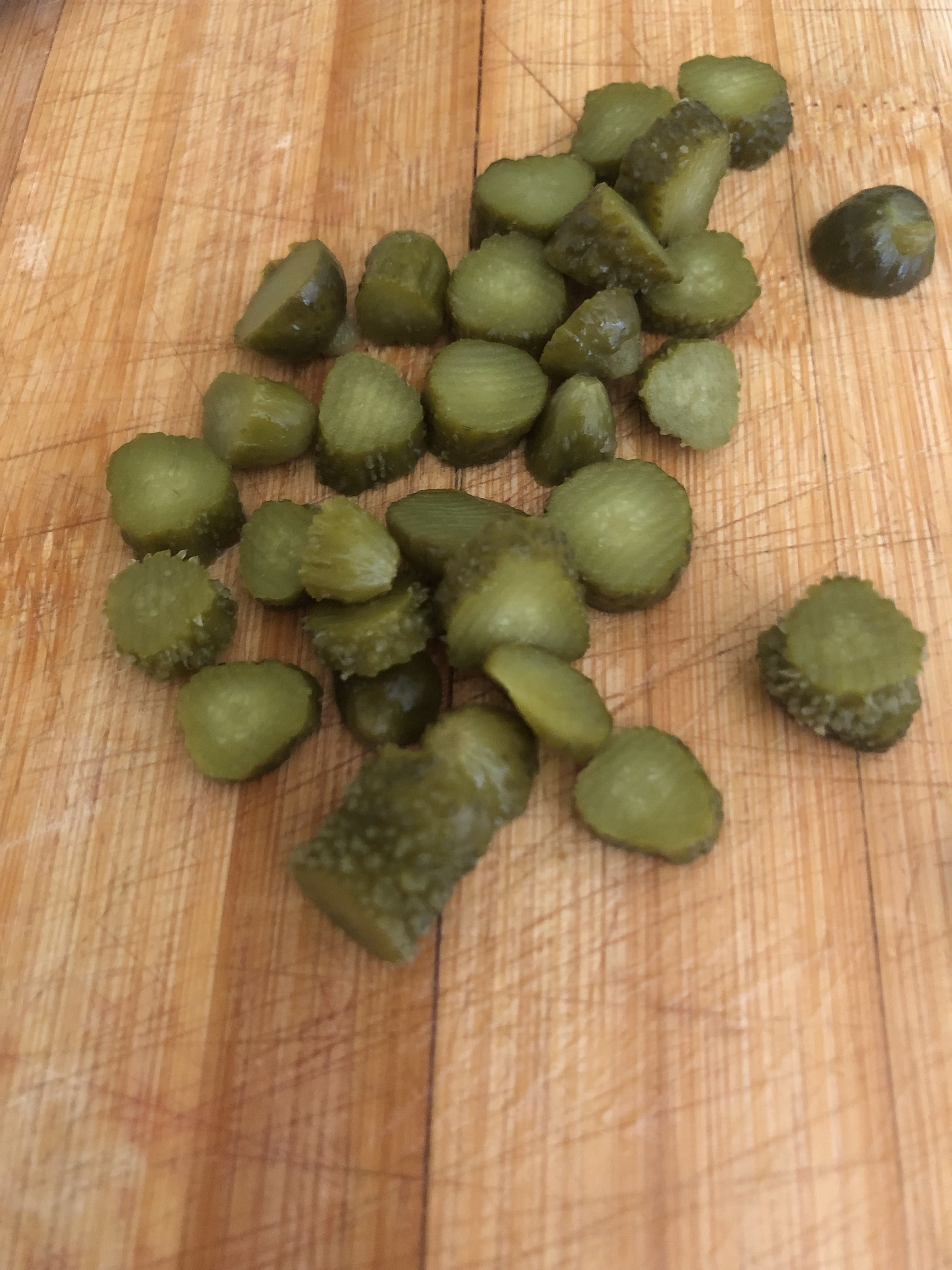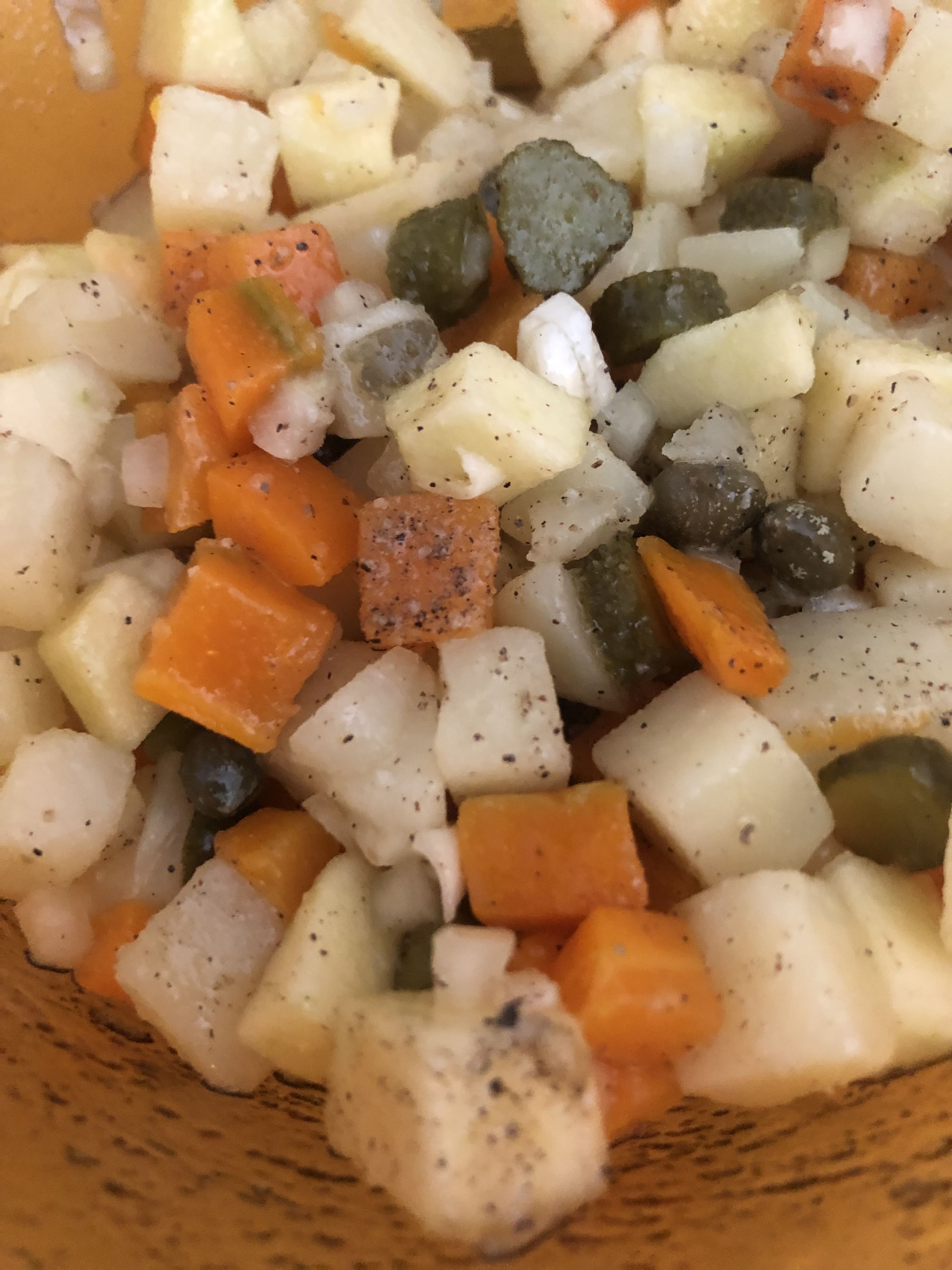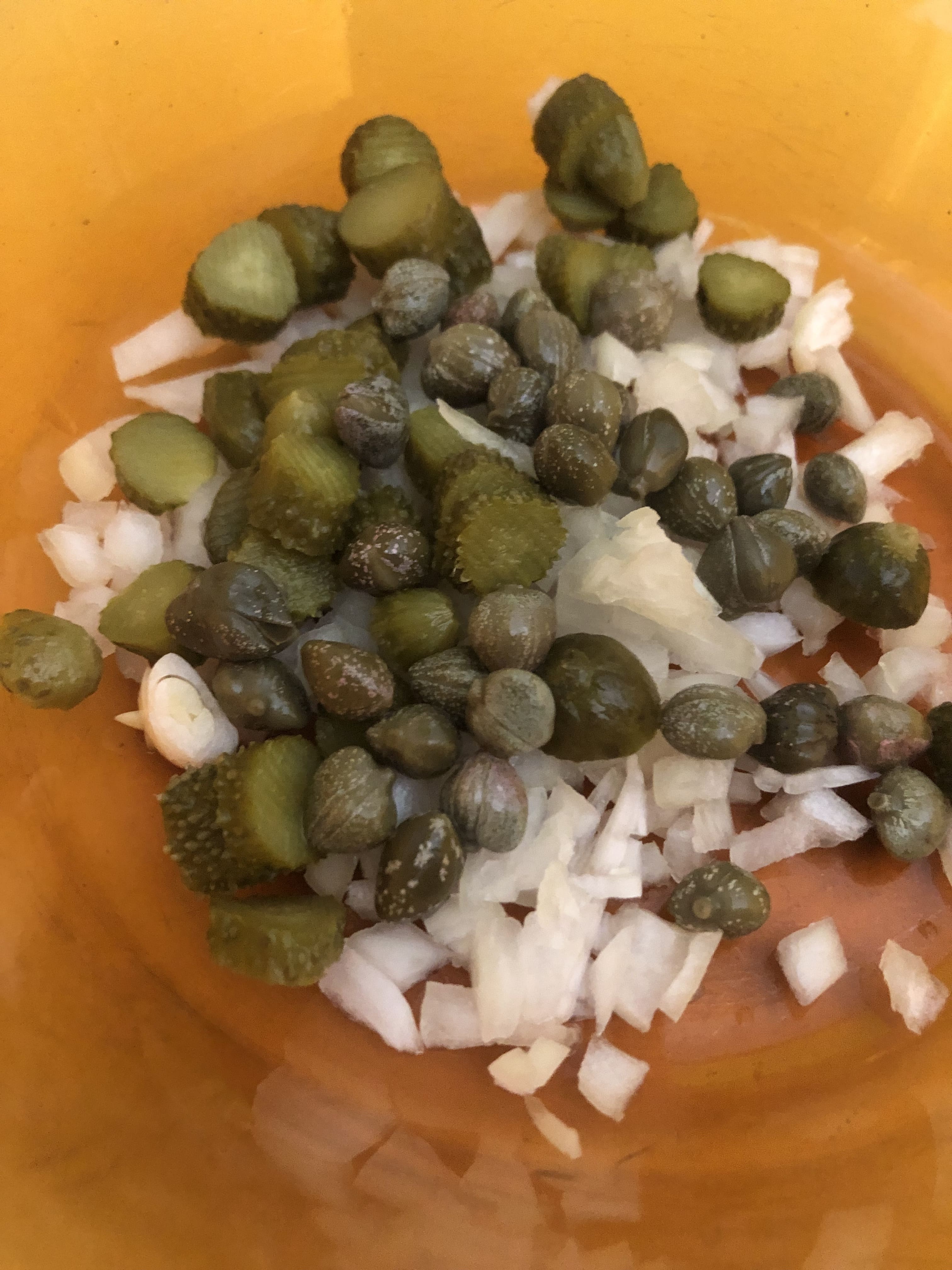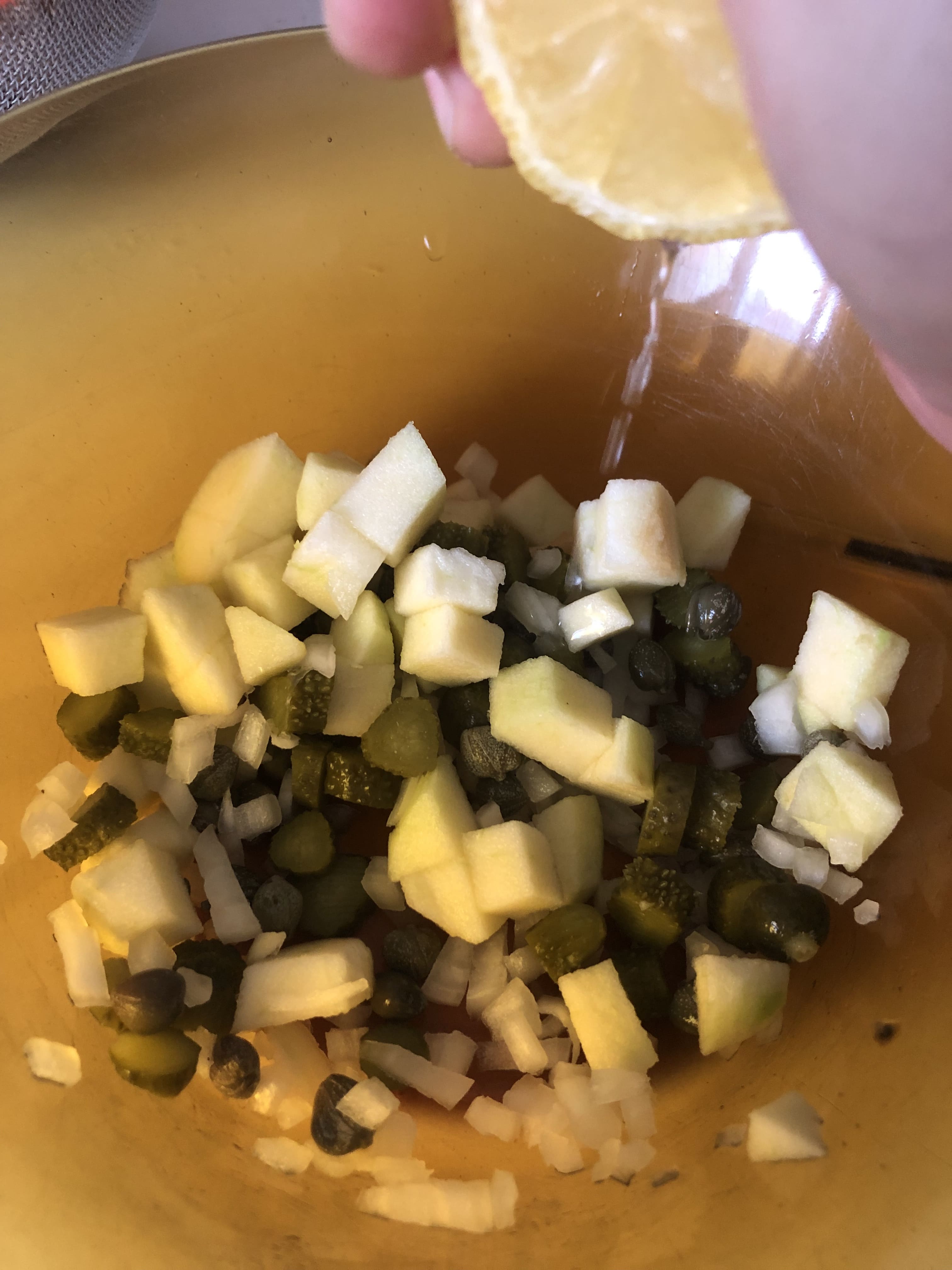 Pela la manzana, corta en cubos y rocía con un poco de zumo de limón para evitar que se oxide. Pica la cebolla en brunoise y corta los pepinillos en cubos.