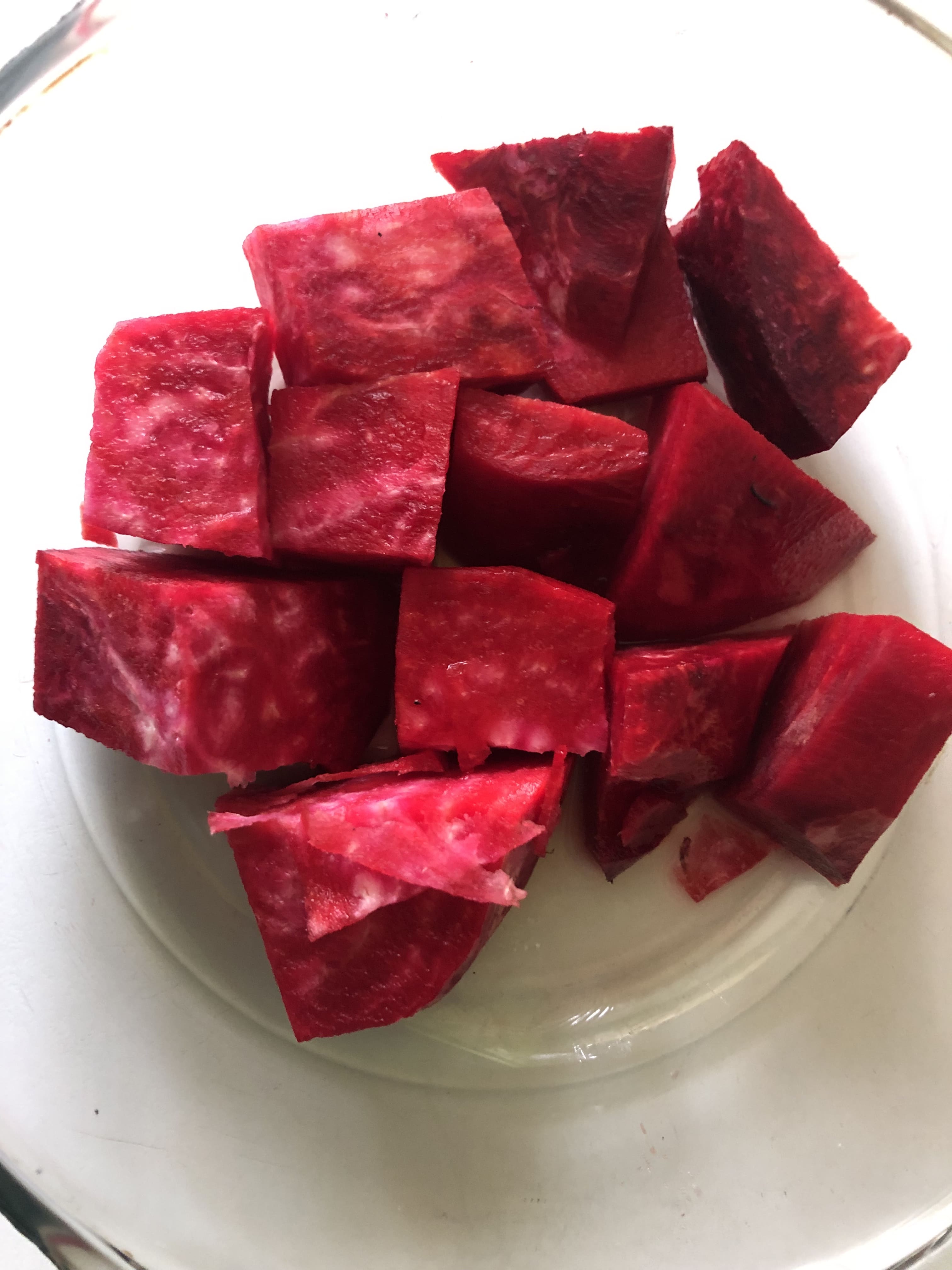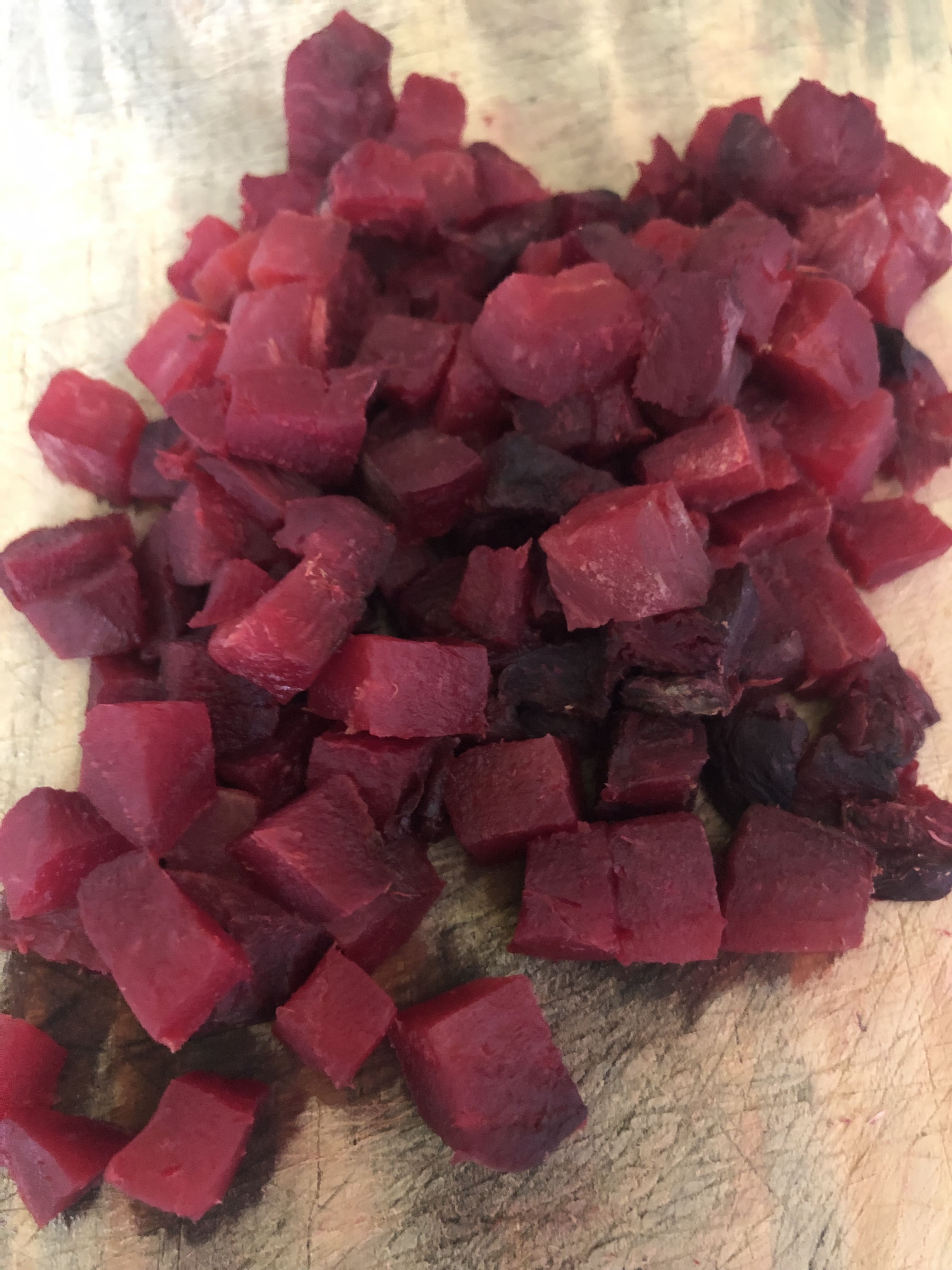Limpia la remolacha, córtala en trozos grandes y cocina al vapor o en el microondas (coloca los trozos en un recipiente con un poquito de agua para que no se seque) hasta que esté tierna. Deja que se enfríe un poco, retira la piel y corta en cubos pequeños. Reserva.