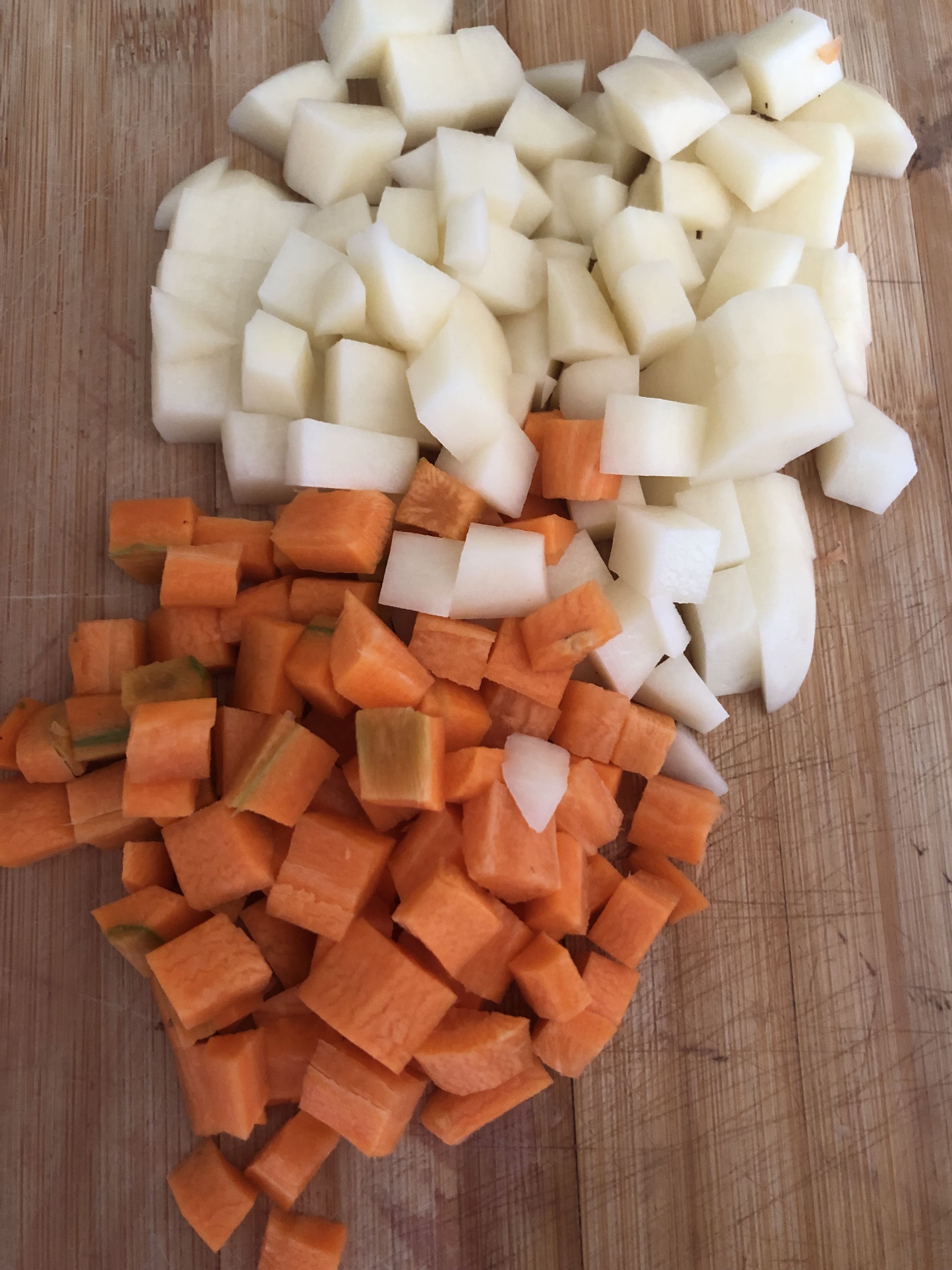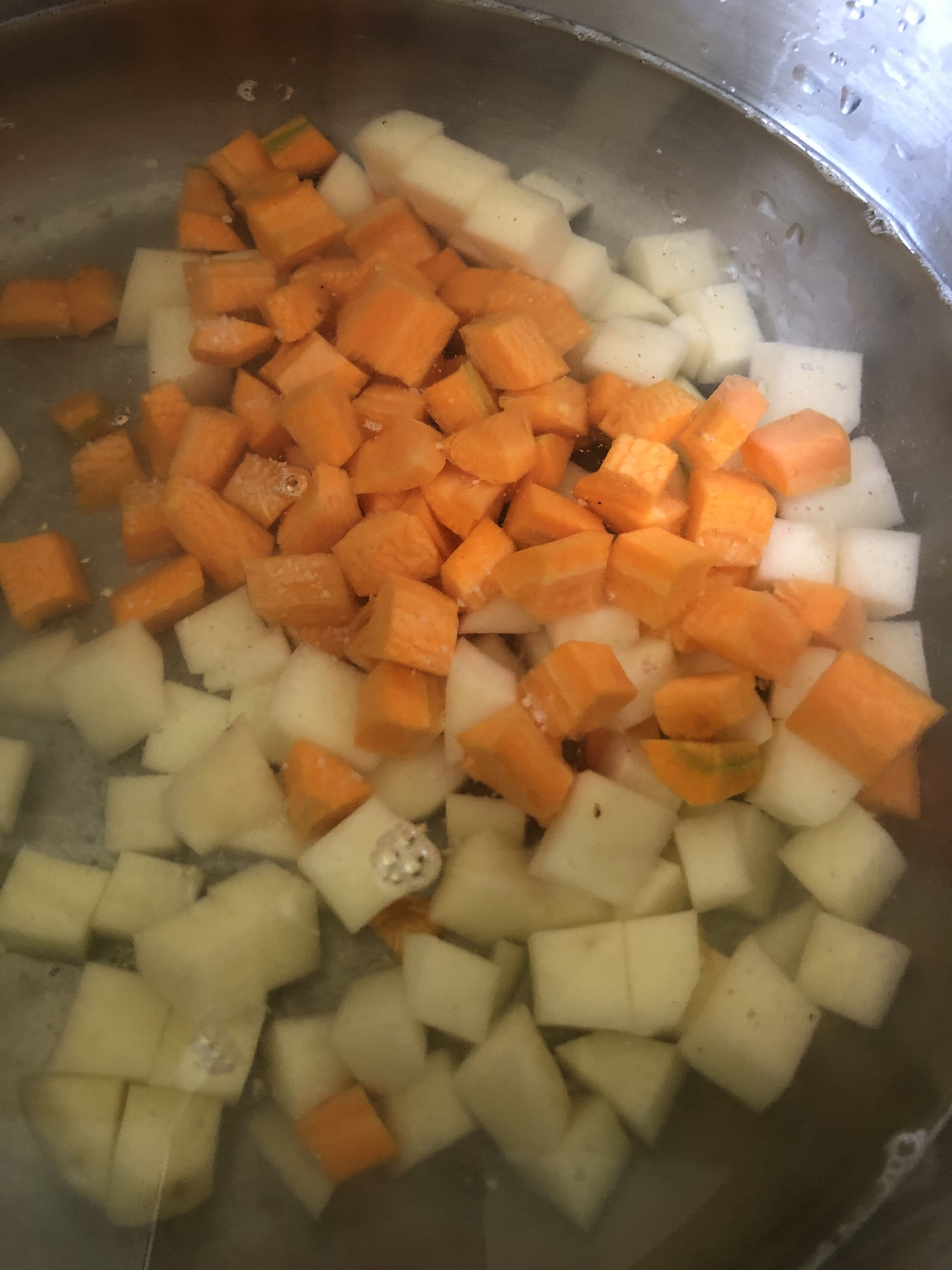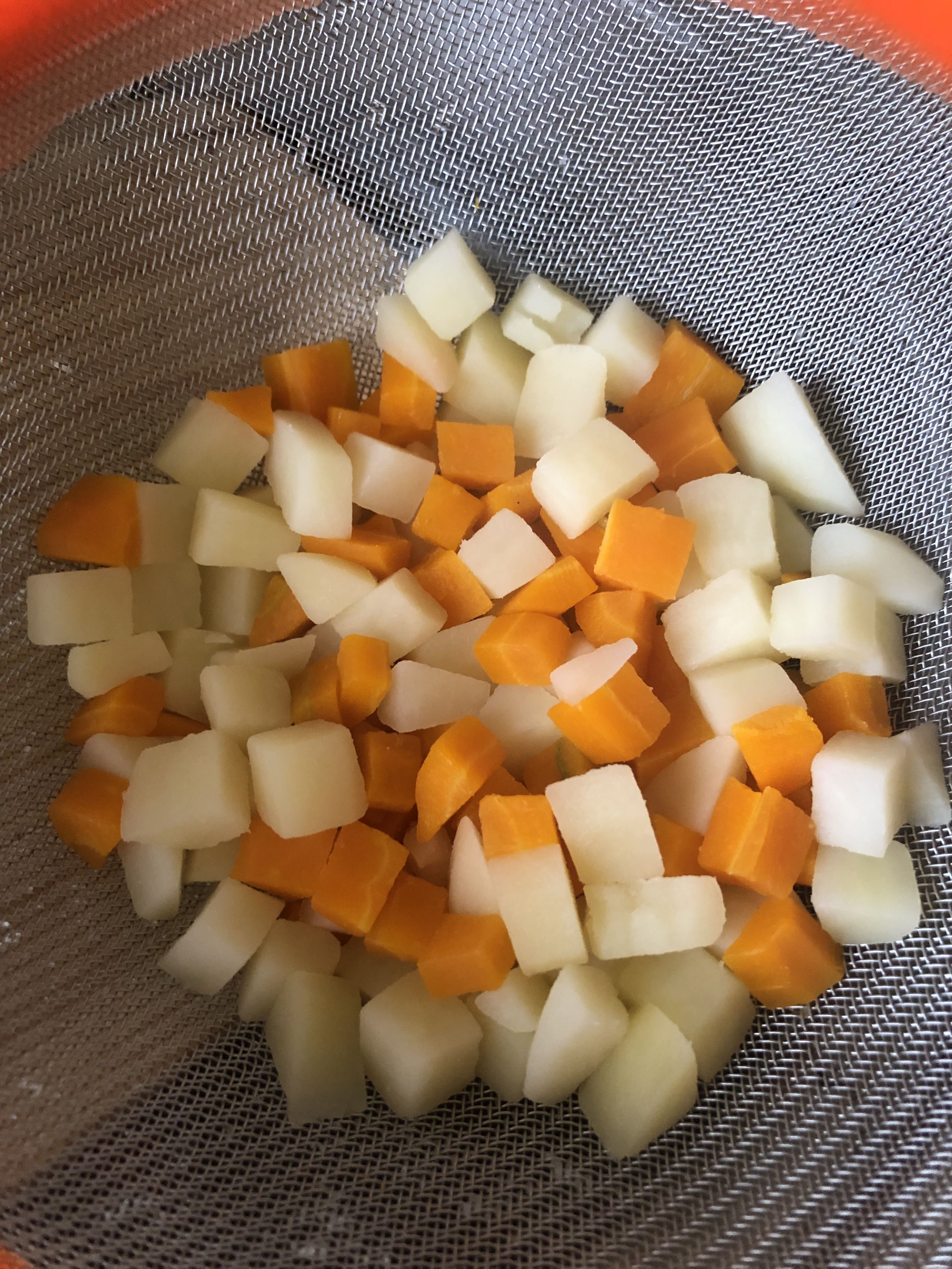 Pela las patatas y las zanahorias, corta en cubos pequeños y cuece en abundante agua con sal hasta que estén tiernas. Escurre y reserva.