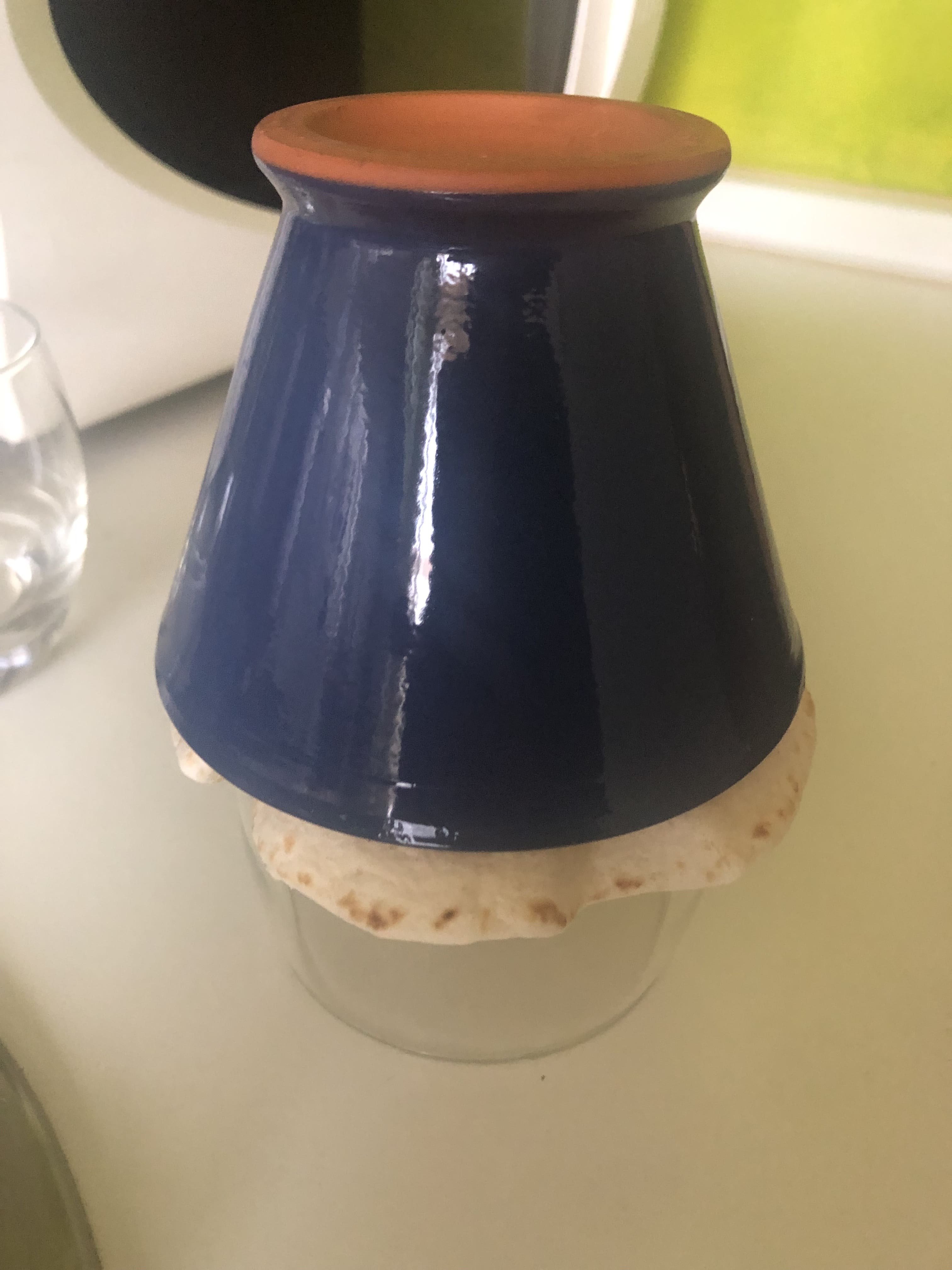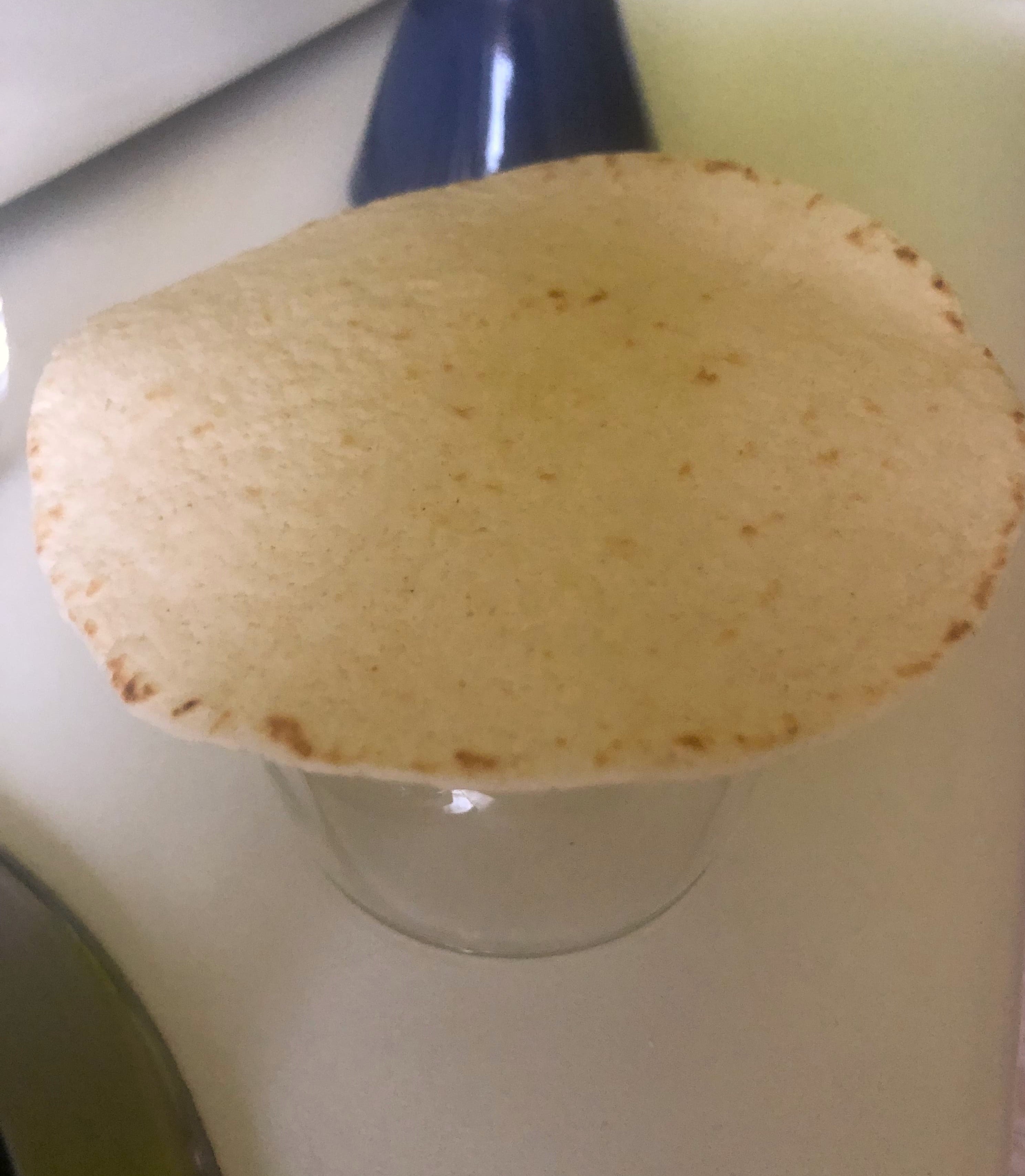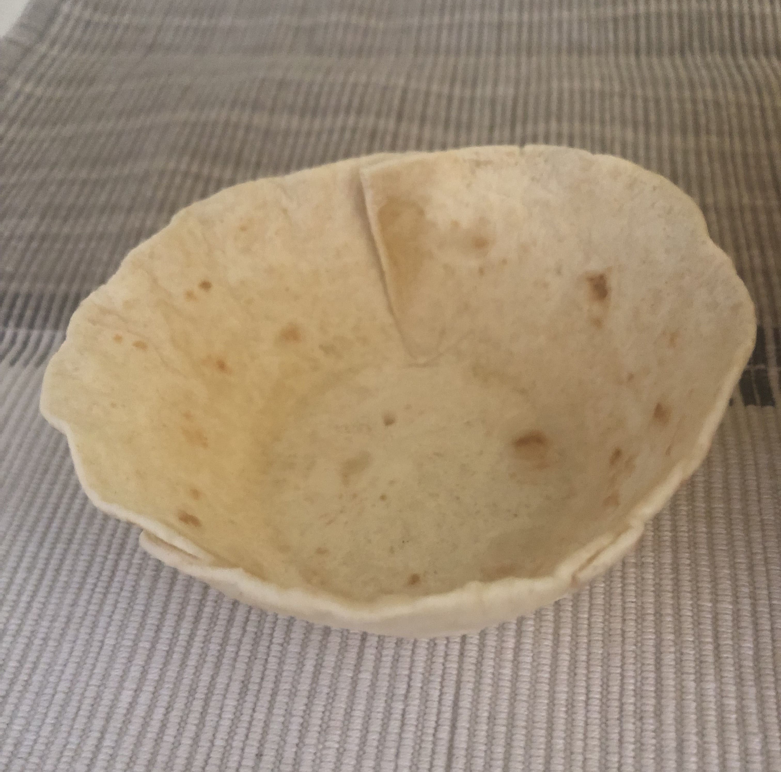 Puedes servir esta ensalada en un plato o en una cestita de tortilla de maíz (yo he utilizado las pequeñas). Coloca la tortilla sobre un vaso y encima otro recipiente que haga presión, mete en el microondas 1 minutos, despega con cuidado y deja enfriar. También lo puedes hacer al horno: queda más crujiente, pero te lleva más tiempo.