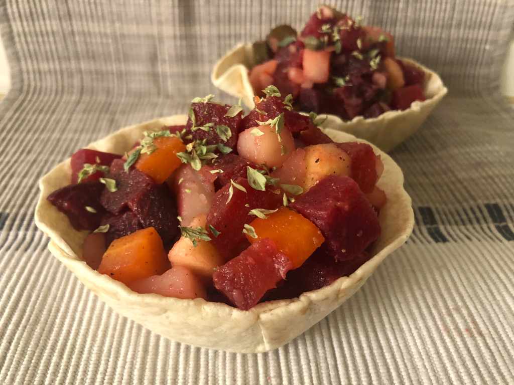 La receta que hoy os traigo sí es una receta de Rusia. Se trata de un zakouki (aperitivo) y consiste en una ensalada de remolacha que guarda cierto parecido con nuestra ensaladilla rusa y que, contrariamente a su propio nombre, no se aliña con vinagre. El toque ácido lo aportan las alcaparras y los pepinillos. Esta ensalada tiene un color increíble y vistoso, un toque fresco y es perfecta como entrante en las fiestas navideñas., sobre todo, si la presentas en unos cuencos de tortilla. ¿Te animas a probarla?