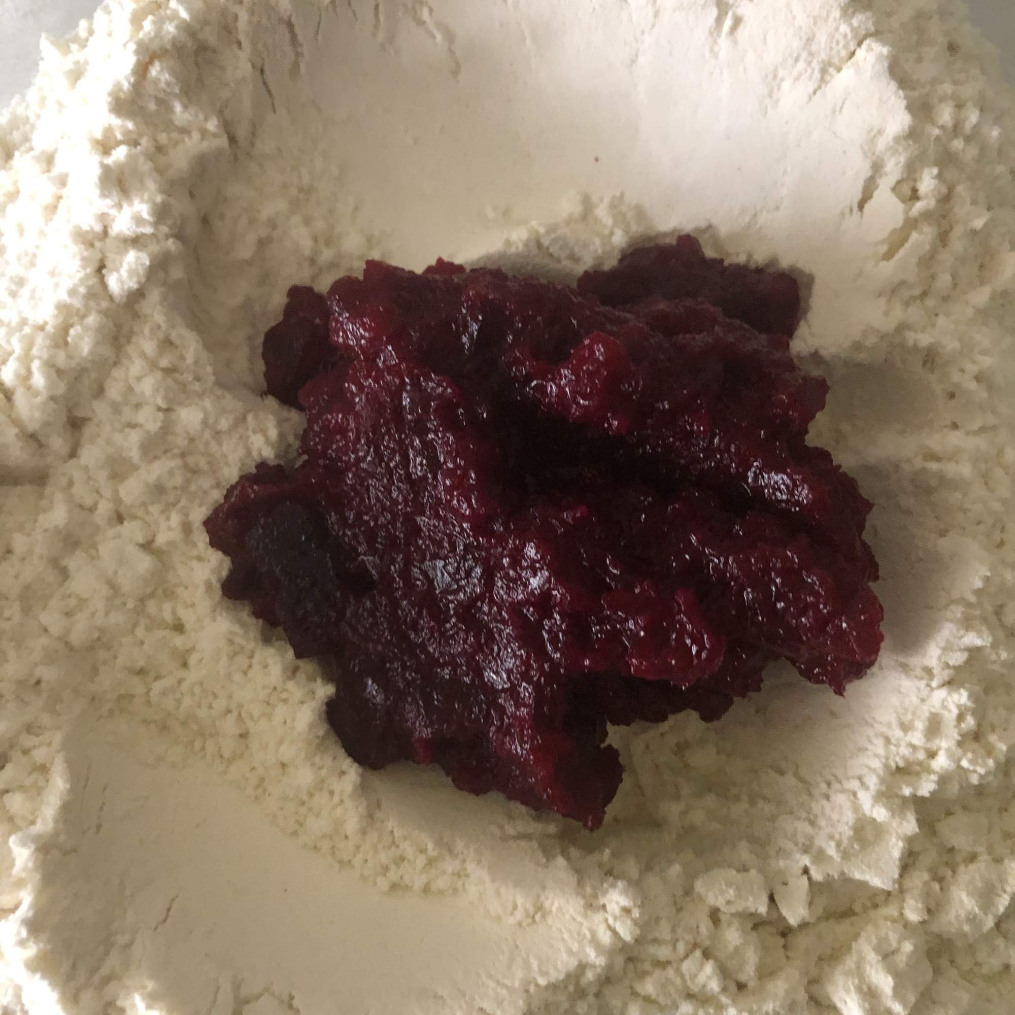 Tamiza la harina, haz un hueco en el centro y añade el puré de remolacha. Mezcla con una cuchara de madera hasta que no puedas seguir trabajando y añade poco a poco el agua de cocción (puede que no necesites toda).
