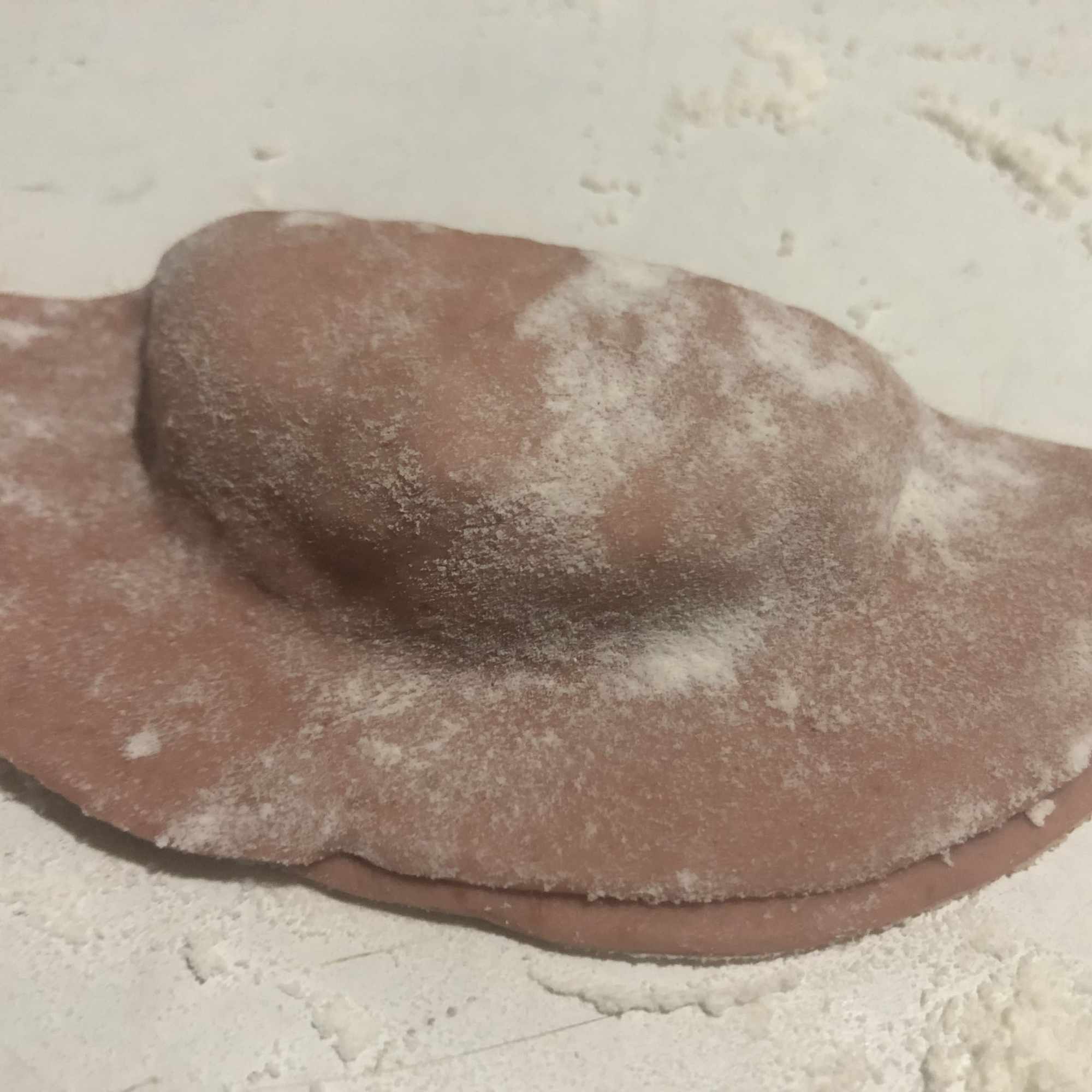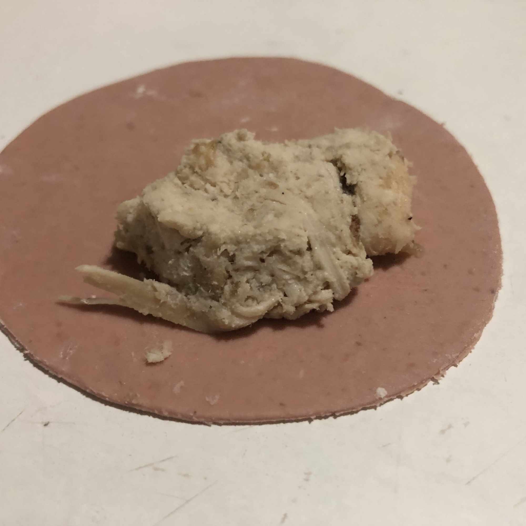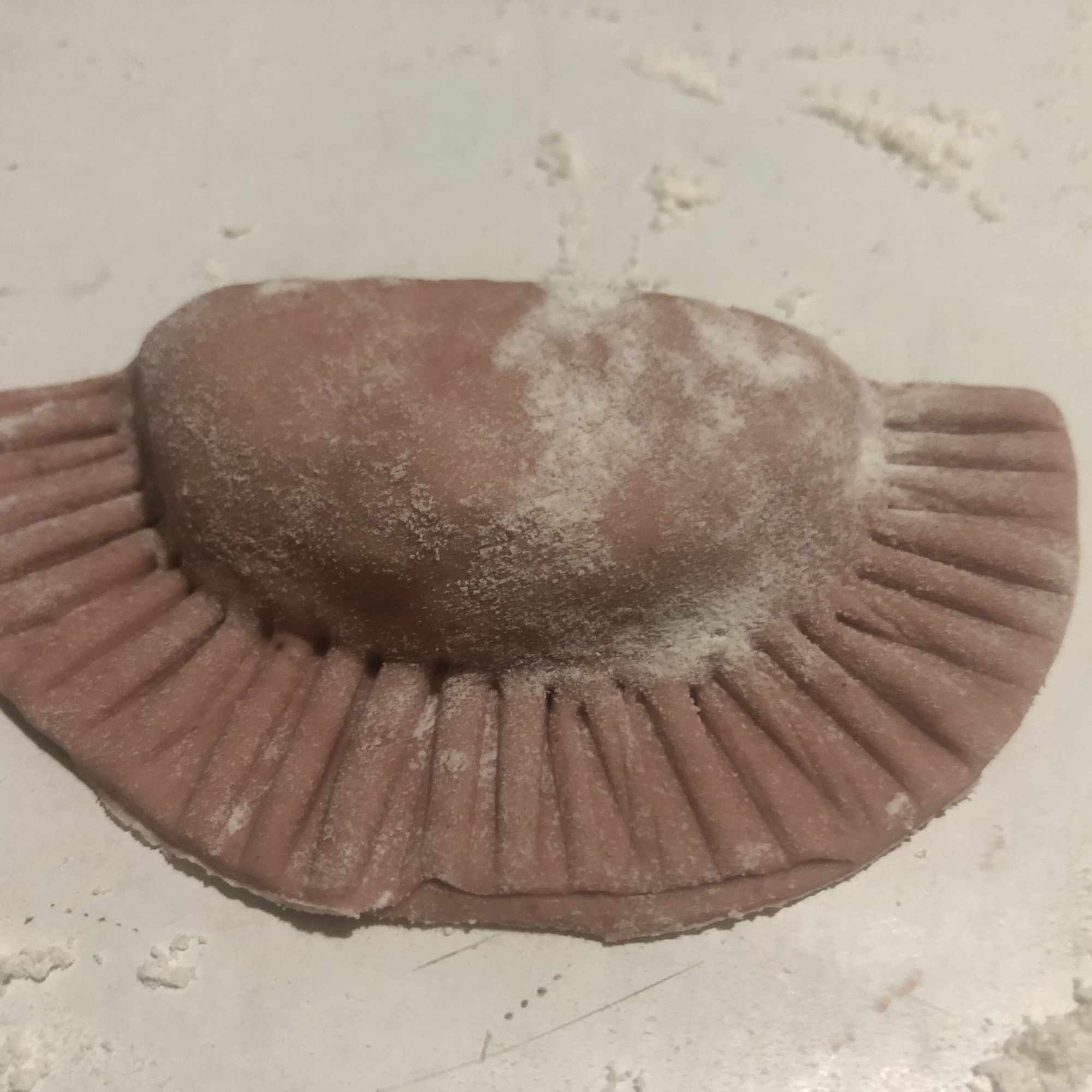 Coloca el relleno en una de las mitades y extiende, dejando un espacio en los bordes. Cierra con cuidado, intentando eliminar el aire y presionando con los dedos alrededor del relleno para que se pegue la masa. Sella los bordes con un tenedor (como cuando haces empanadillas). Pon el dedo pulgar en el centro del relleno y con la otra mano une los extremos, sellándolo bien para que no se abra. Coloca sobre una bandeja enharinada mientras haces el resto (te aconsejo meter en la nevera mientras lo haces).