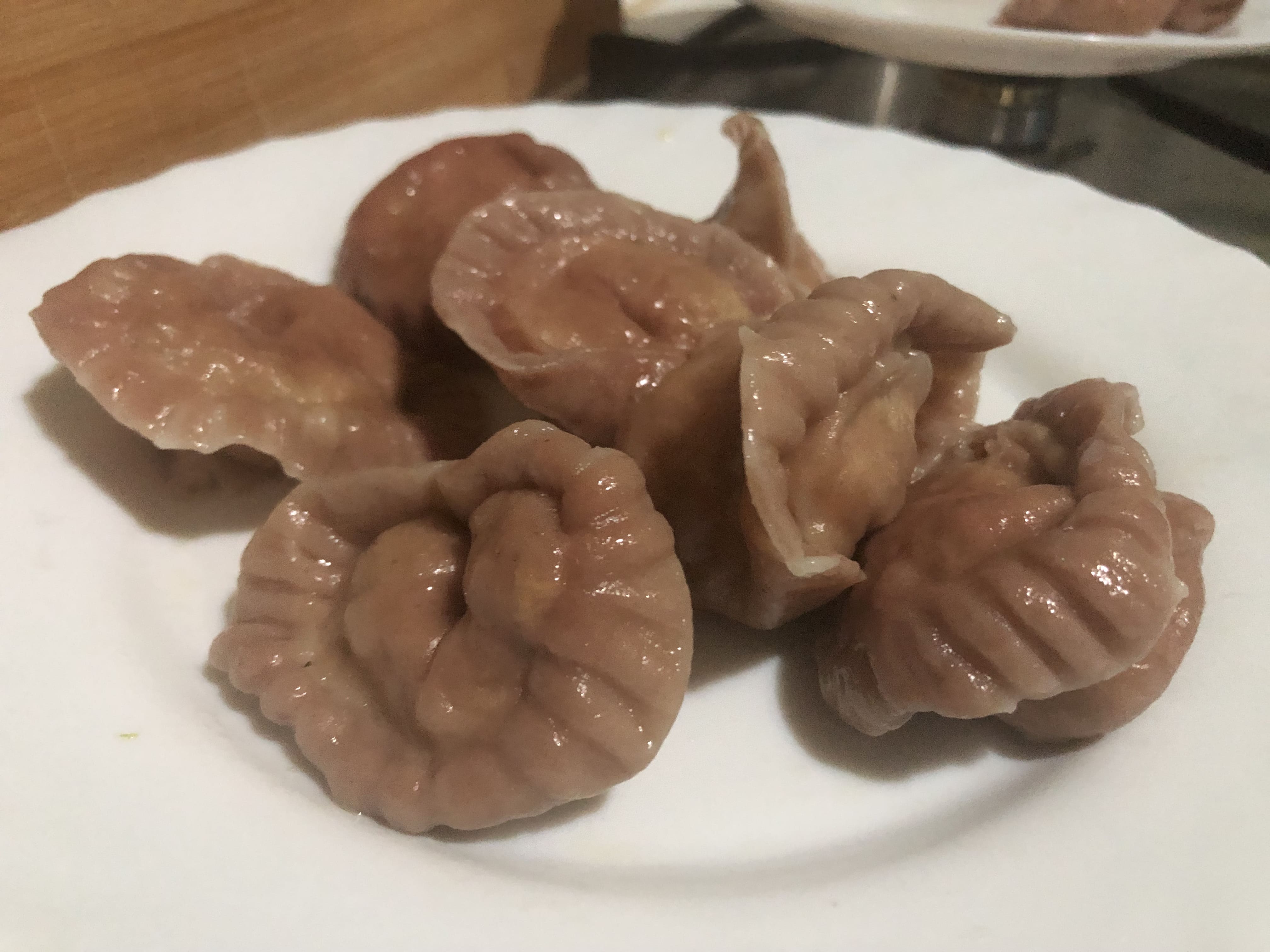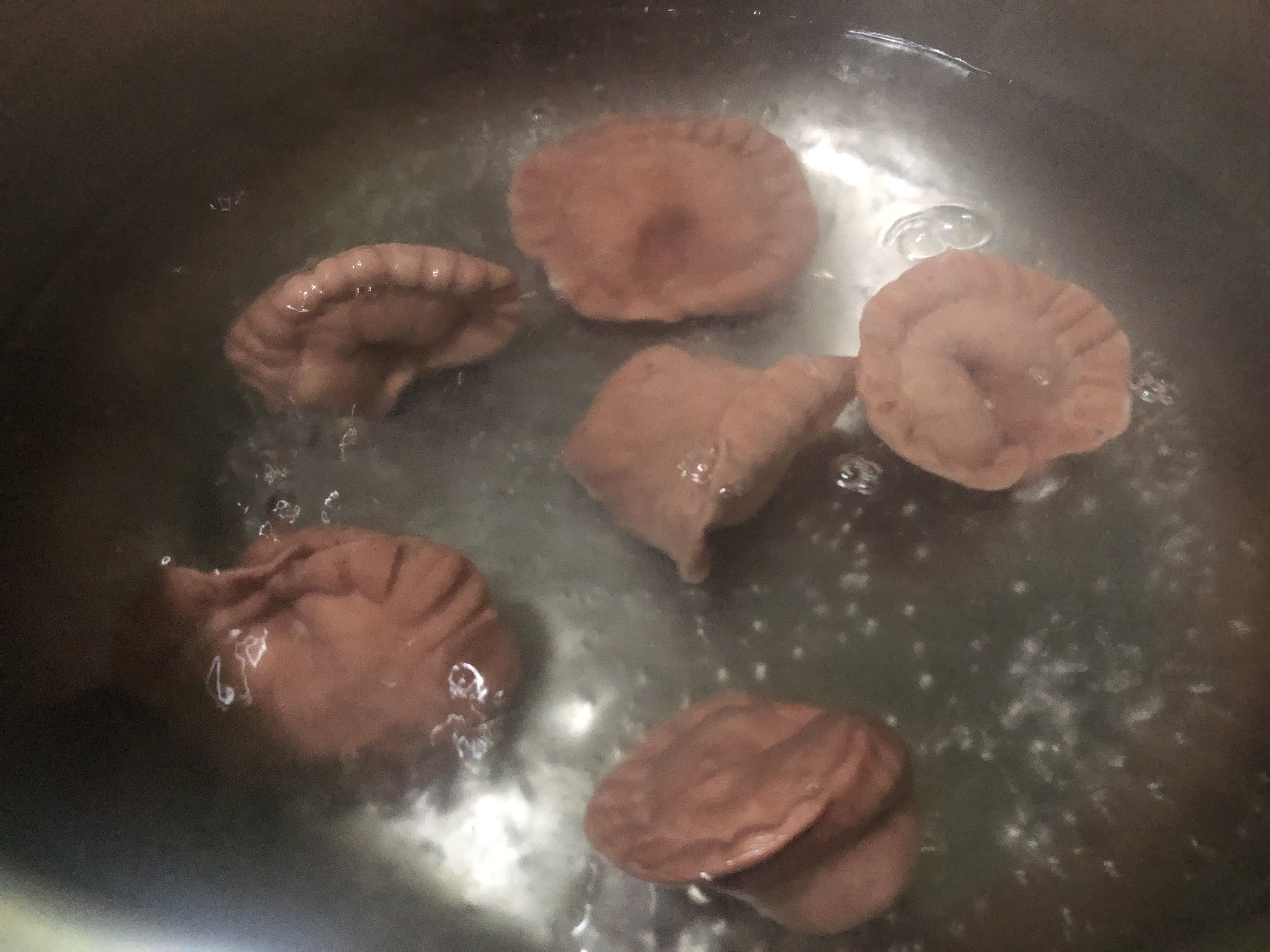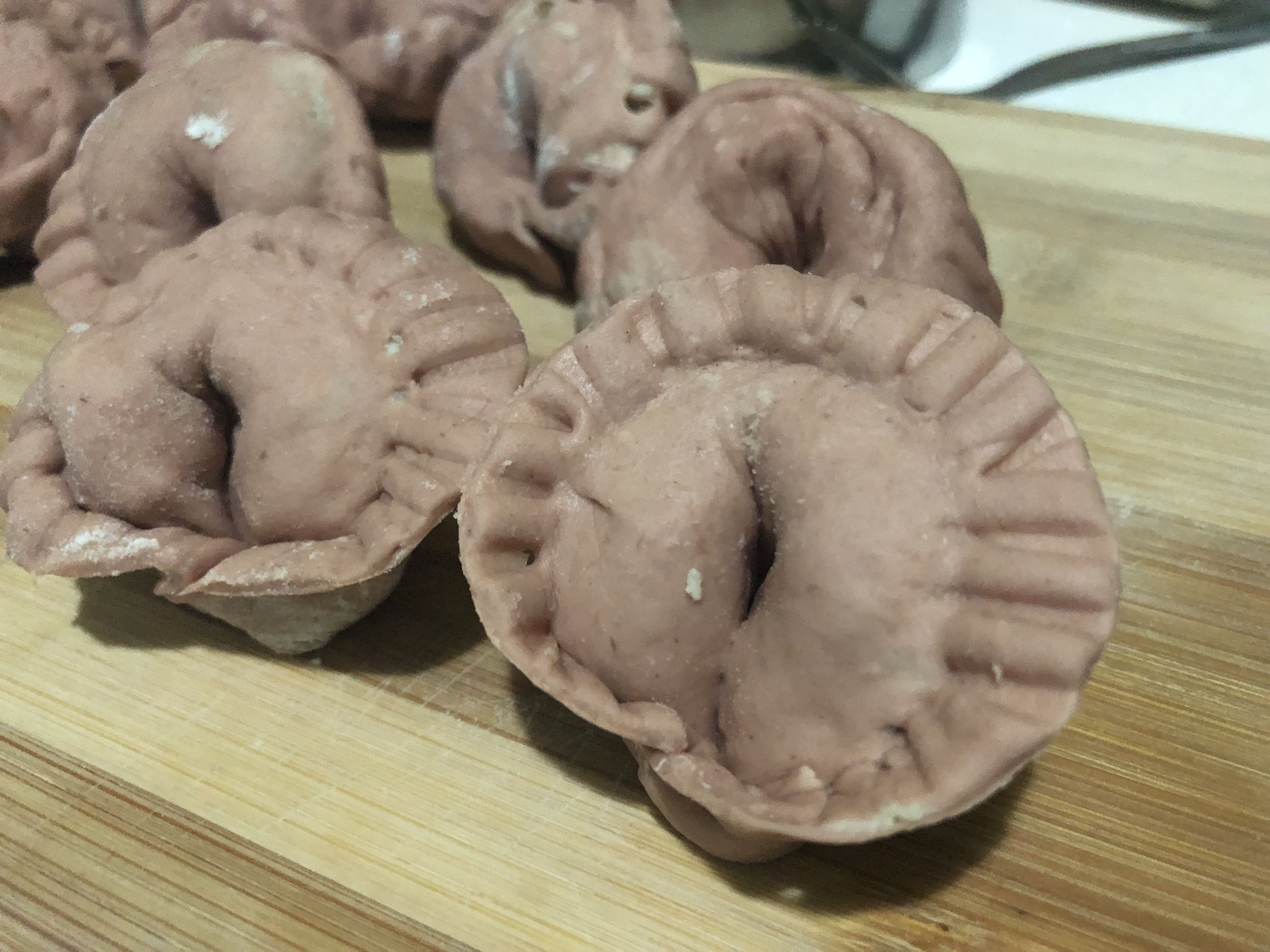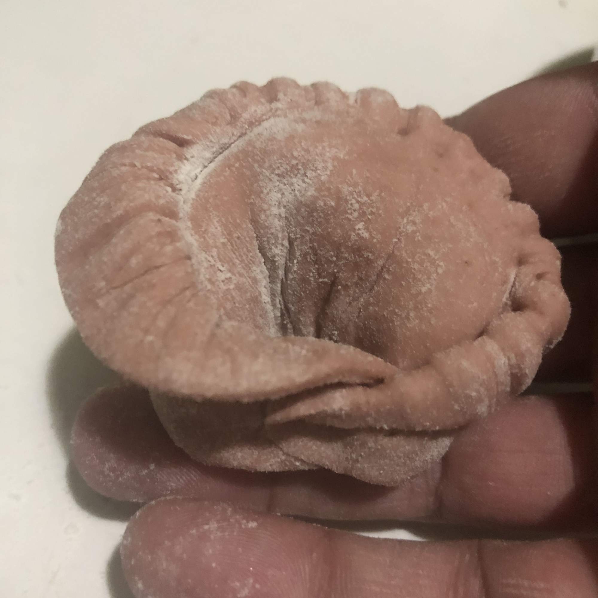 Coloca el relleno en una de las mitades y extiende, dejando un espacio en los bordes. Cierra con cuidado, intentando eliminar el aire y presionando con los dedos alrededor del relleno para que se pegue la masa. Sella los bordes con un tenedor (como cuando haces empanadillas). Pon el dedo pulgar en el centro del relleno y con la otra mano une los extremos, sellándolo bien para que no se abra. Coloca sobre una bandeja enharinada mientras haces el resto (te aconsejo meter en la nevera mientras lo haces).
