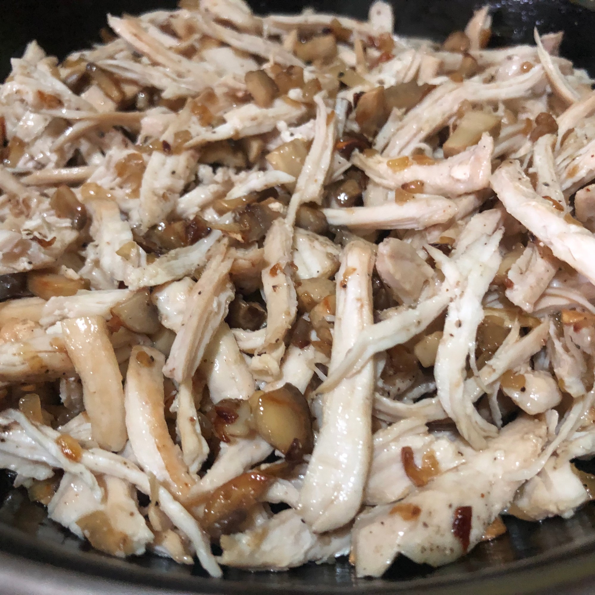 Prepara el relleno: salpimenta las pechugas y cocina en una sartén con un chorrito de aceite. Deja templar y deshilacha con los dedos. Reserva. Lava los champiñones y corta en cubos medianos y la cebolla en brunoise. En la misma sartén de las pechugas, con un poco más de aceite, cocina los champiñones y la cebolla a fuego medio-bajo hasta que estén tiernos. Si queda muy seco puedes añadirle un chorrito de vino y dejar que evapore el alcohol. Vierte en el vaso de la batidora junto con la pechuga y tritura (será más fácil de manipular). Corrige el punto de sal y deja templar.