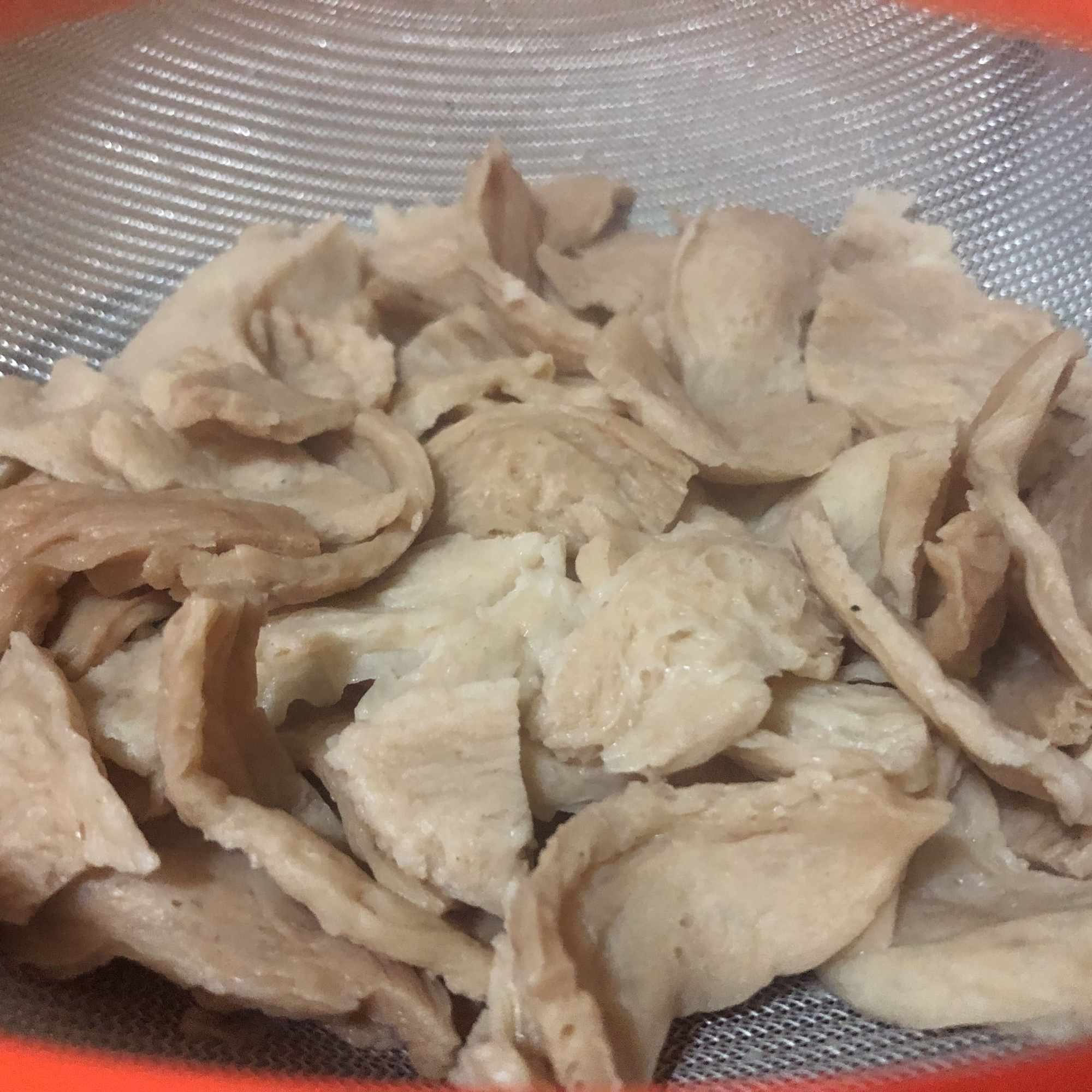 Cuece la batata en abundante agua (puedes asarla si lo prefieres en el horno o microondas). Deja enfriar, pela y corta en rodajas de tamaño no muy grueso. Hidrata las sojalitas en agua muy caliente durante 30 minutos. Escurre y reserva.