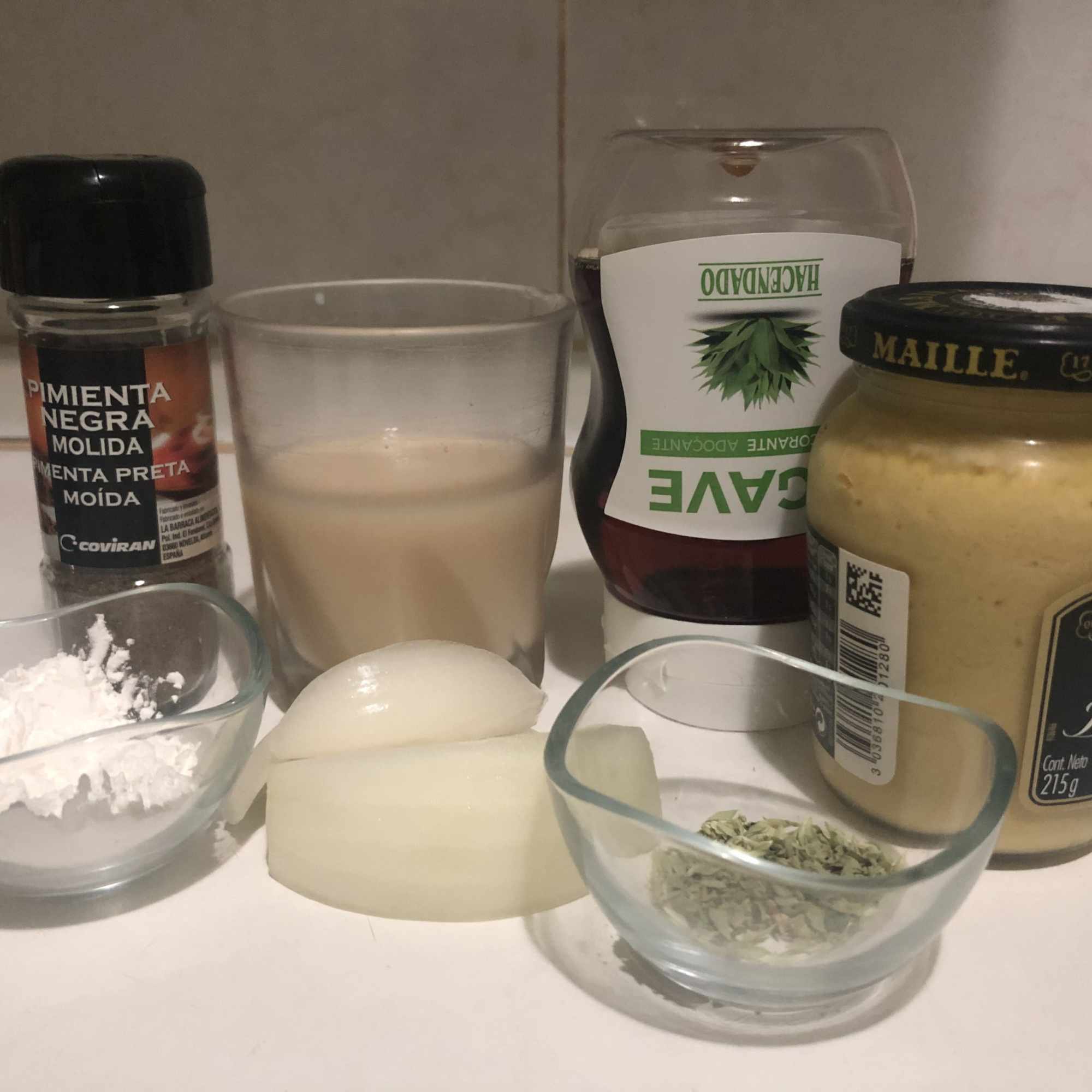 Pica la cebolla en brunoise y pocha en un poco de aceite. Disuelve la maicena en la bebida vegetal. Mezcla la mostaza y el sirope y añade a lo anterior. Cuando la cebolla esté blandita, sazona y agrega las sojalitas y el orégano. Cocina unos minutos para que se doren y añade la maicena disuelta. Mezcla todo bien hasta que espese (aquí lo dejas a tu gusto).