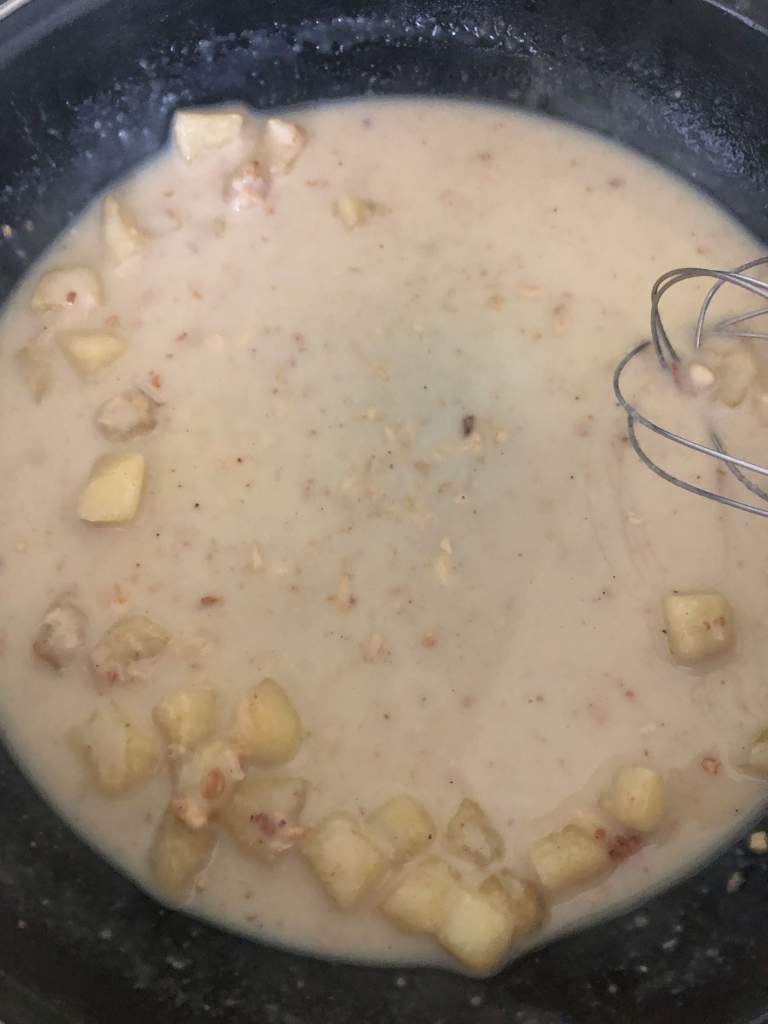 Cocina un par de minutos, añade la sal, la pimienta y la nuez moscada. Agrega la harina y cocina un minuto, sin que se queme. Añade la mitad de la leche y remueve con varillas. Finalmente, agrega las acelgas escurridas, el resto de la leche y sigue removiendo para que se mezcle todo bien. Retira del fuego y reserva.