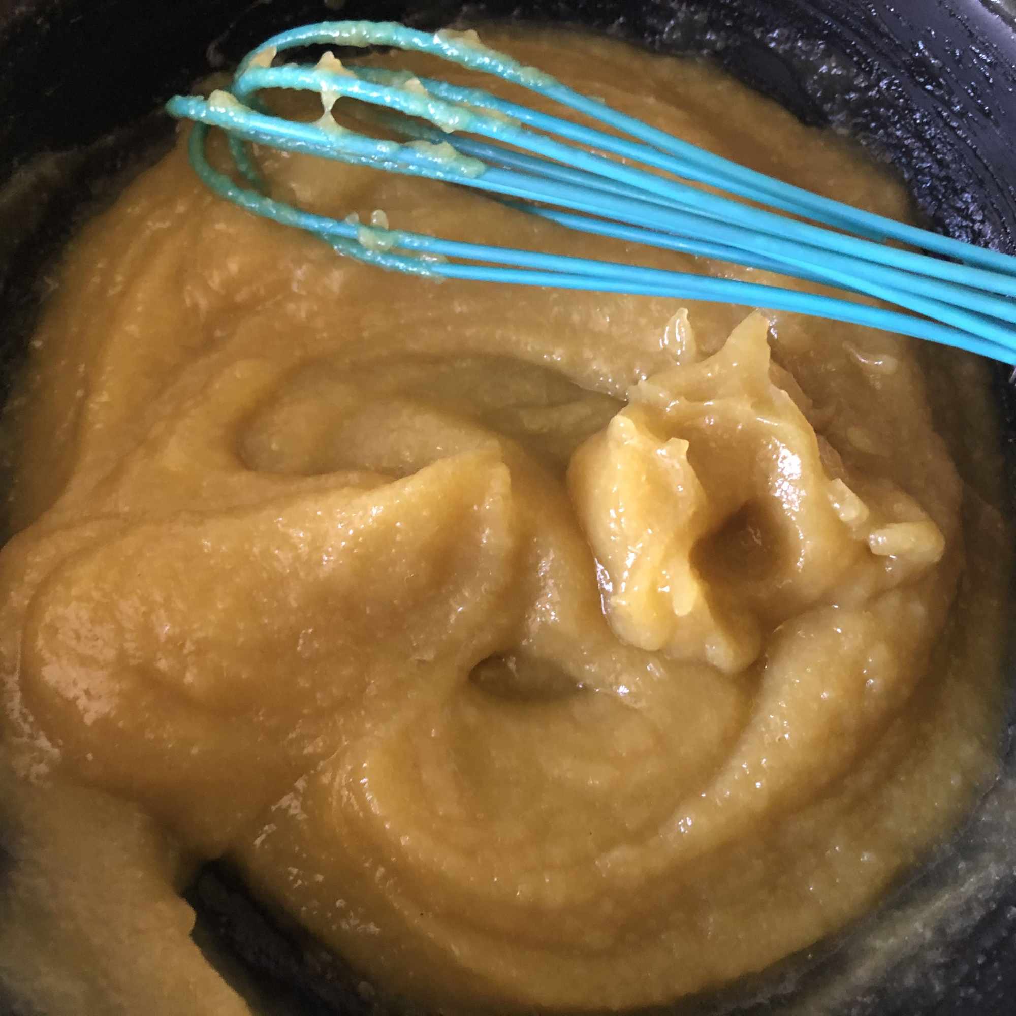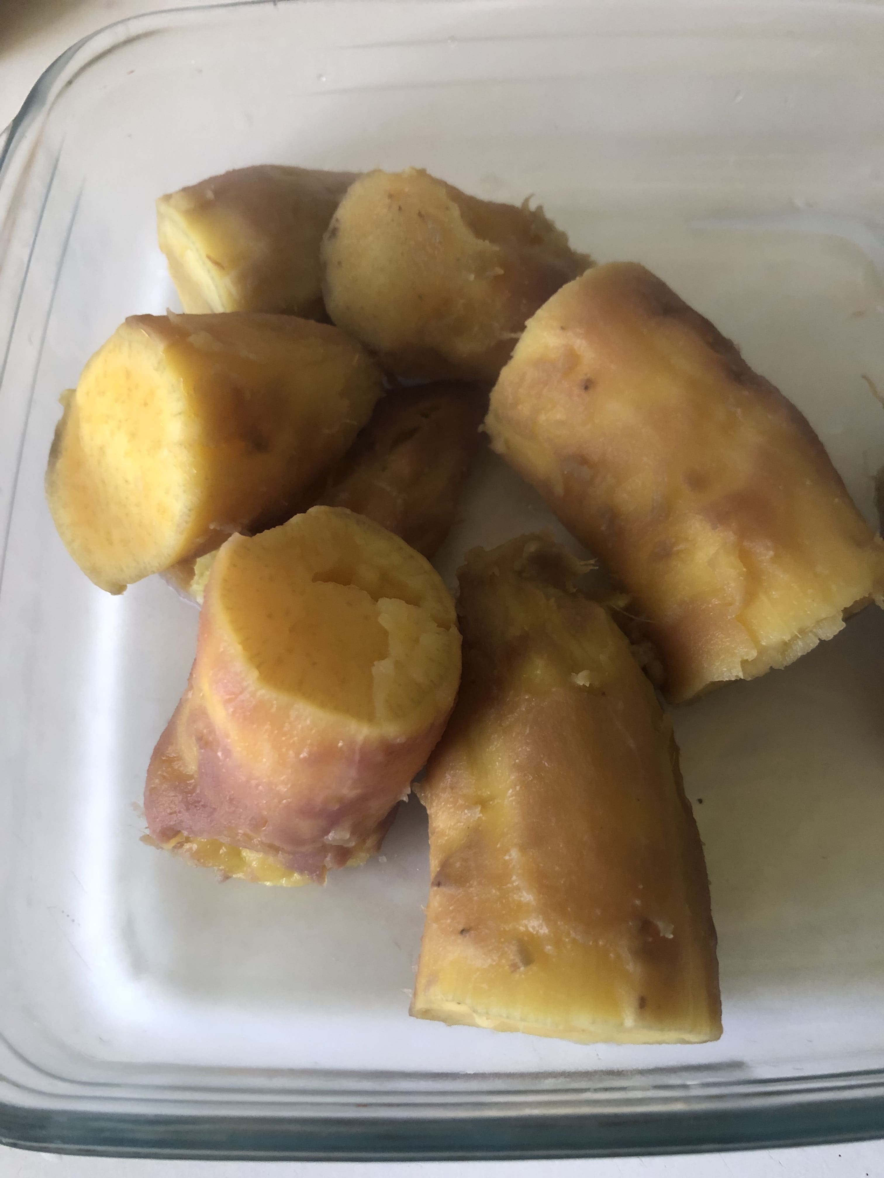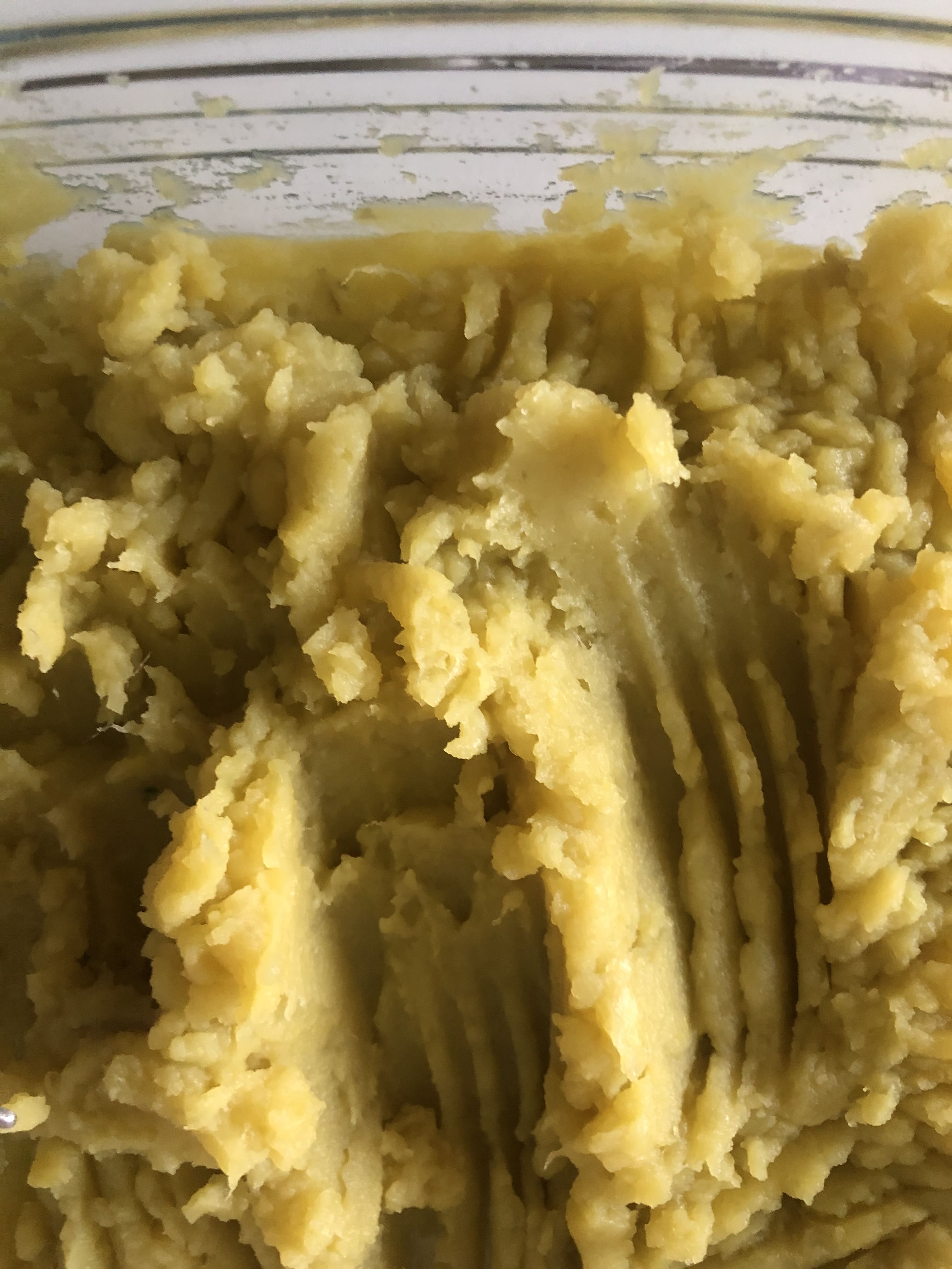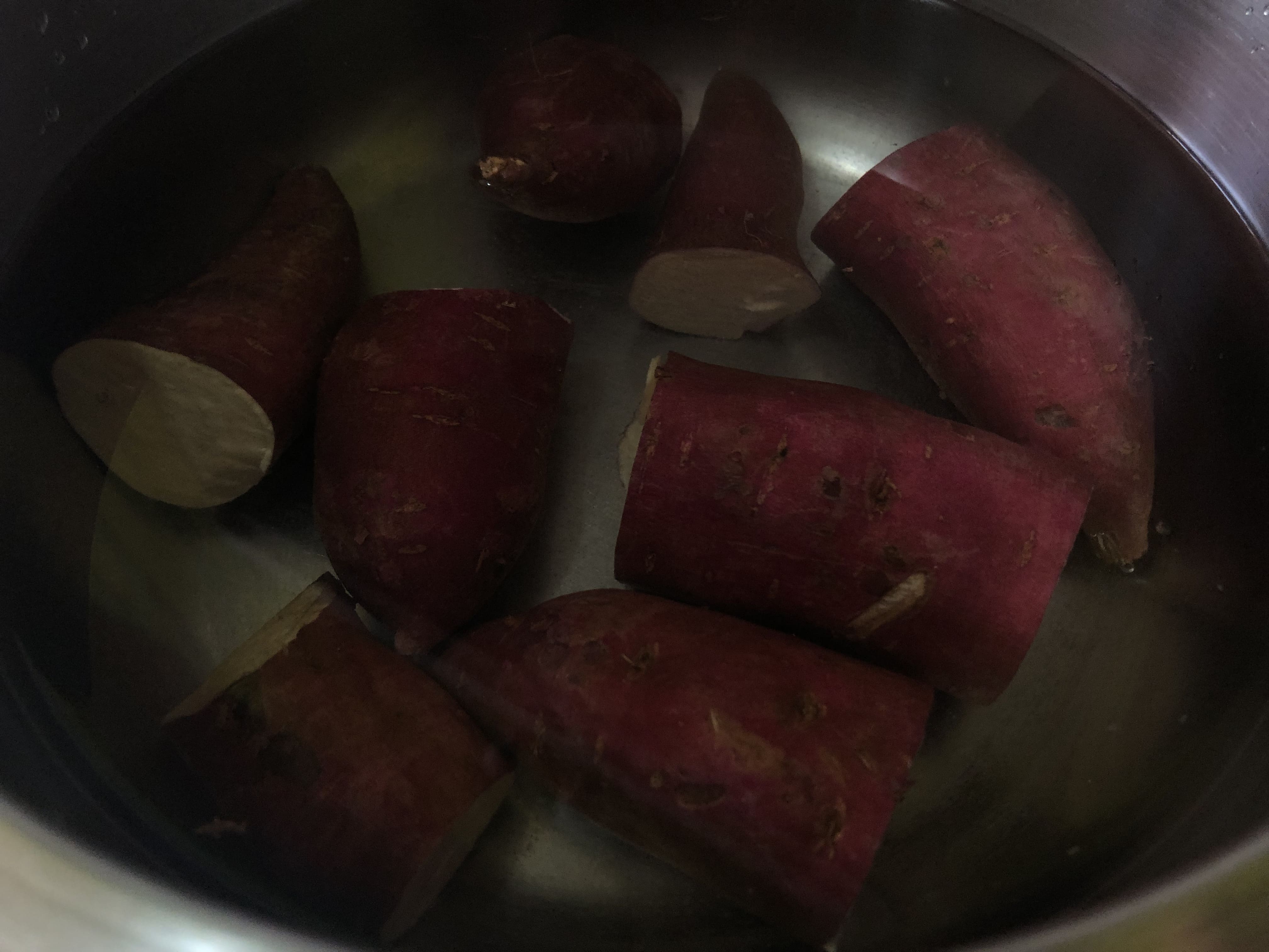 Lava la batata, corta en trozos grandes y cuece hasta que quede tierna (he utilizado olla exprés). Sin dejar que se enfríe pela y tritura con un pisapuré.
