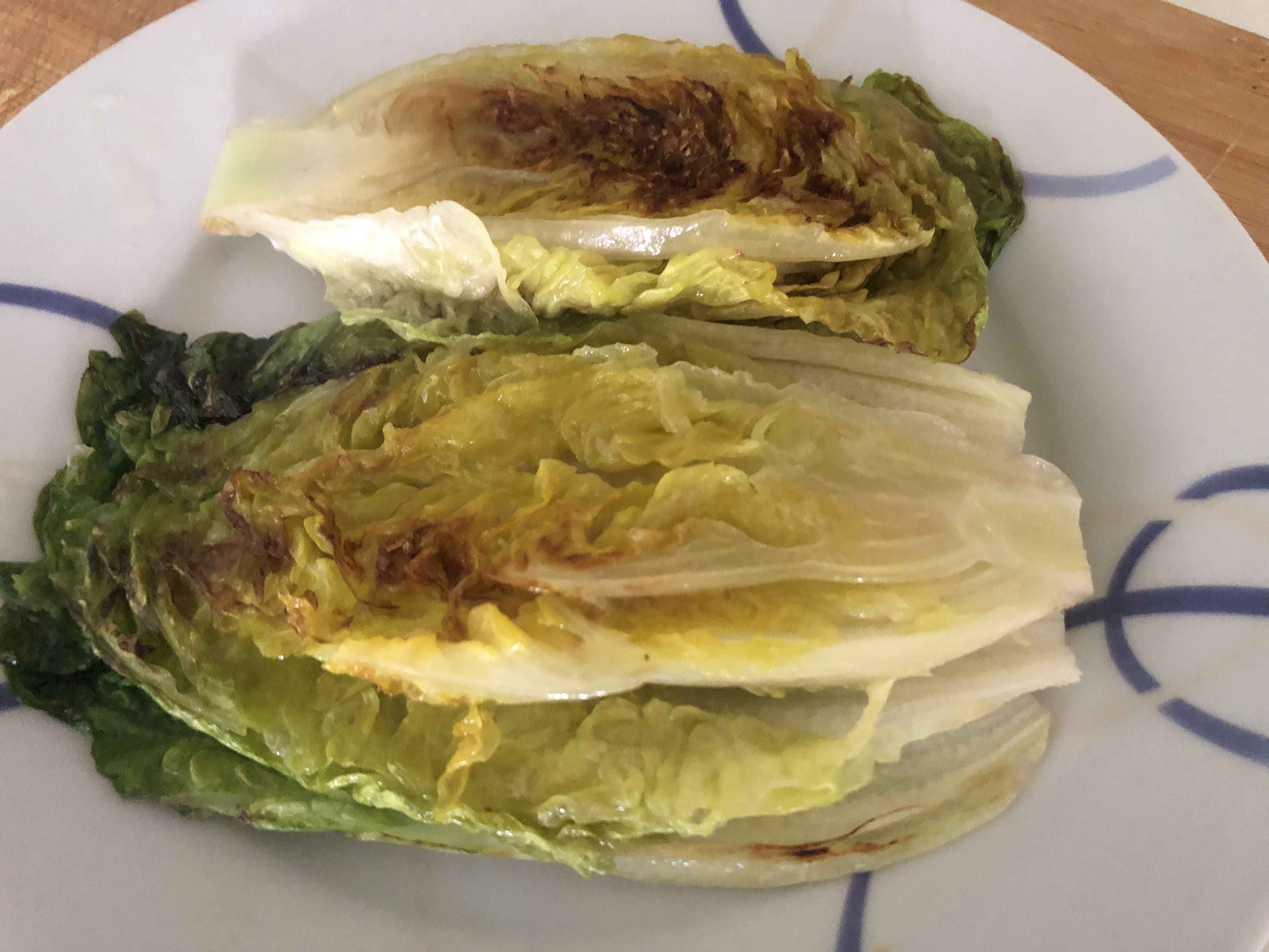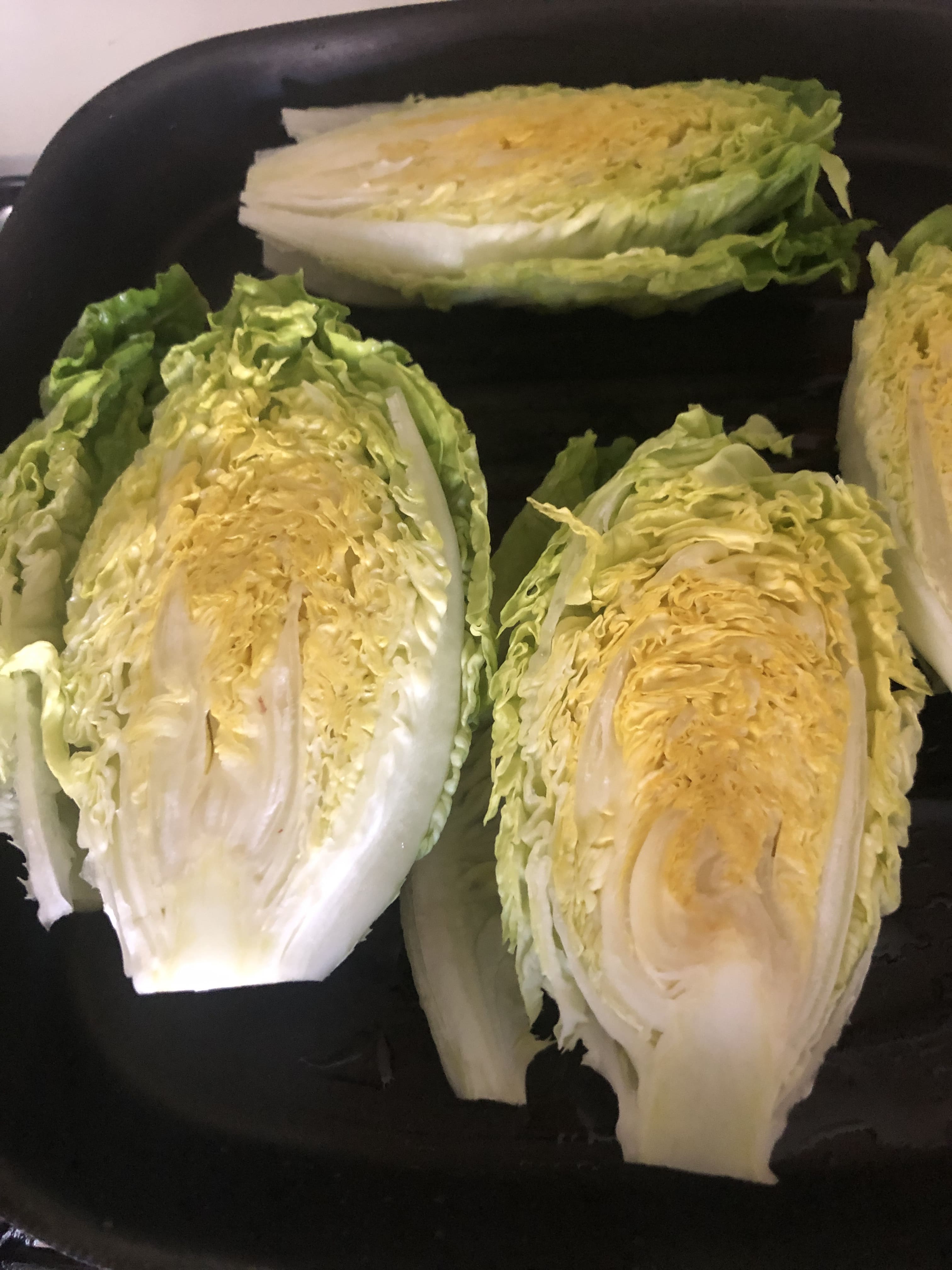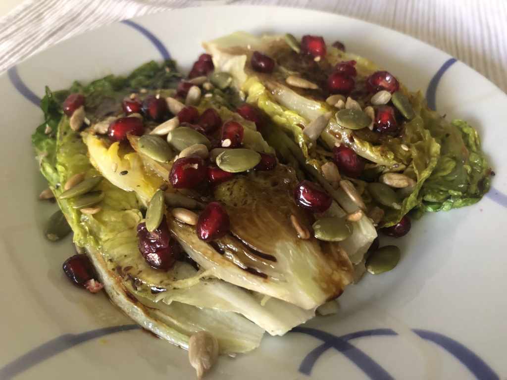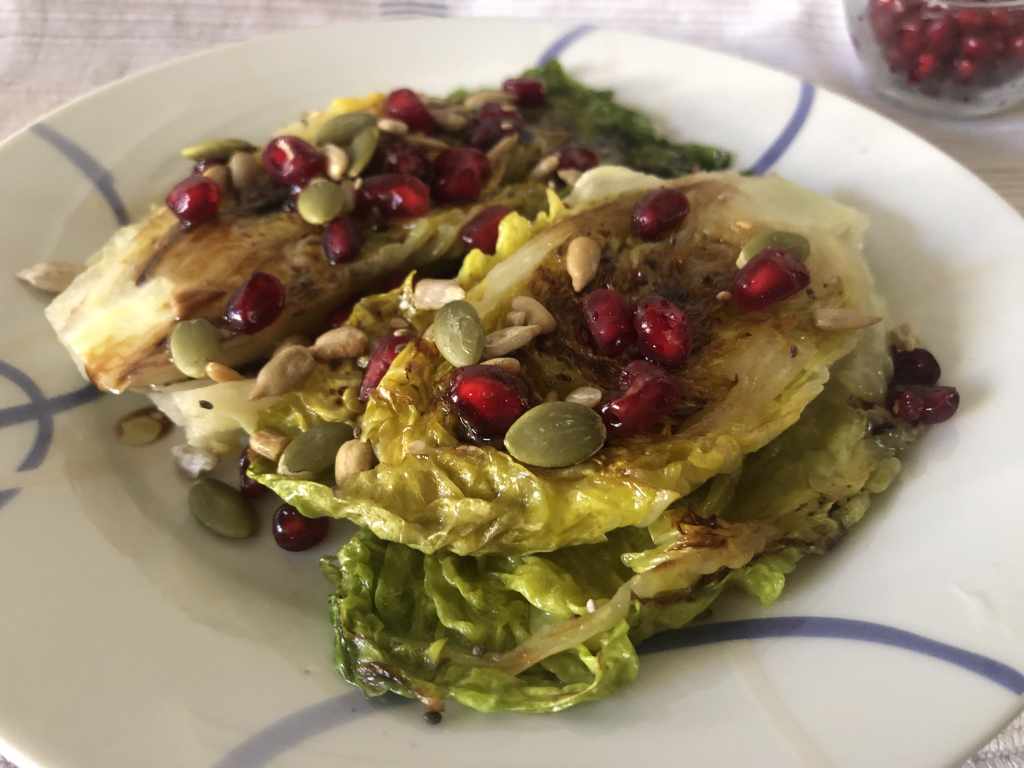 Hace unos días descubrí que también se puede hacer lo mismo con los cogollos y como tenía una bandejita por casa me lancé a la aventura. La verdad es que quedan riquísimos, con sus hojas suaves por fuera y un toque aún crujiente por dentro. Le añadí un poco de granada que tenía por casa, ya no está de temporada, pero tenía que darle salida y en ensaladas me gusta muchísimo y unas semillas para completar el plato y darle un punto crunchy. Y para rematar, un aliño agridulce, en este caso vegano, pero que podéis adaptar a vuestras preferencias.