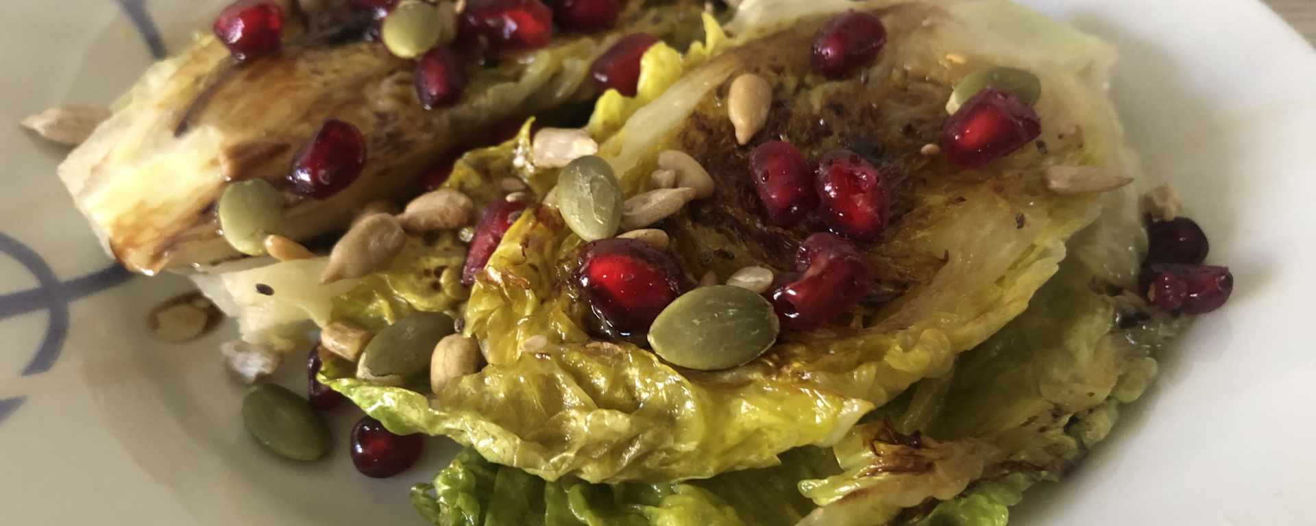 Hace unos días descubrí que también se puede hacer lo mismo con los cogollos y como tenía una bandejita por casa me lancé a la aventura. La verdad es que quedan riquísimos, con sus hojas suaves por fuera y un toque aún crujiente por dentro. Le añadí un poco de granada que tenía por casa, ya no está de temporada, pero tenía que darle salida y en ensaladas me gusta muchísimo y unas semillas para completar el plato y darle un punto crunchy. Y para rematar, un aliño agridulce, en este caso vegano, pero que podéis adaptar a vuestras preferencias.