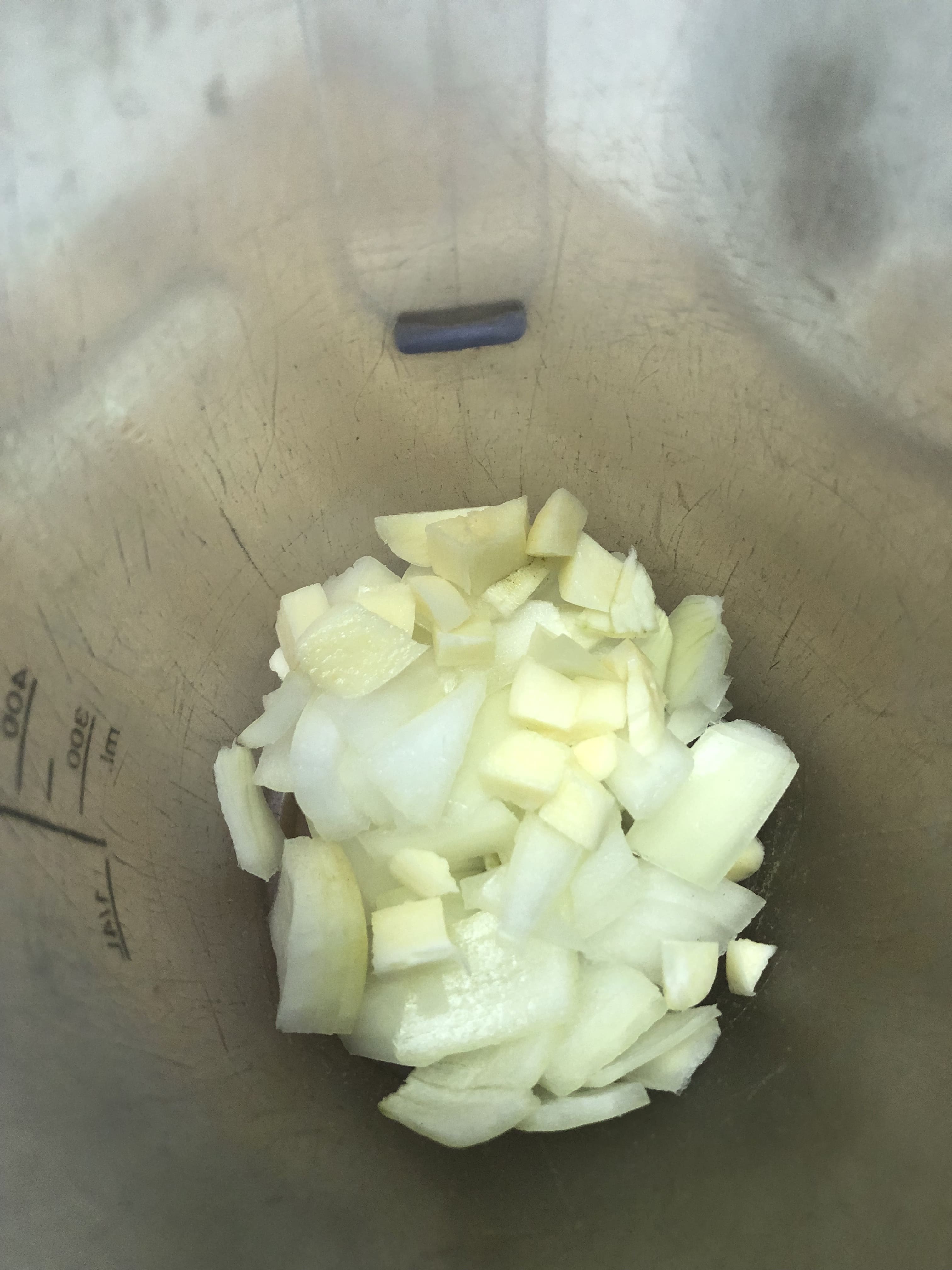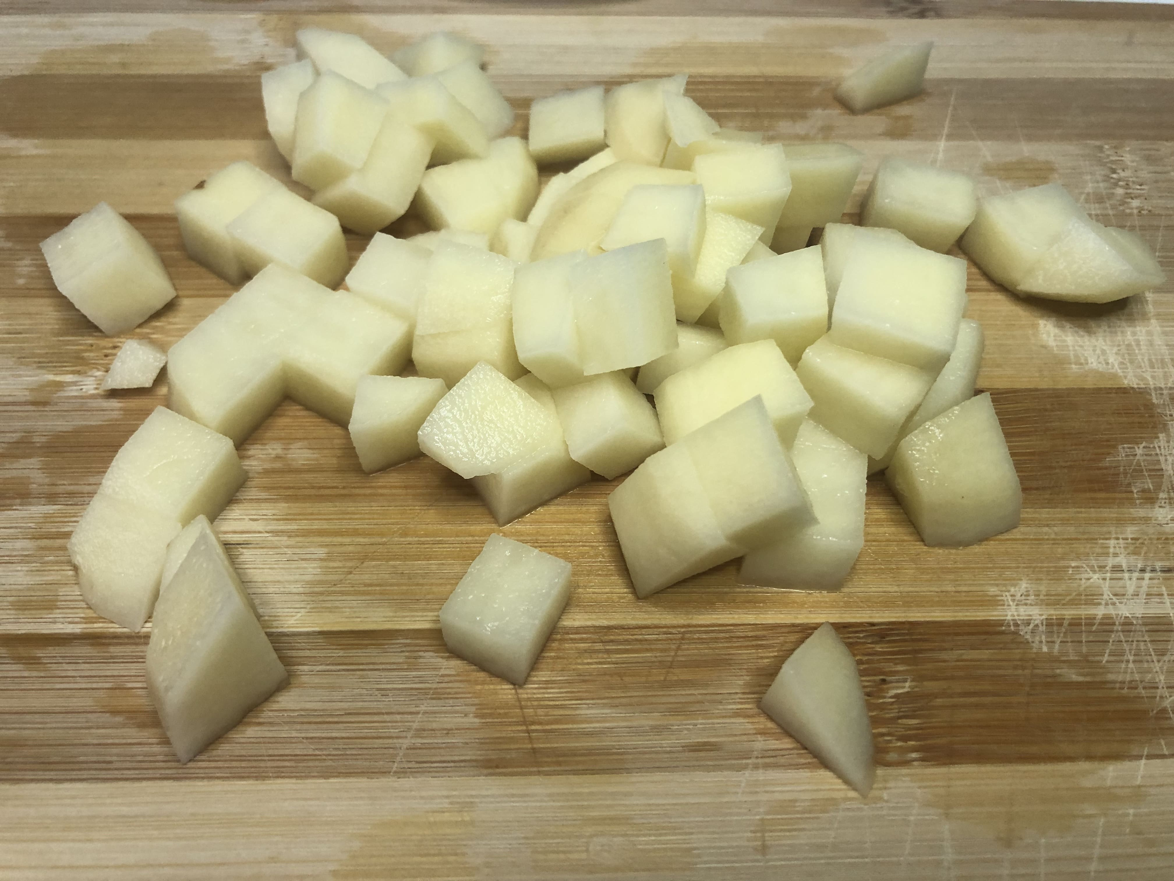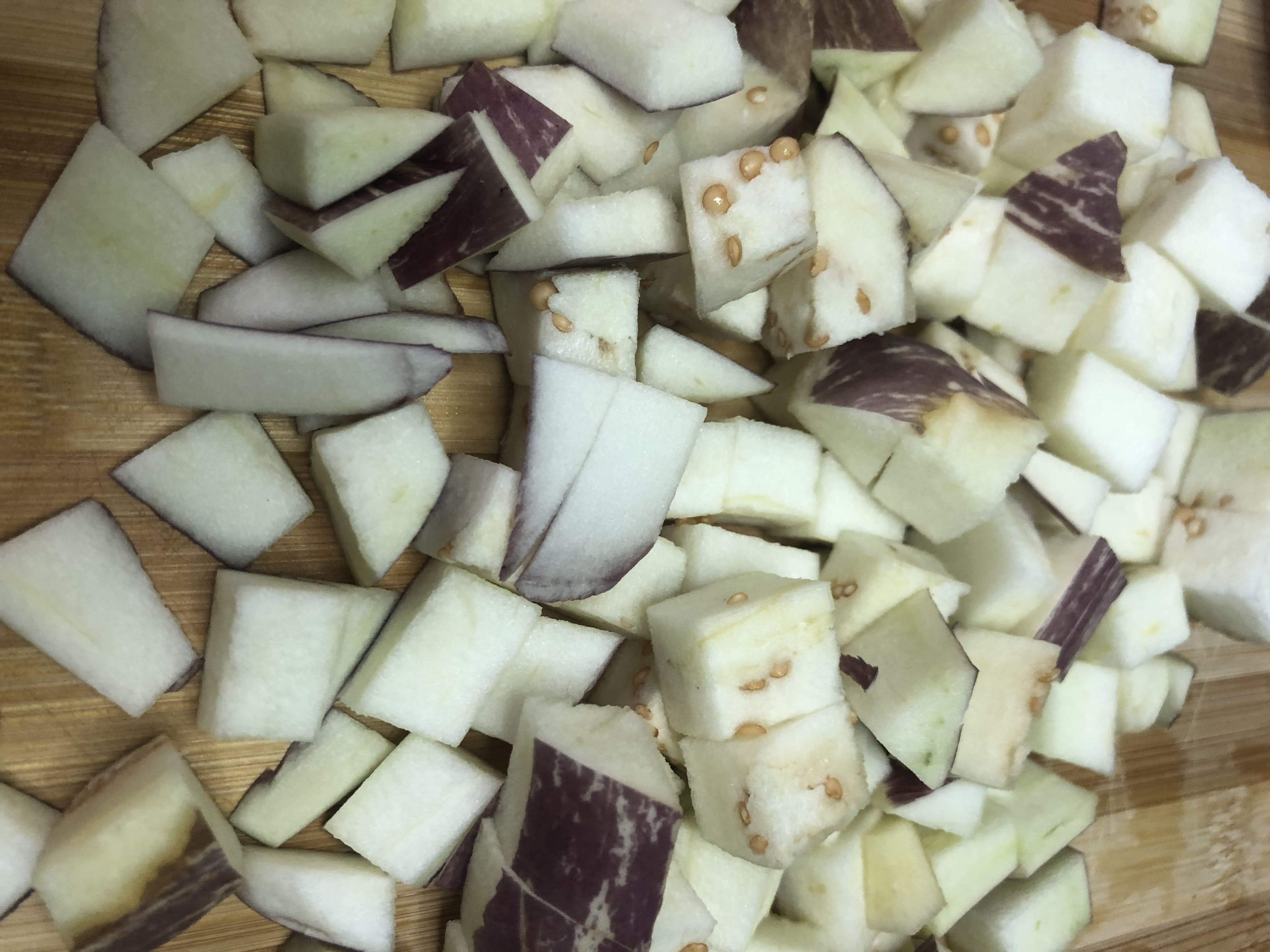 Pela la patata y corta en cubos. Lava la berenjena y corta también en cubos. Tritura el ajo y la cebolla.