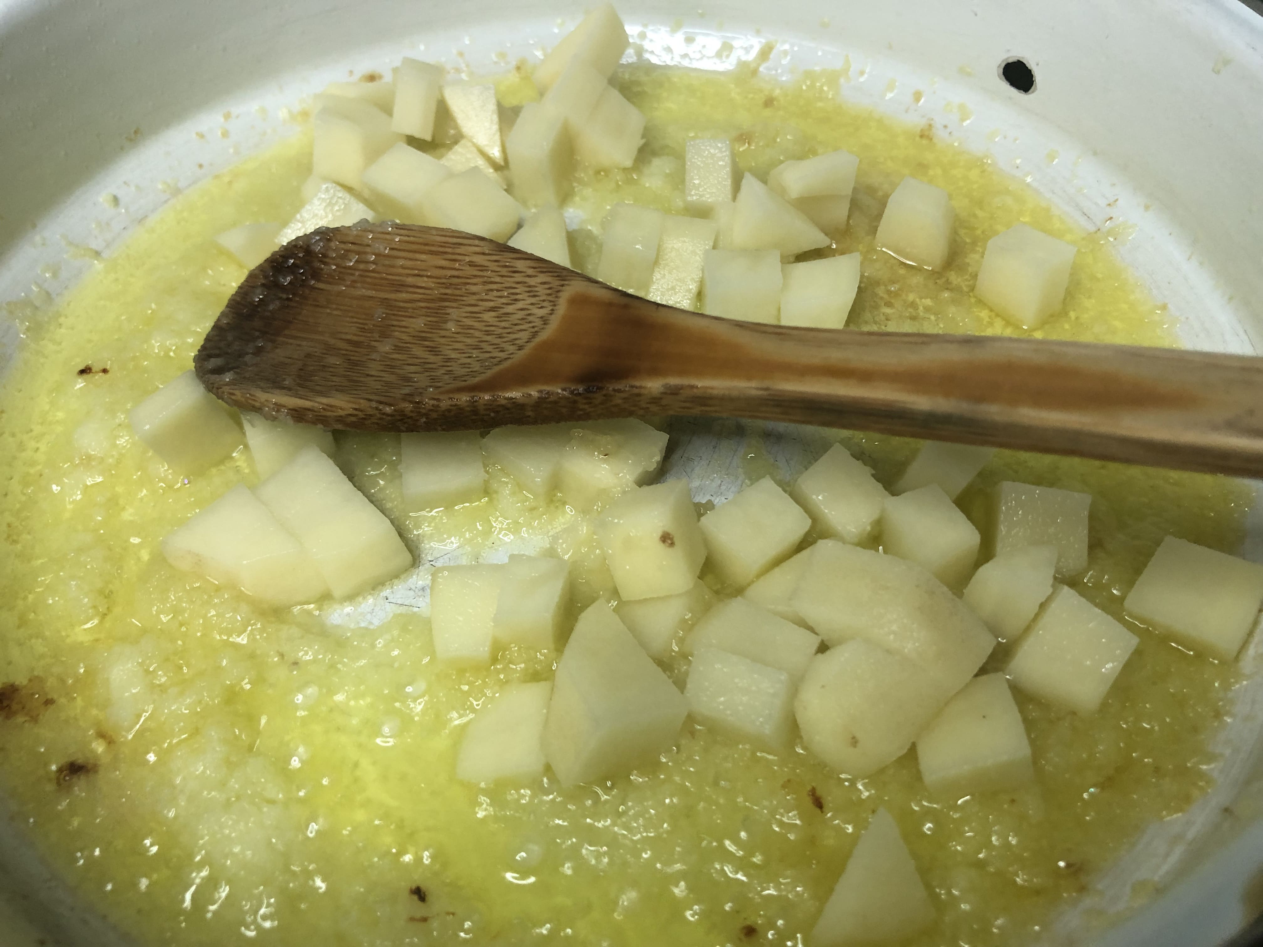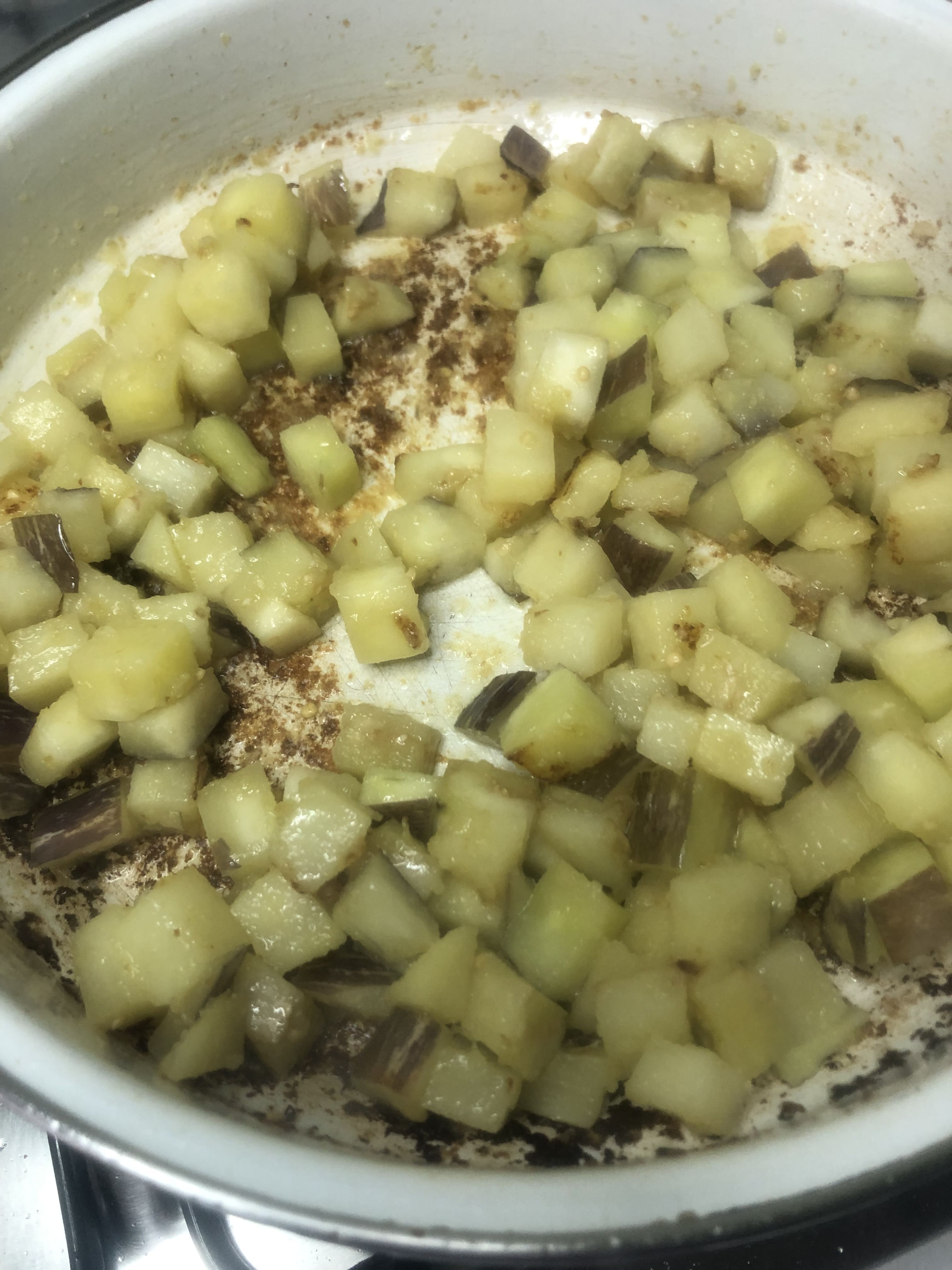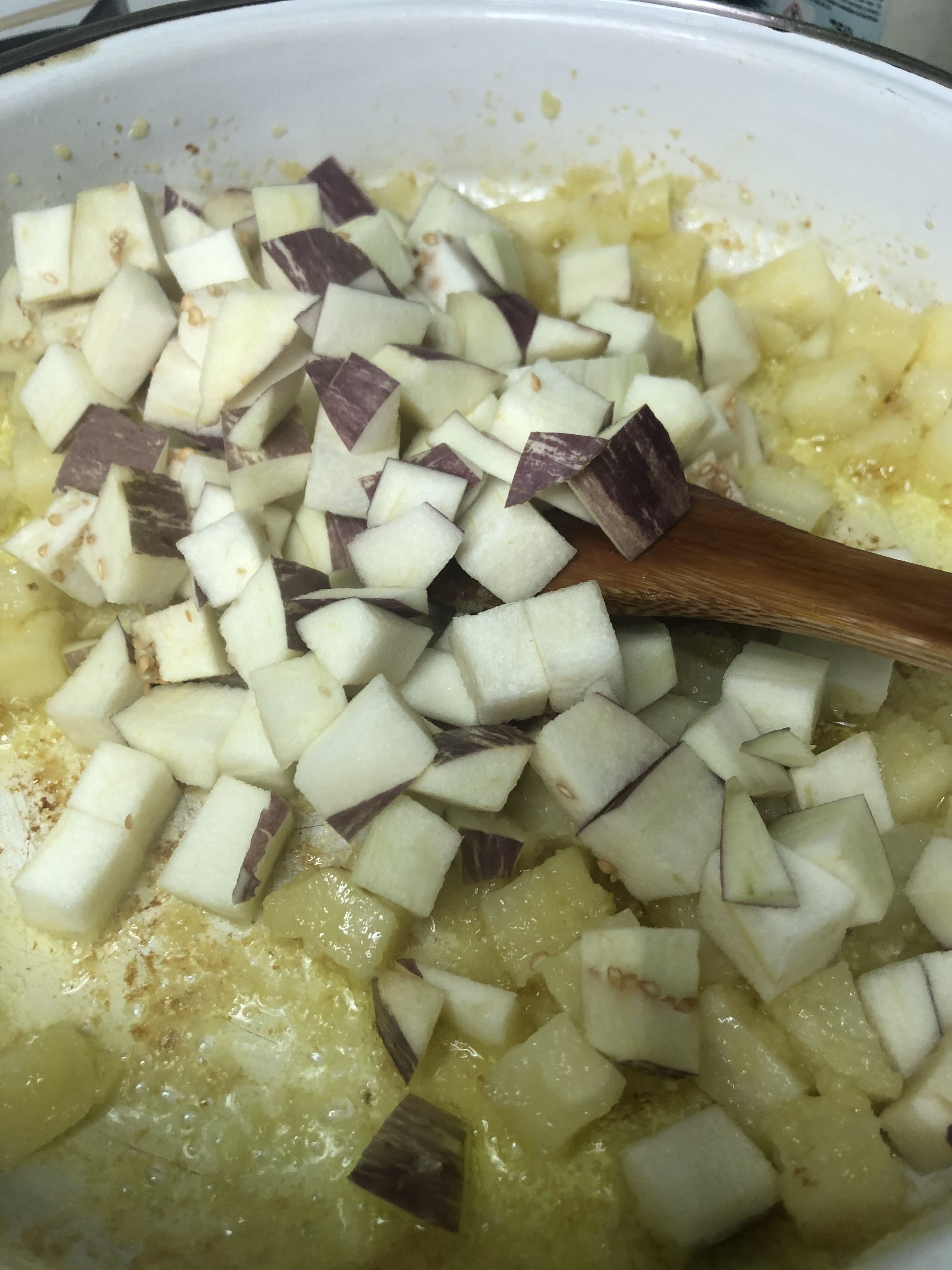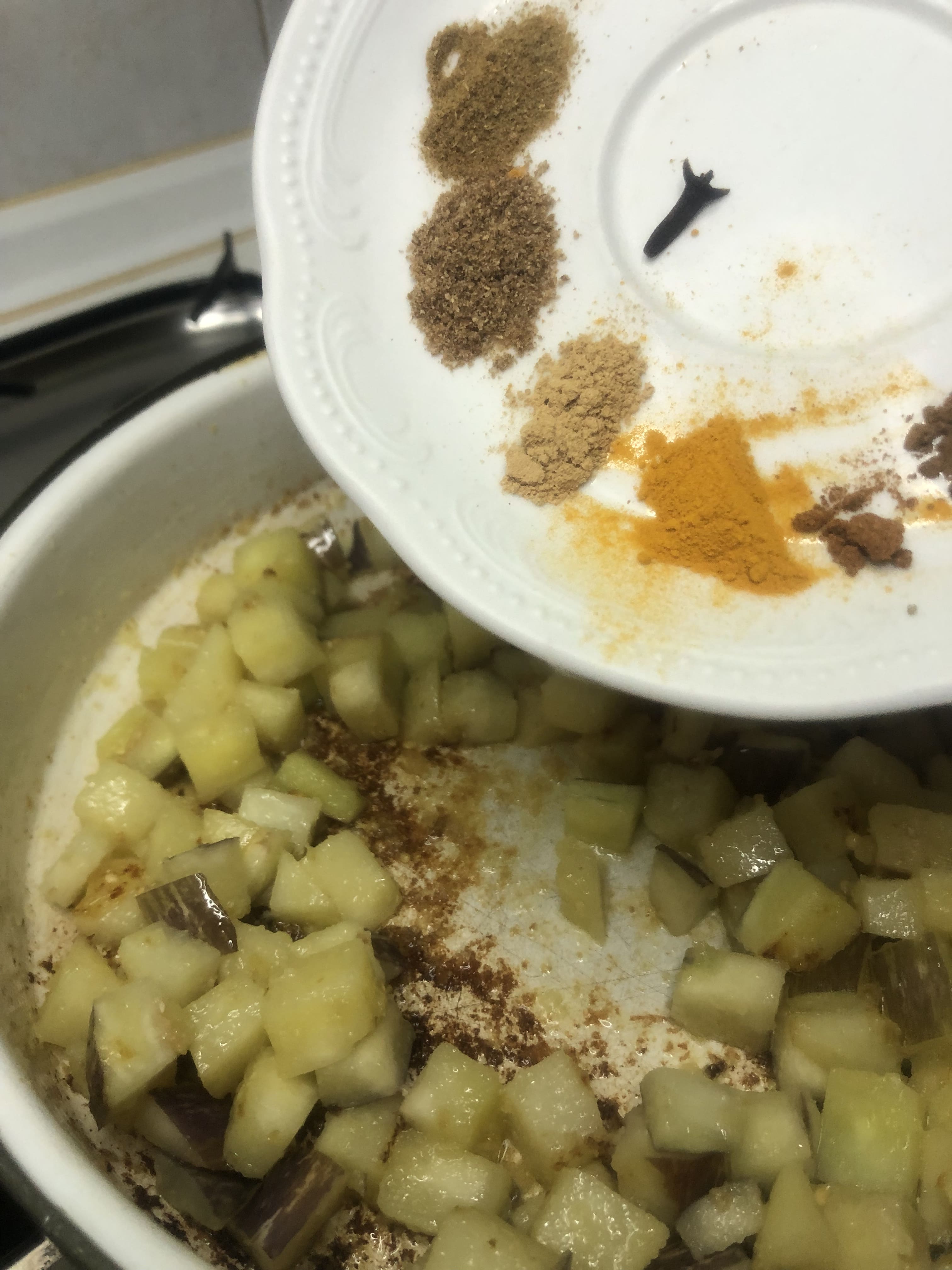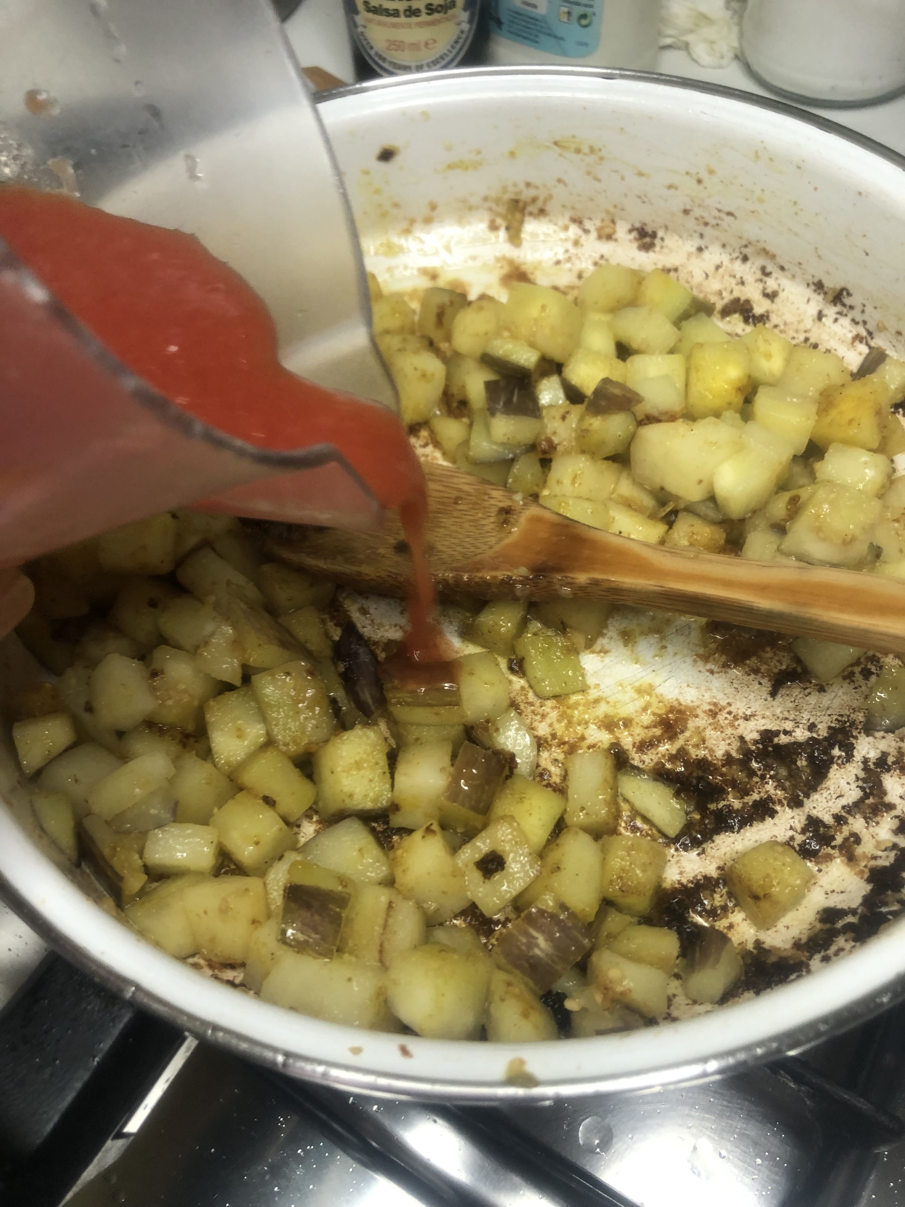 Calienta un poco de aceite en una cazuela y añade la pasta de cebolla y ajo. Cocina unos 3 minutos a fuego medio y agrega la patata. Cuando esté doradita, incorpora la berenjena y las especias.