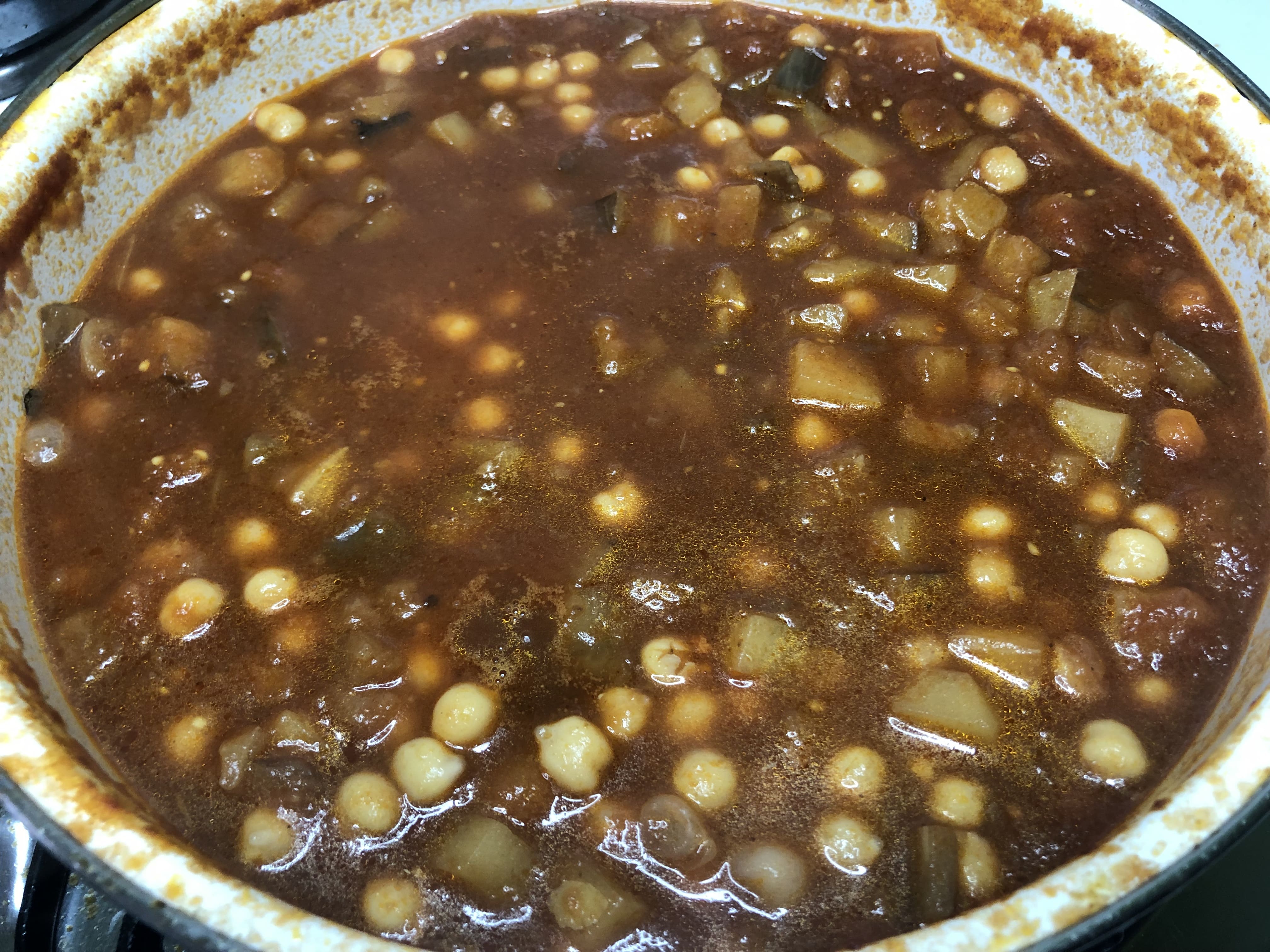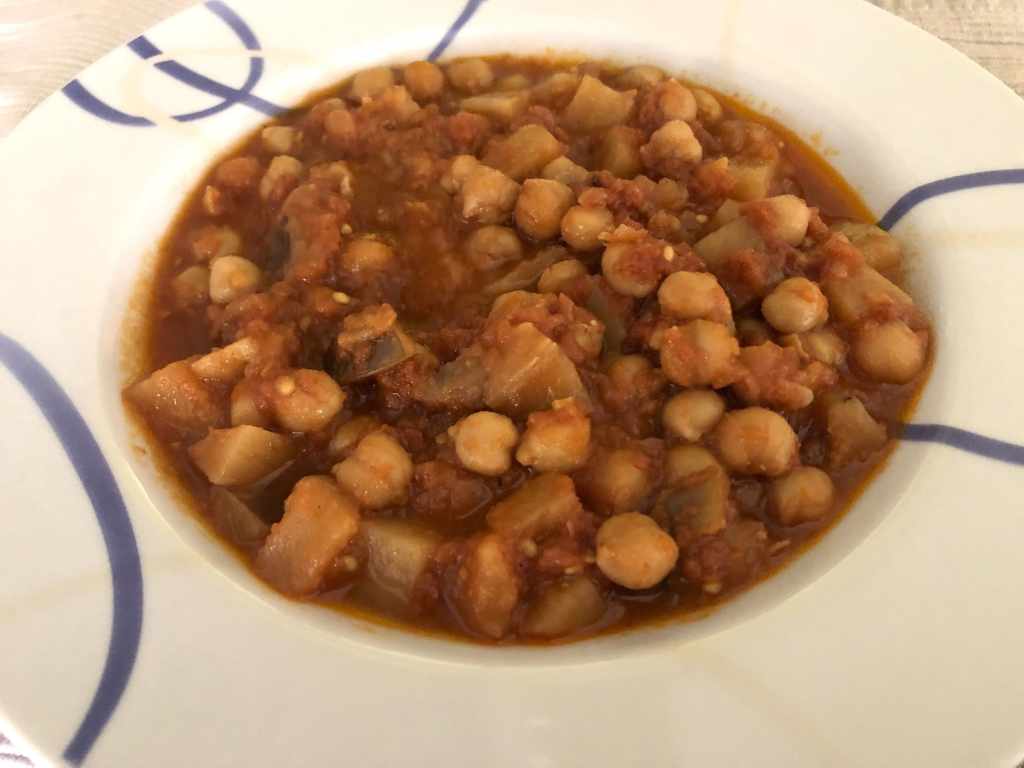 Mezcla todo bien, añade el tomate y cocina 5 minutos más. Agrega el agua, baja el fuego y cocina hasta que la patata y la berenjena estén listas. Cuando le falte poco para estar en su punto, incorpora los garbanzos.