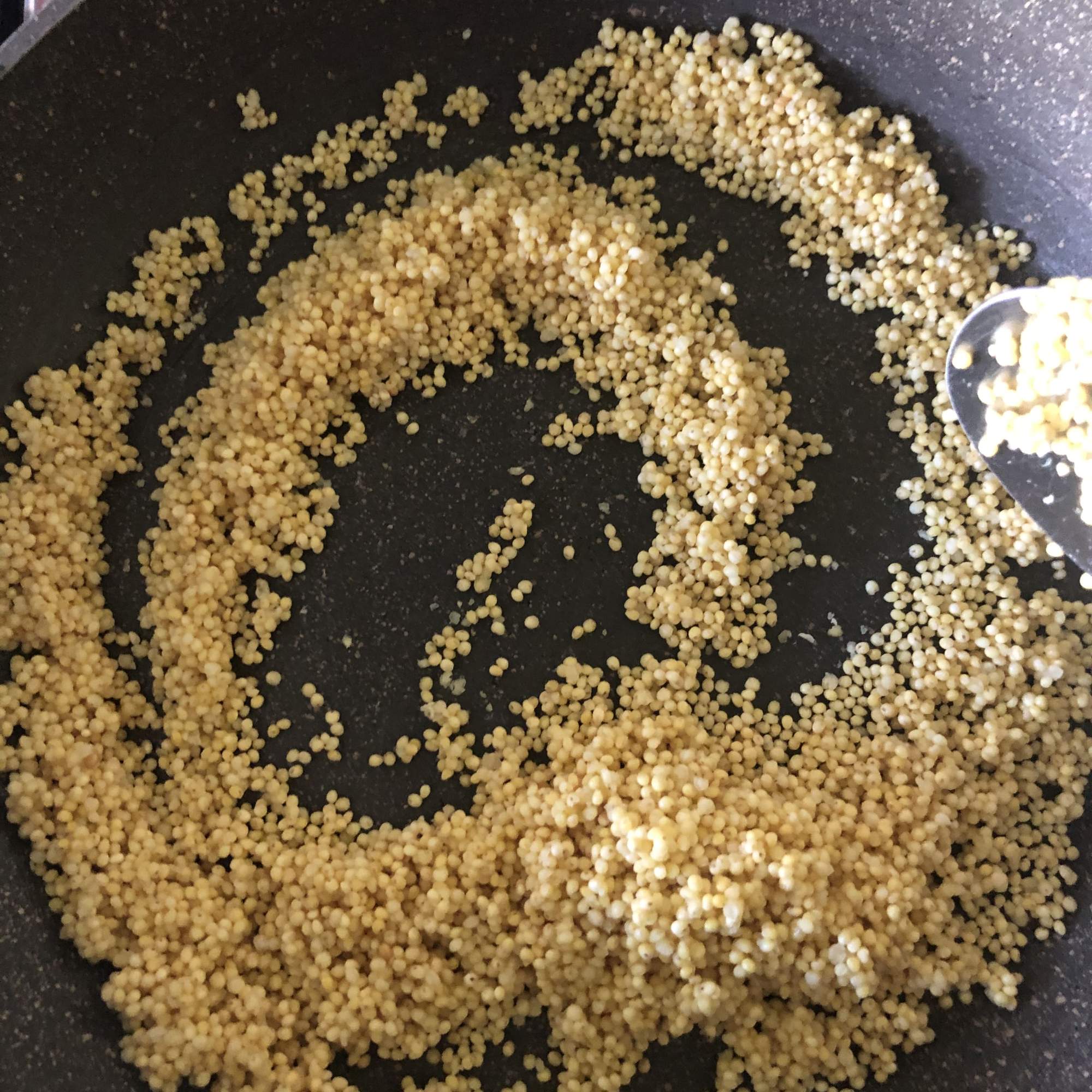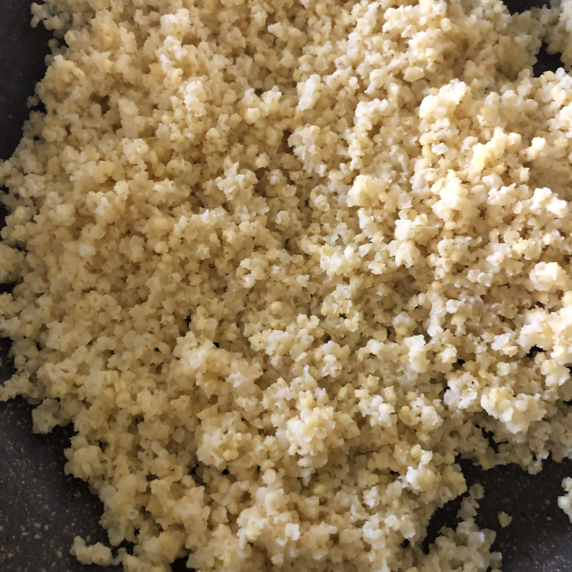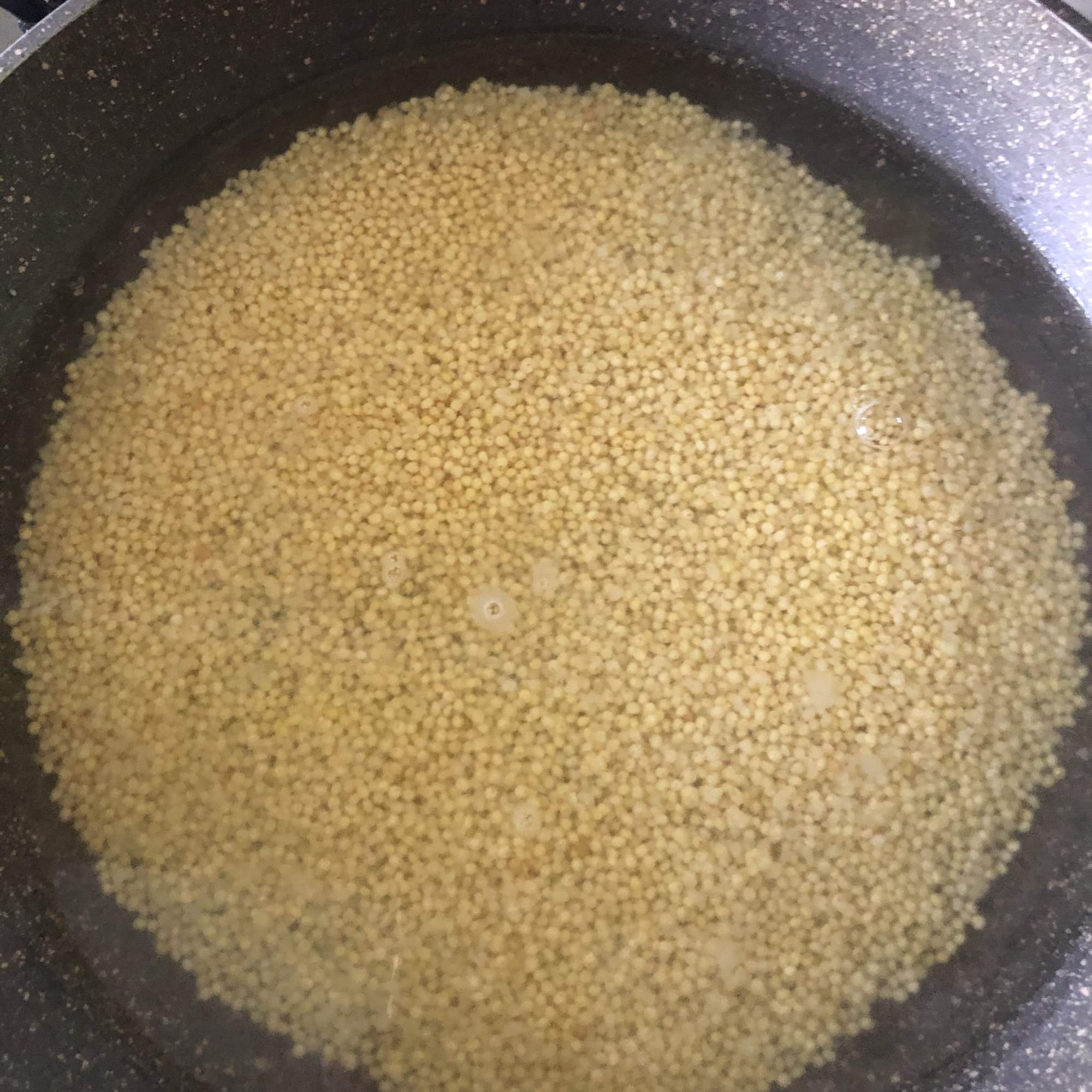 Mientras tanto lava bien el mijo con ayuda de un colador hasta que el agua salga clara. Vierte en una sartén sin aceite para que se sequen los granos (de esta manera quedarán sueltos al final) y se tuesten un poquito. Añade el agua y cuando empiece a hervir baja el fuego, cubre con una tapadera y cocina durante 20 minutos o hasta que haya absorbido toda el agua. Destapa, deja enfriar y separa con cuidado los granos.