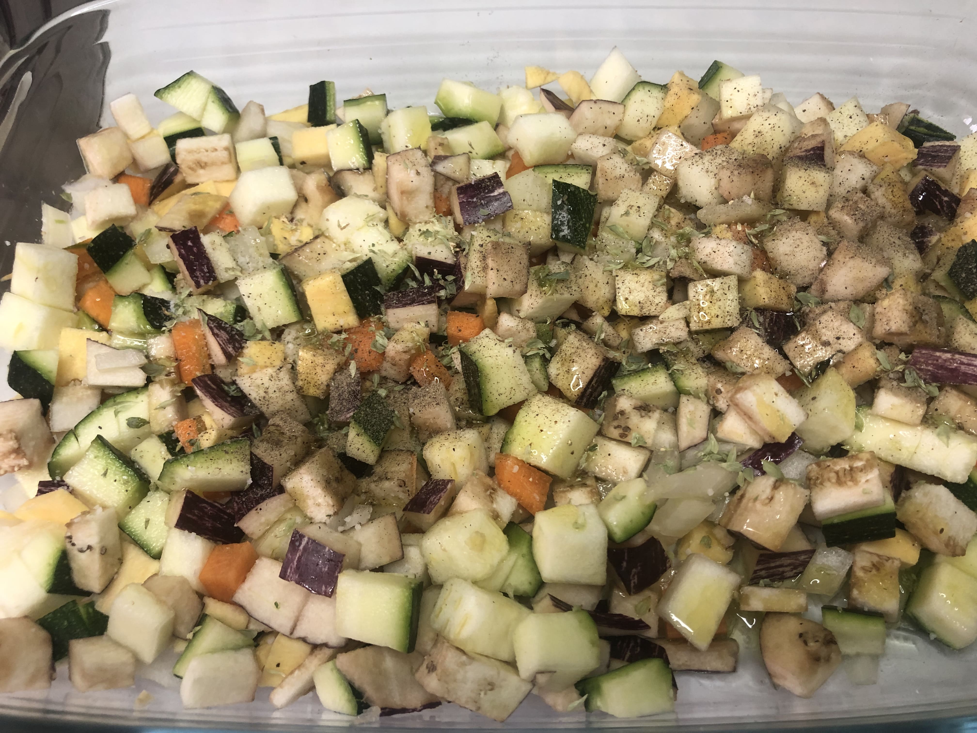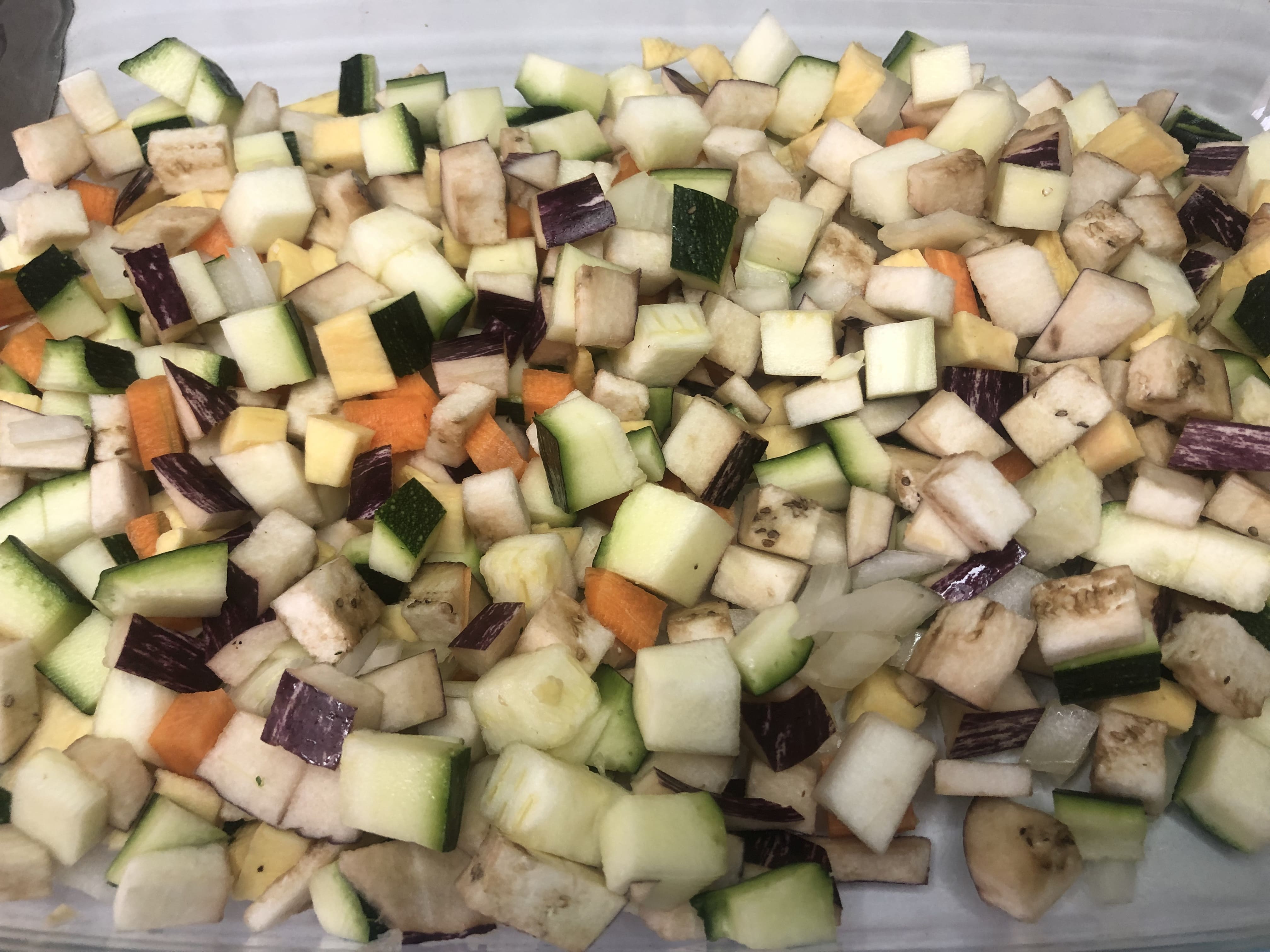 Precalienta el horno a 170ºC arriba y abajo. Lava el calabacín y la berenjena y corta en cubos pequeños. Pela la zanahoria y la batata y corta también en cubos. Corta la cebolla en juliana. Lava las espinacas y reserva.