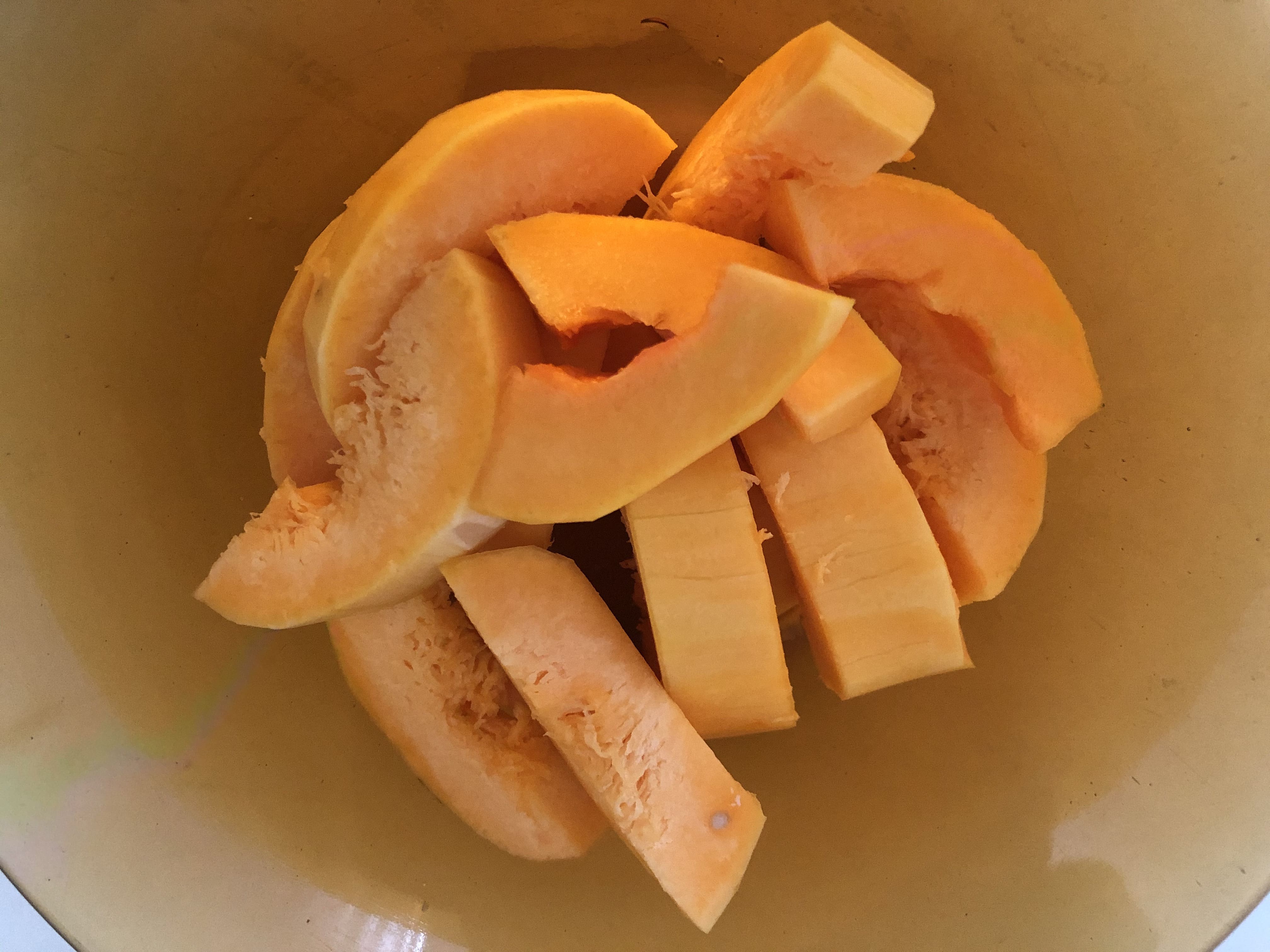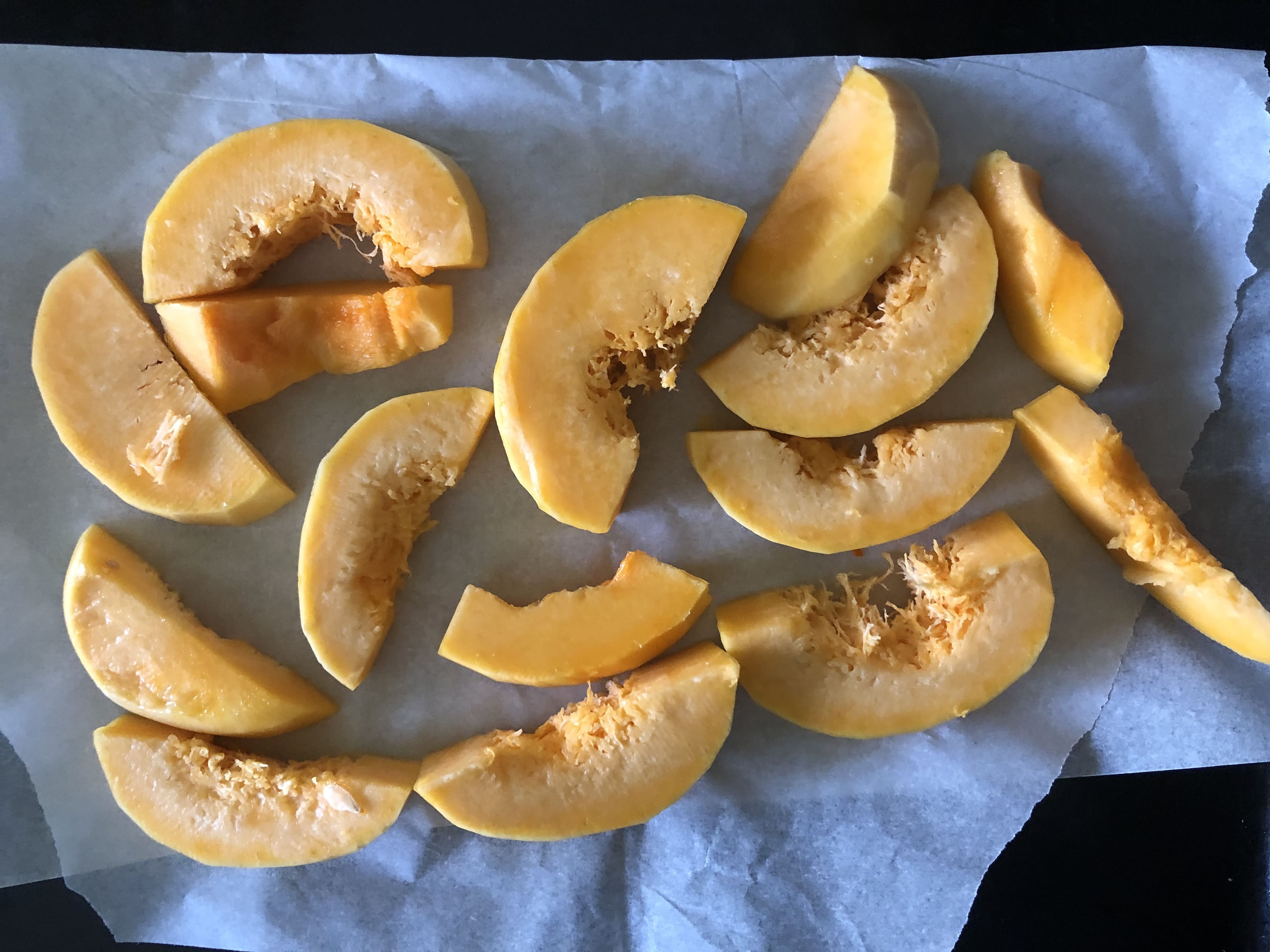 Precalienta el horno a 180ºC. Pela la calabaza y córtala en trozos pequeños. Pon la calabaza en una fuente o en la bandeja de horno, añade la sal y un chorrito de aceite de oliva y asa durante unos 30 minutos o hasta que esté tierna. Reserva.