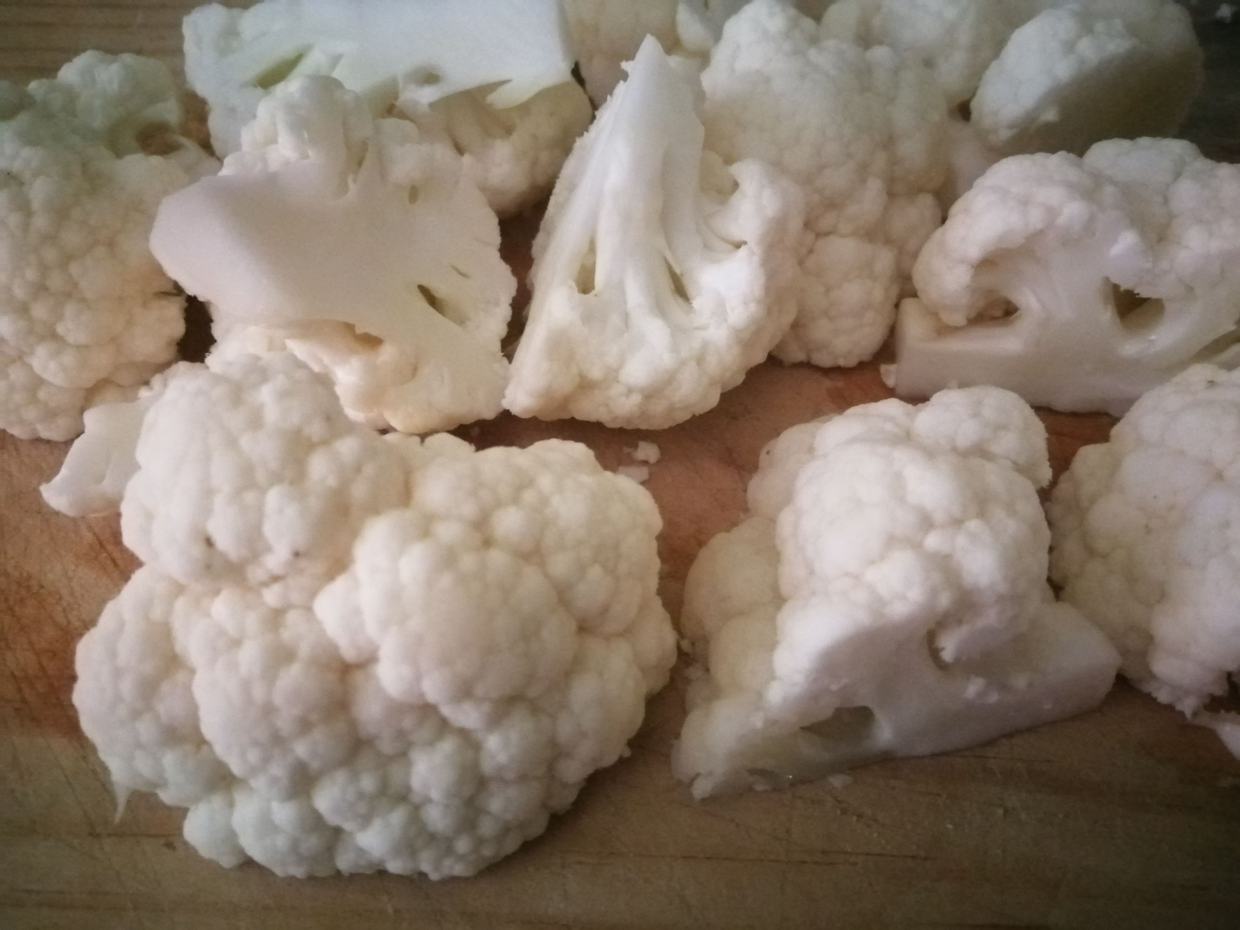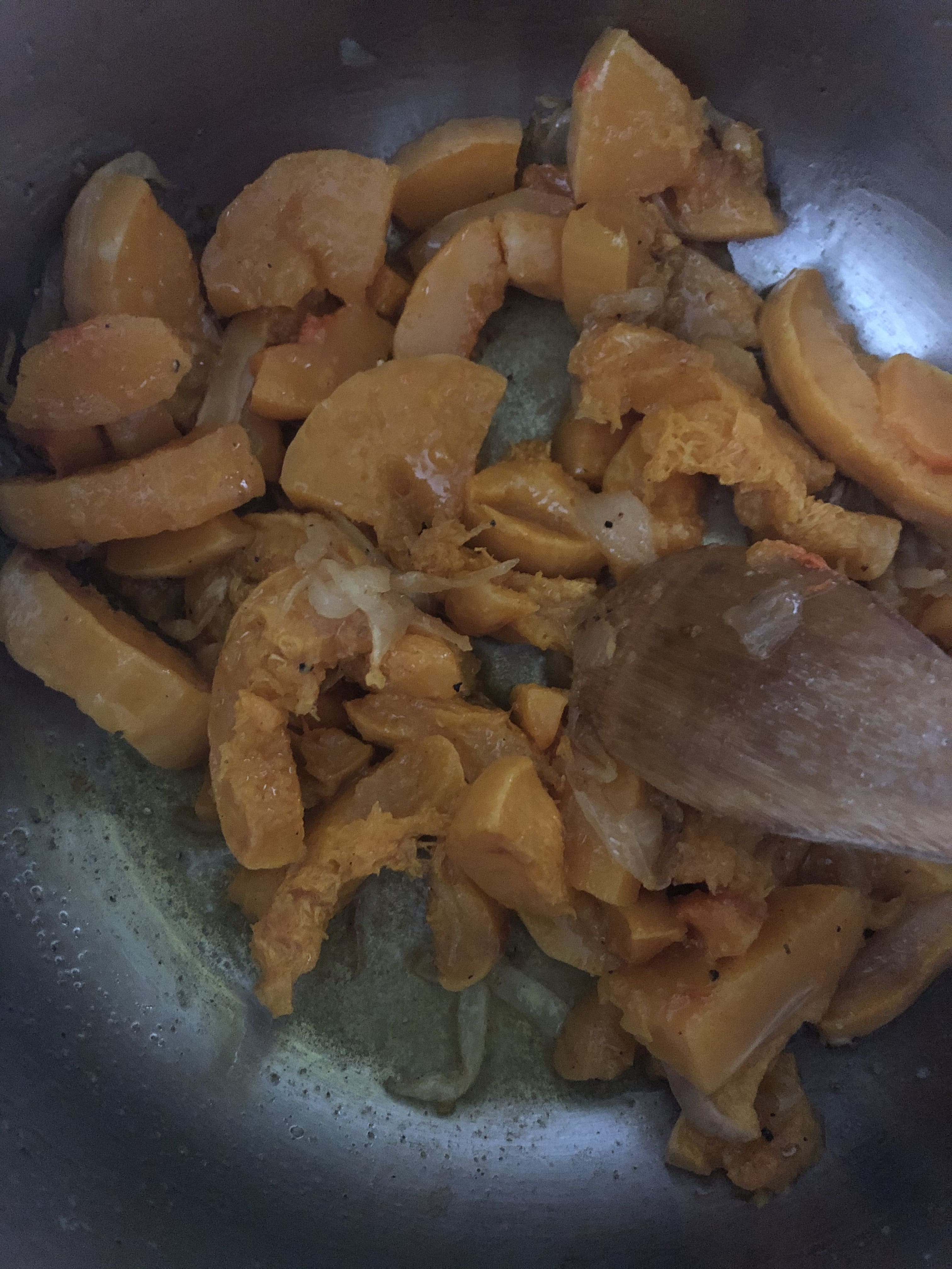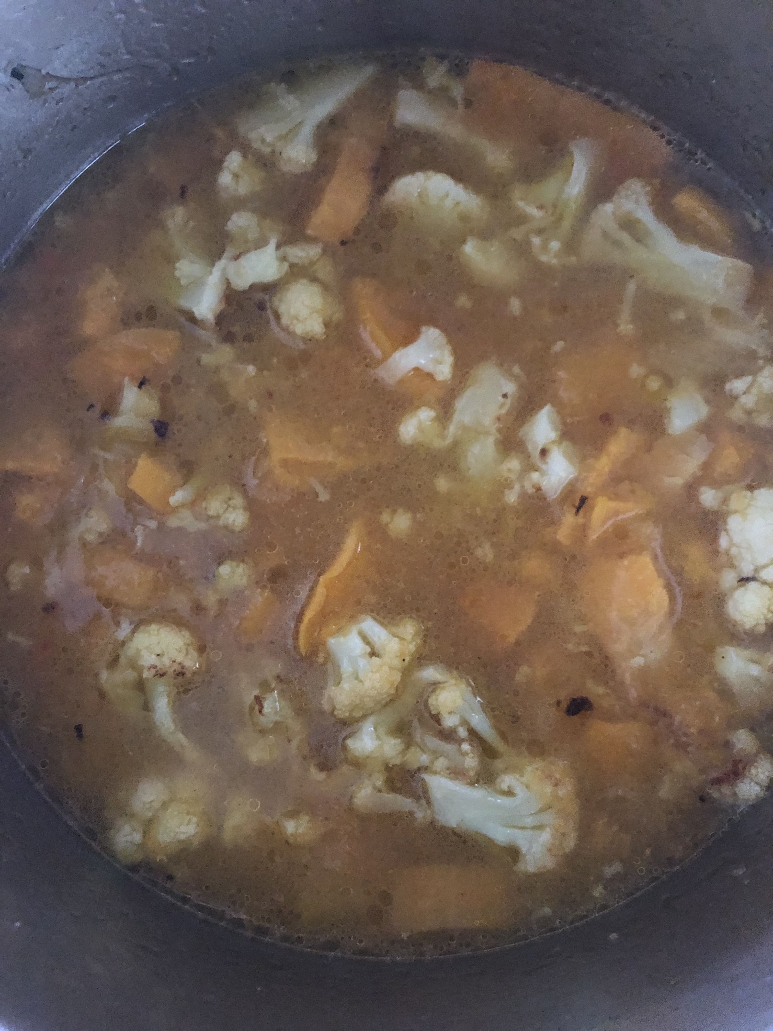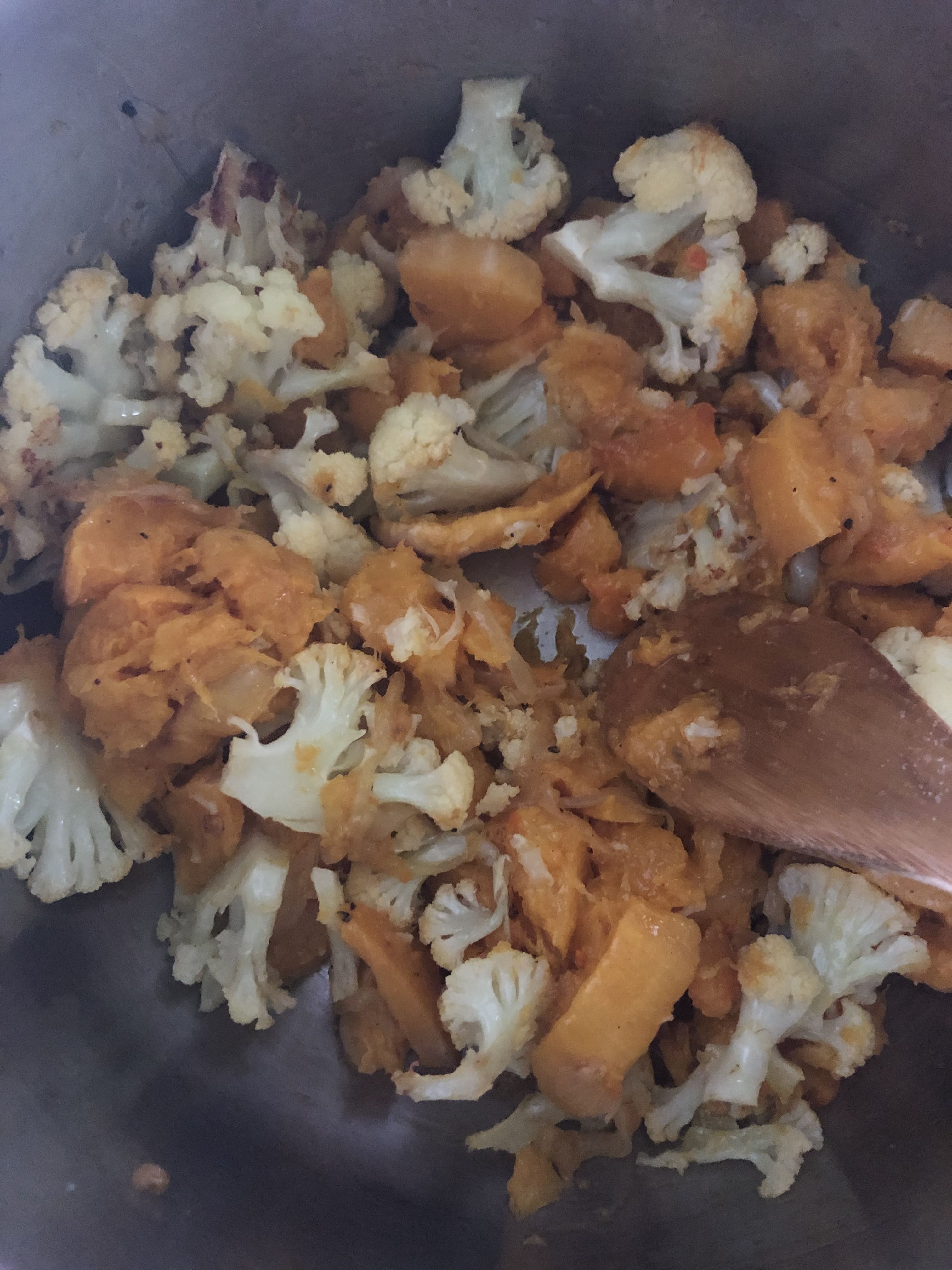 En una cazuela grande, vierte un poco de aceite y calienta a fuego lento. Corta la cebolla en juliana y cocina a fuego a lento. Cuando esté transparente, añade las especias (nuez moscada, jengibre y pimienta negra) y mezcla bien. Por último, agrega la calabaza, la coliflor y el agua y cuece a fuego alto durante unos 10 minutos.
