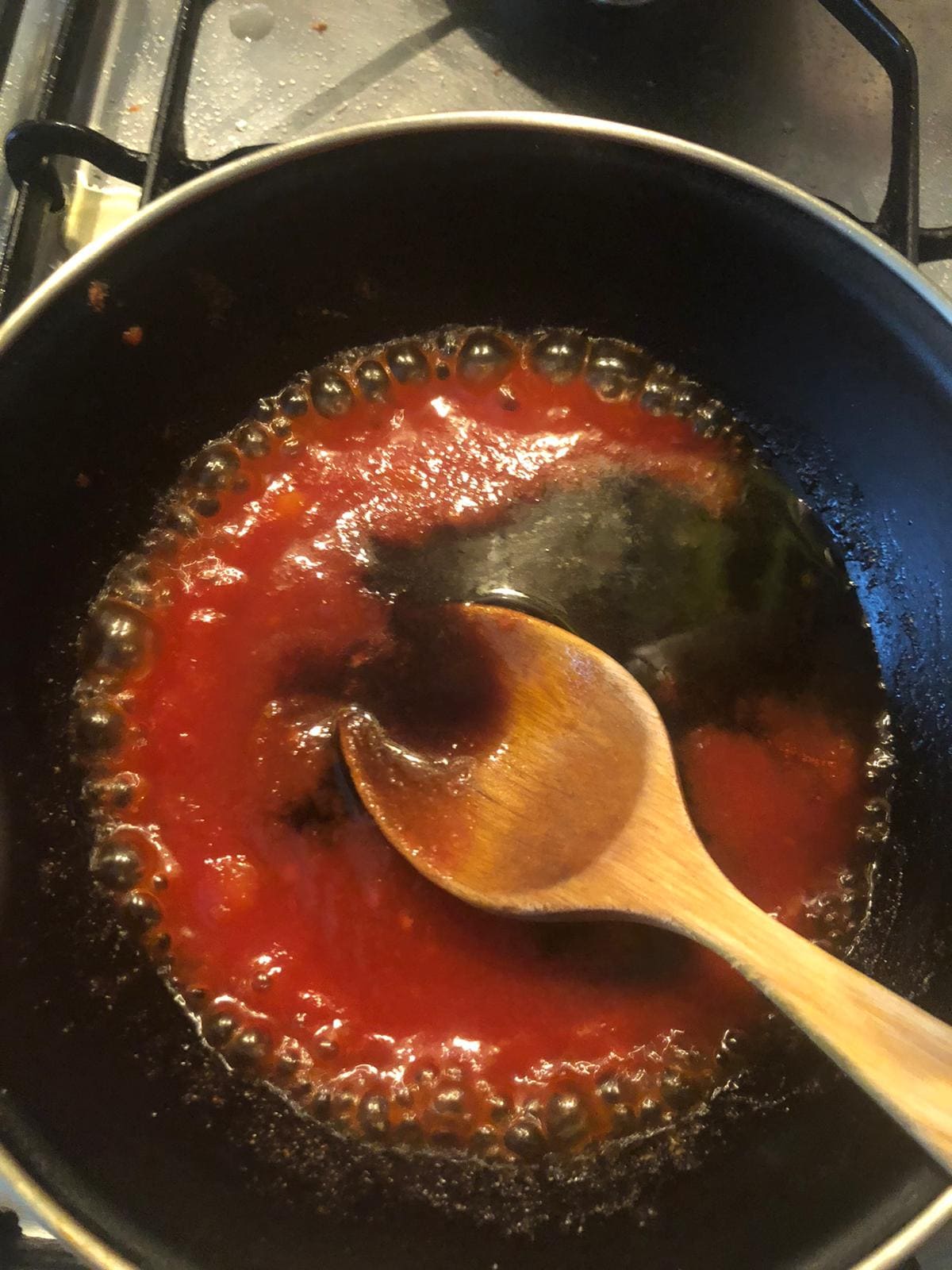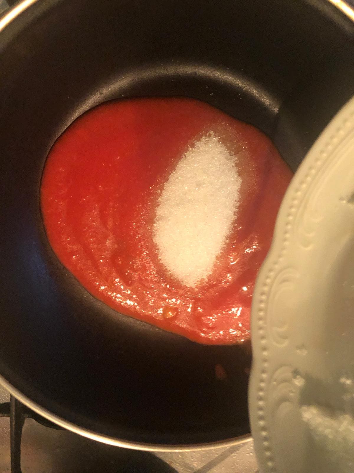 Prepara la salsa agridulce. Vierte el tomate frito en un sartén y calienta a fuego mínimo. Añade el azúcar y deja que caramelice (comienza con 2 cucharadas y ve agregando más hasta ajustar el sabor a tu gusto). Incorpora la salsa de soja y el vinagre y lleva a ebullición. Disuelve la maicena en el zumo de naranja y suma a lo anterior. Remueve hasta que comience a espesar (si te parece muy espeso puedes añadir agua).