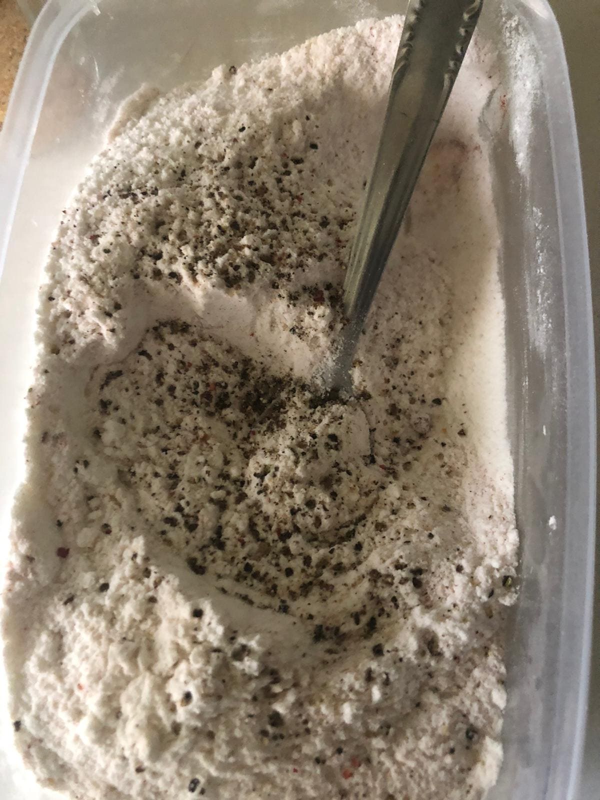 Prepara el rebozado. Mezcla la harina con las especias: ajo molido, pimentón, pimienta y sal e integra. Añade el agua y mezcla todo bien. Debe quedar una masa un poco espesa, pero que pueda manipularse.