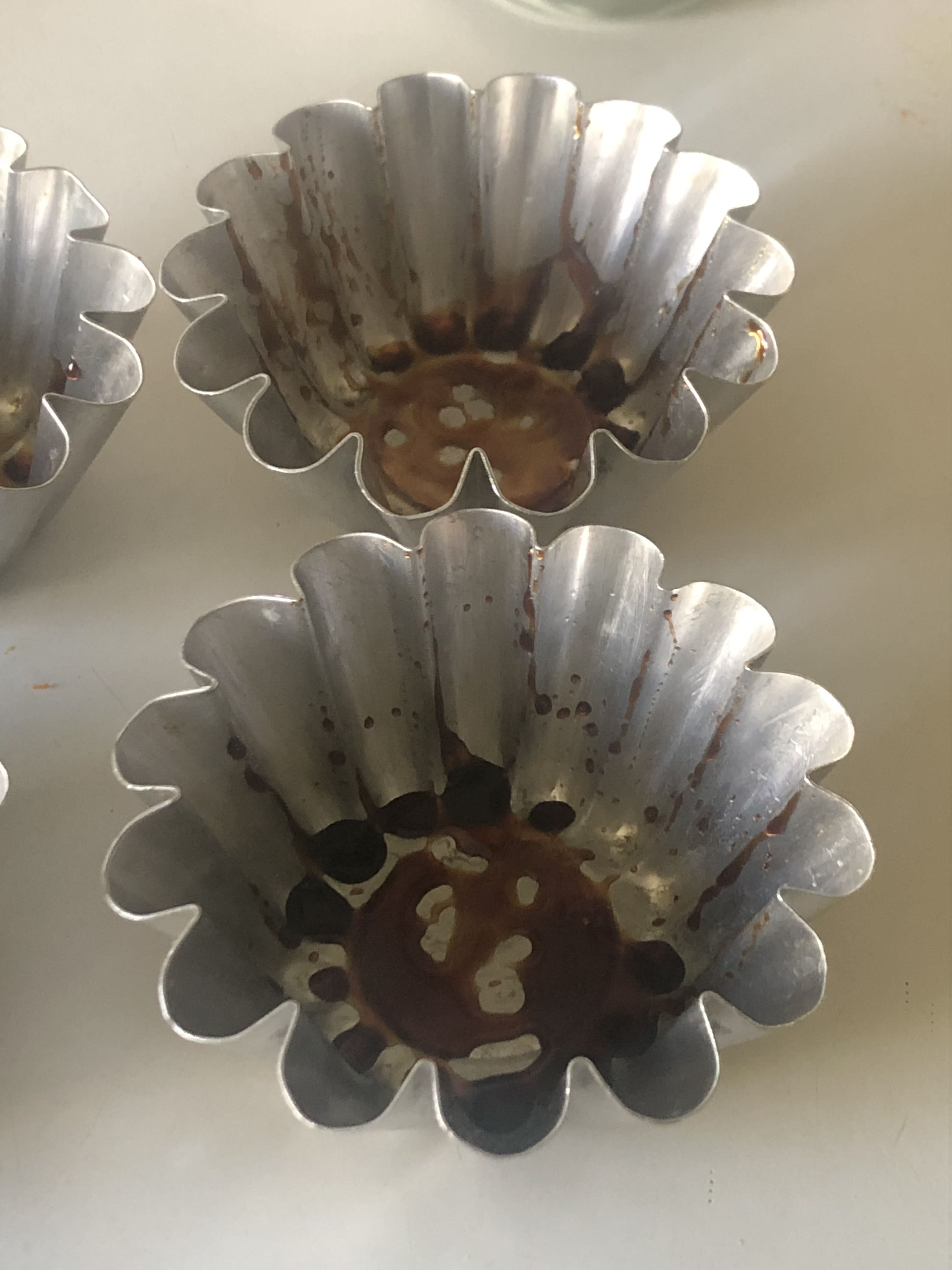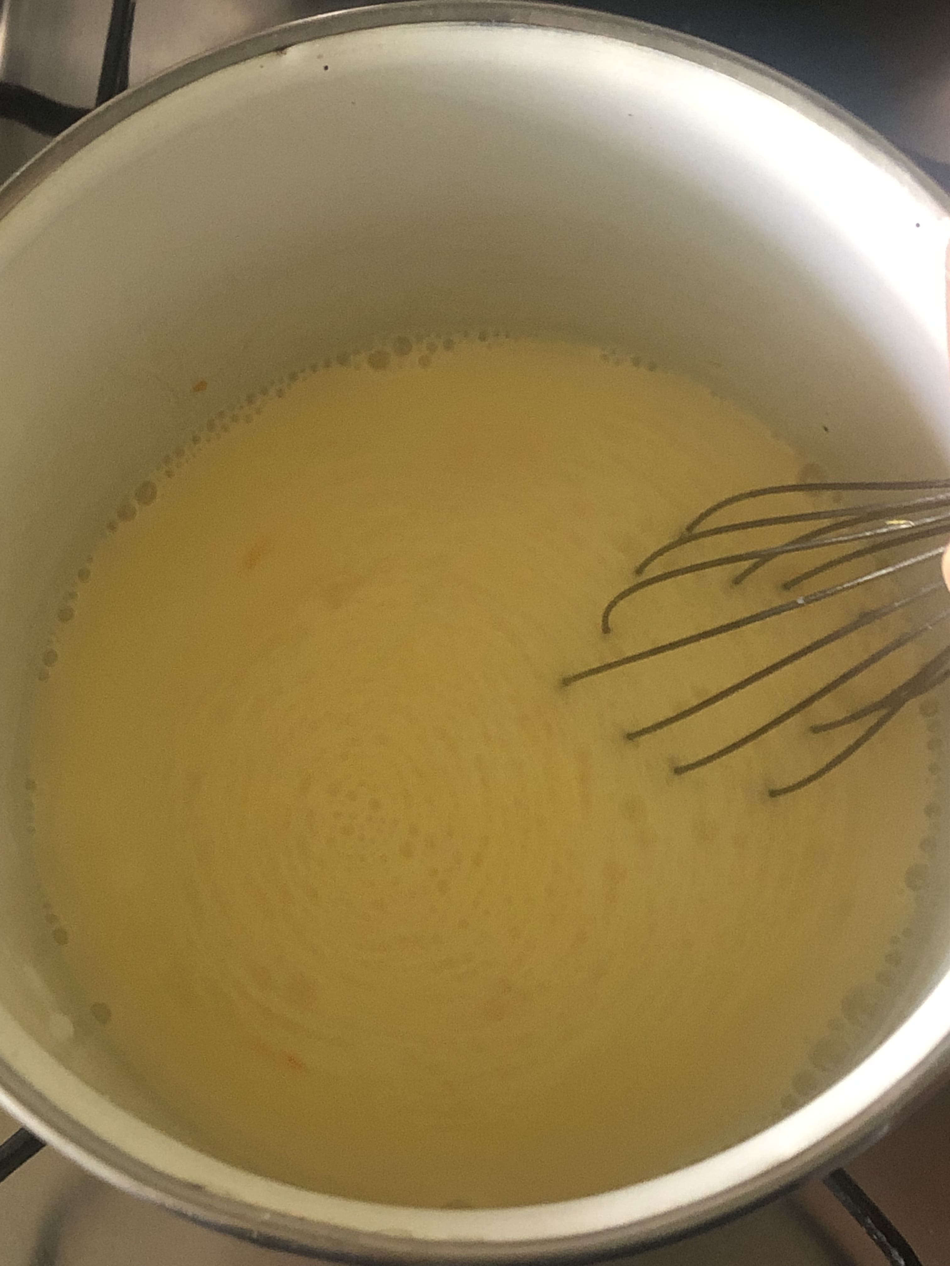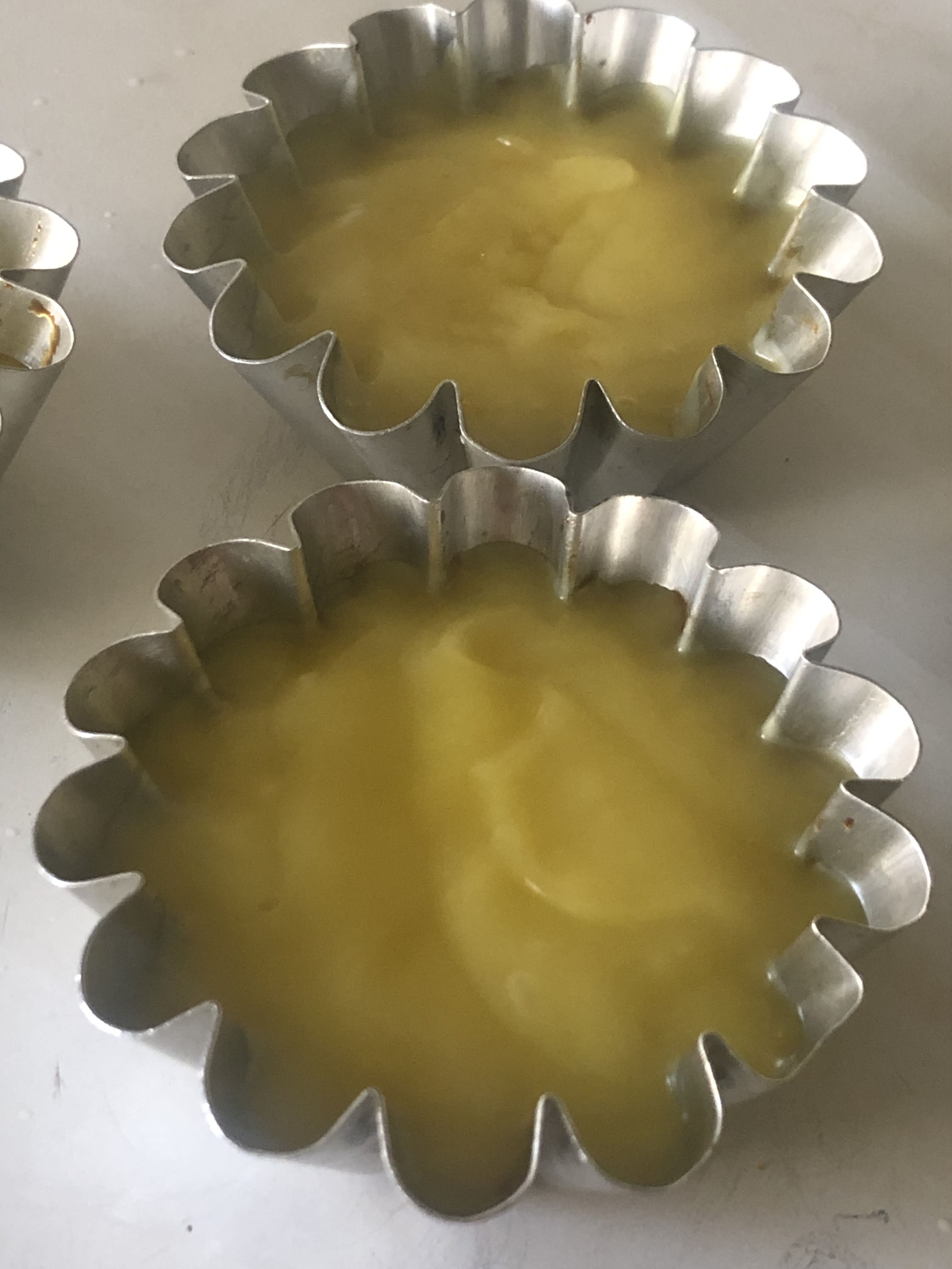 Disuelve la maicena en la bebida de almendras. Vierte el caramelo en las flaneras.